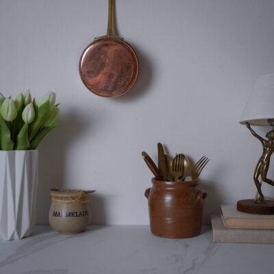 Det er synd at lade dit fine bestik ligge gemt væk i en skuffe; det skal vises frem og være en del af selve køkken indretningen. Du kan også stille en bestik krukke på spisebordet, så bestikket altid er lige ved hånden til måltiderne. Det er med til at give indretningen personlighed, og der findes mange fine vintage krukker i både keramik og porcelæn med enkle striber, blomstermotiver og mønstre. Eller de skønne små krukker med “bestik” skrevet på krukken eller i selve glasuren; de er ret fine på spisebordet. Du finder et udvalg af forskellige vintage krukker til bestik på min webshop i forskellige størrelser alt efter om du ønsker opbevaring til meget eller lidt bestik – eller til lidt større køkkenredskaber.