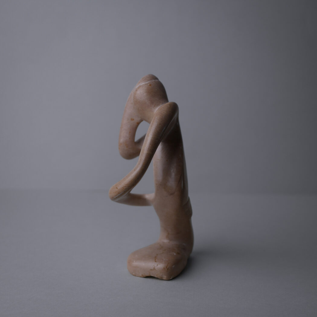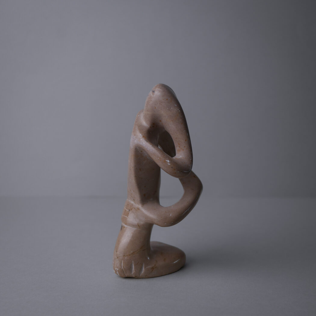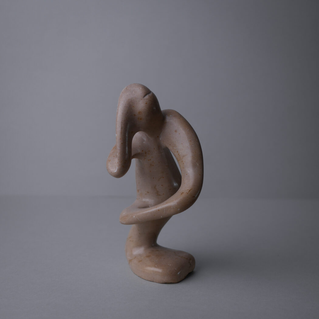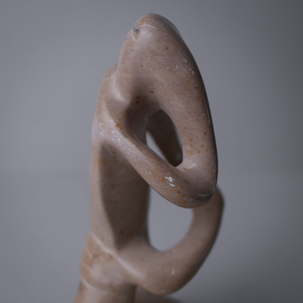 En smuk abstrakt beige fedtstensfigur – en person i dybe tanker måske. Et dekorativt element til dit stilleben. Figuren har et lille nag bagpå og mindre skrab hist og her. Den er fundet i Sverige.