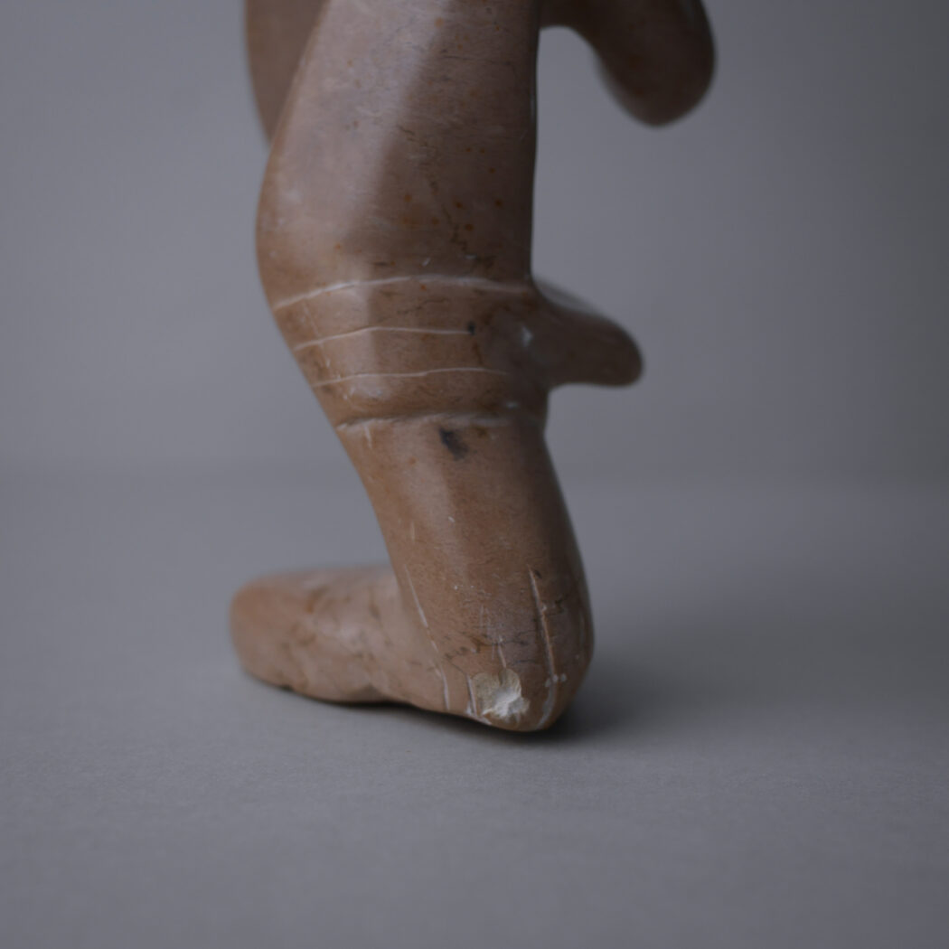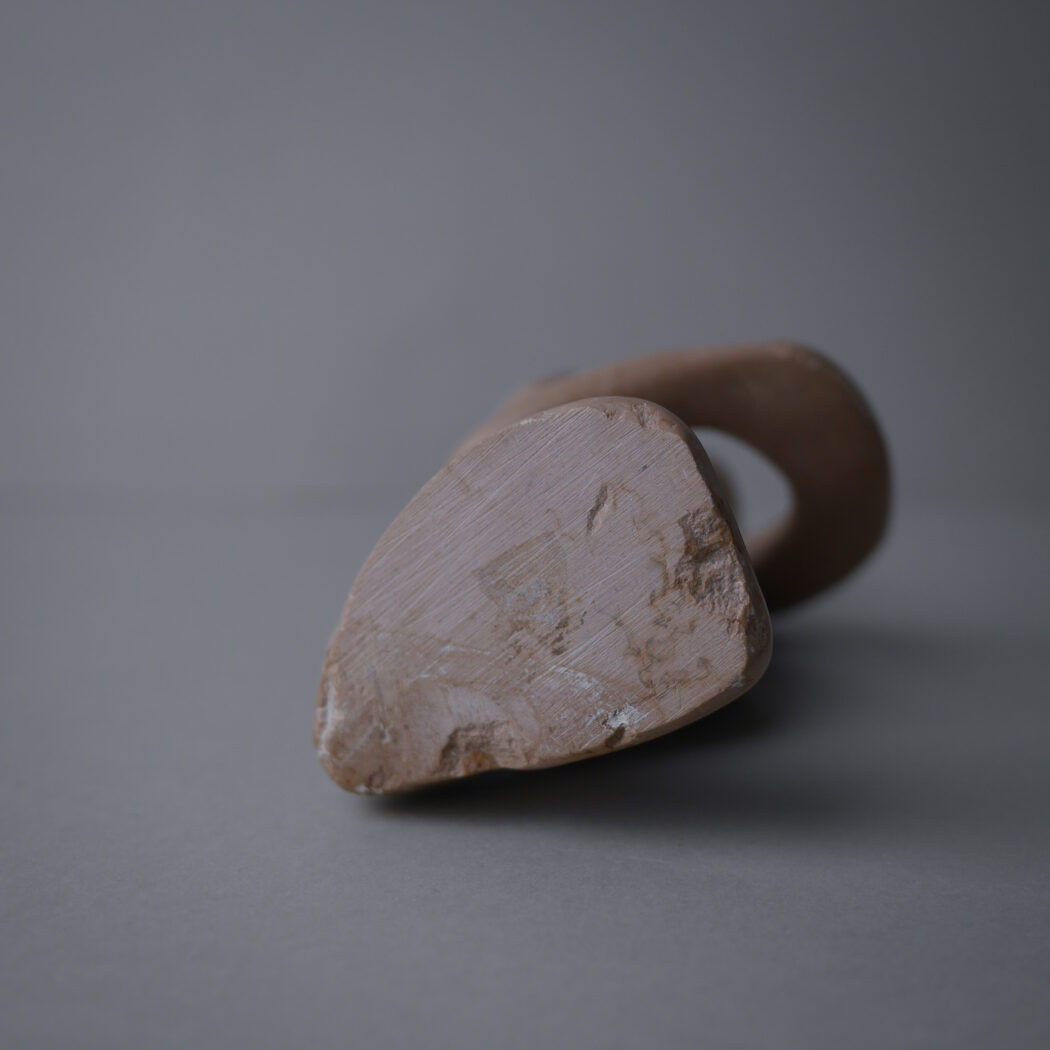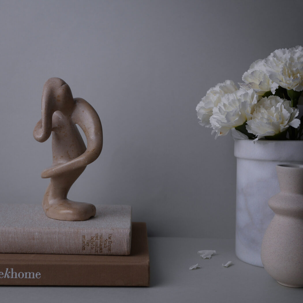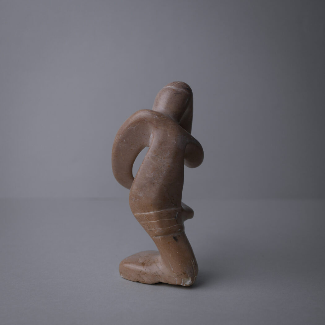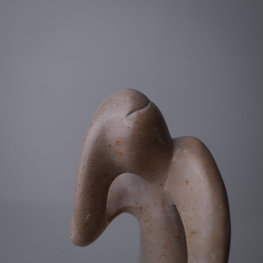 En smuk abstrakt beige fedtstensfigur – en person i dybe tanker måske. Et dekorativt element til dit stilleben. Figuren har et lille nag bagpå og mindre skrab hist og her. Den er fundet i Sverige.