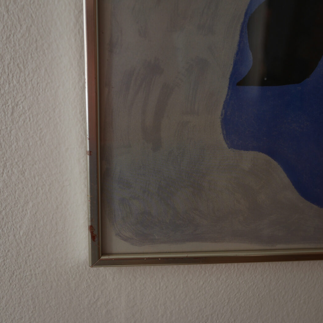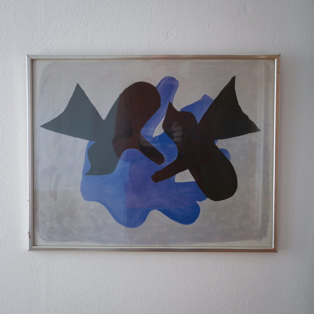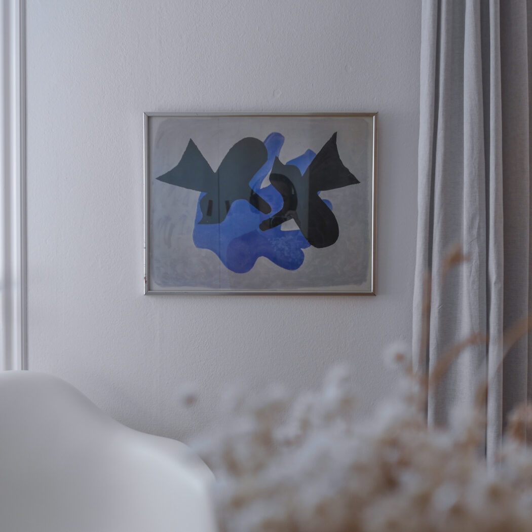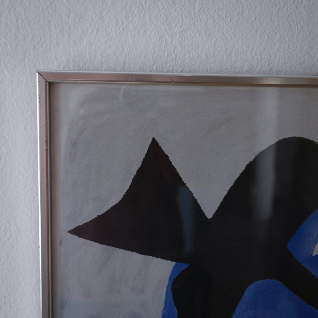 En abstrakt plakat i sorte og blå nunacer på en støvet grå baggrund. Jeg synes det ligner to sorte fugle, men det er nok en individuel ting. En super cool plakat i flot farvesammensætning. God til en billedvæg. Fundet i Sverige.