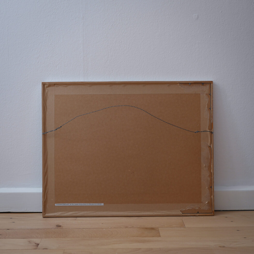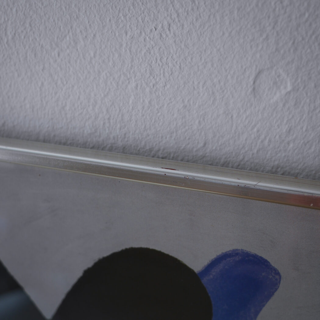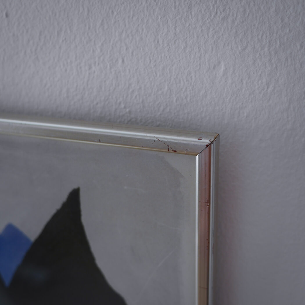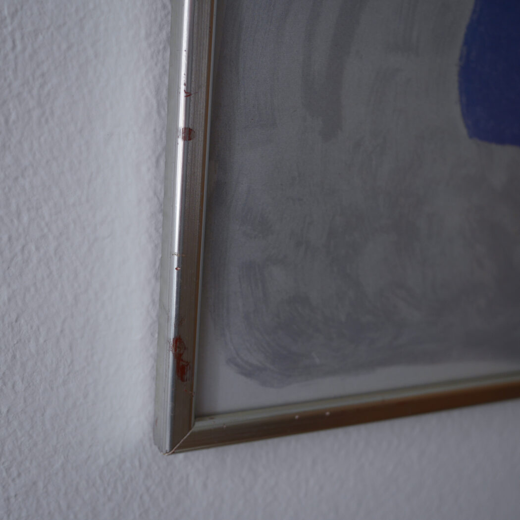 En abstrakt plakat i sorte og blå nunacer på en støvet grå baggrund. Jeg synes det ligner to sorte fugle, men det er nok en individuel ting. En super cool plakat i flot farvesammensætning. God til en billedvæg. Fundet i Sverige.