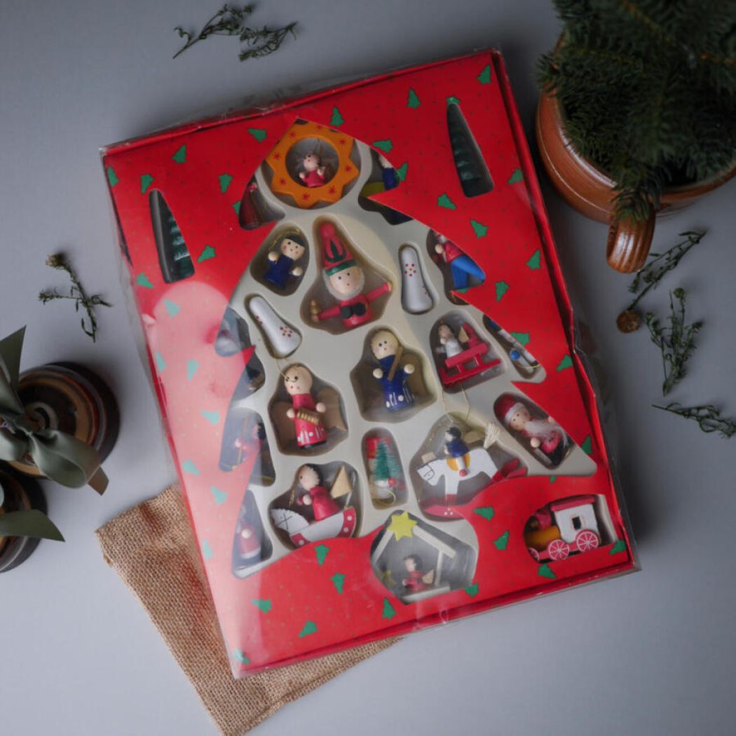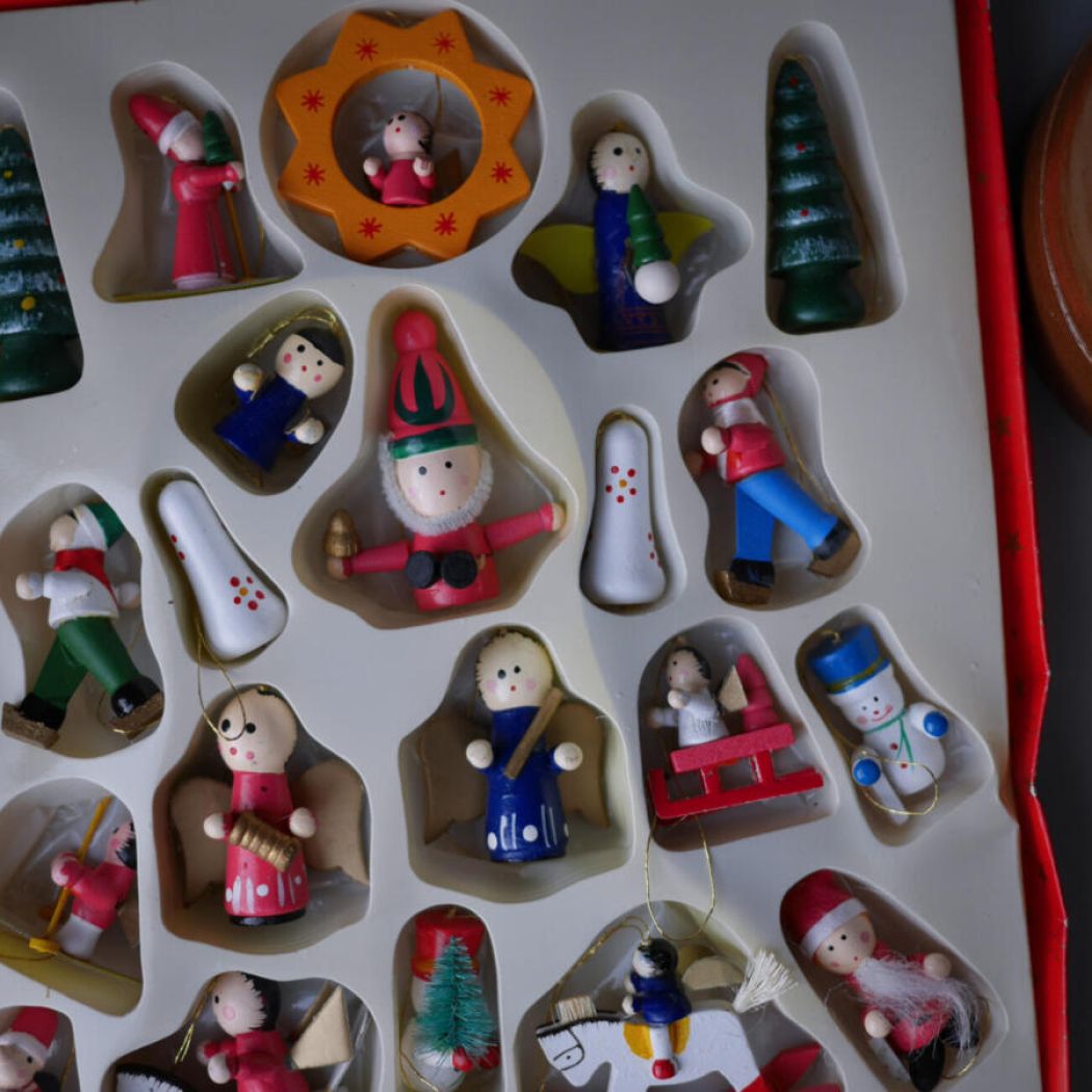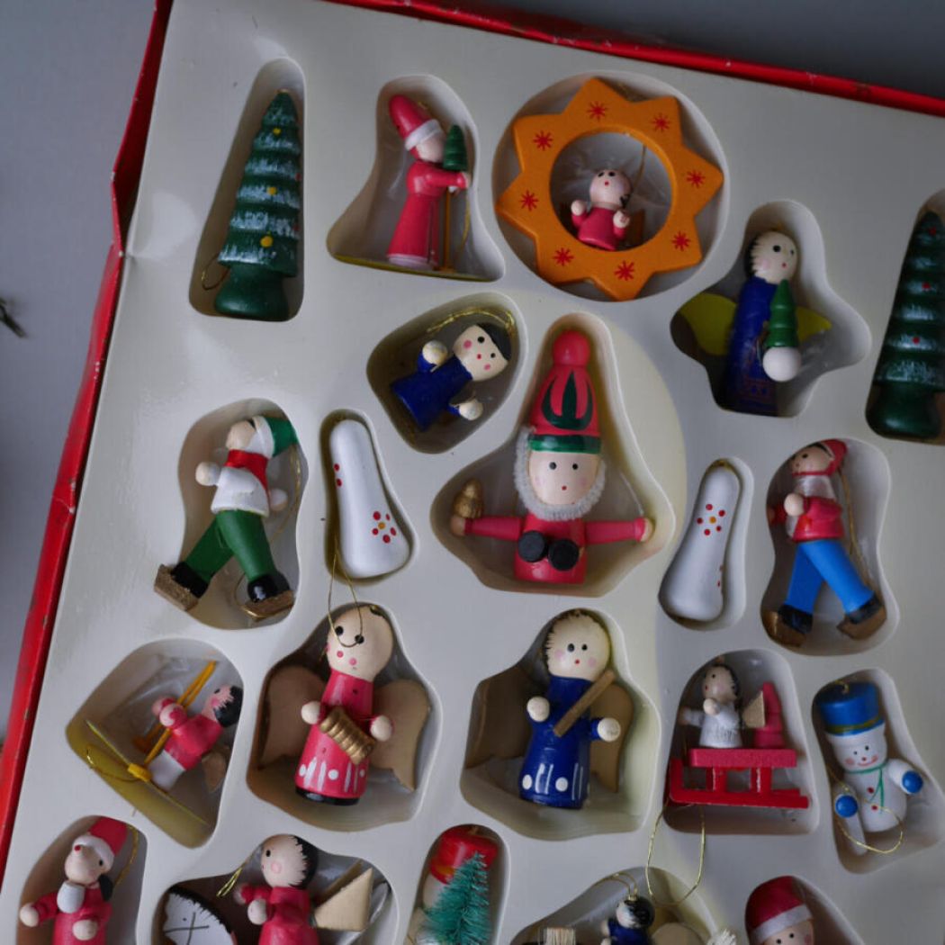 En æske med fint vintage juletræspynt i træ. Små søde julede og eventyrlige figurer fra Amsterdam, som vil give juletræet et ægte julet retro look, gammeldags jul er aller bedst. 24 dele, sælges samlet.