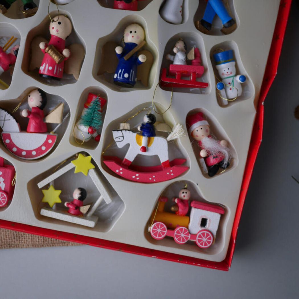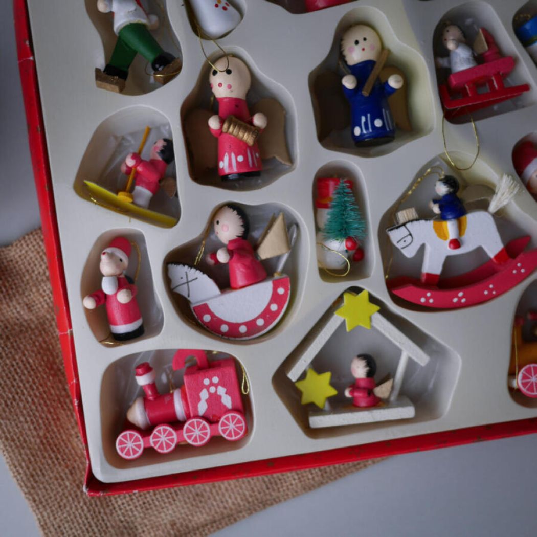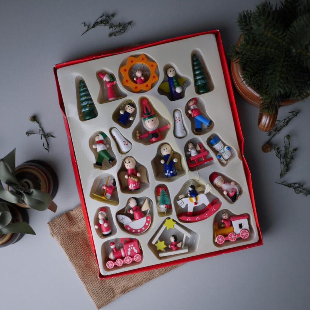 En æske med fint vintage juletræspynt i træ. Små søde julede og eventyrlige figurer fra Amsterdam, som vil give juletræet et ægte julet retro look, gammeldags jul er aller bedst. 24 dele, sælges samlet.
