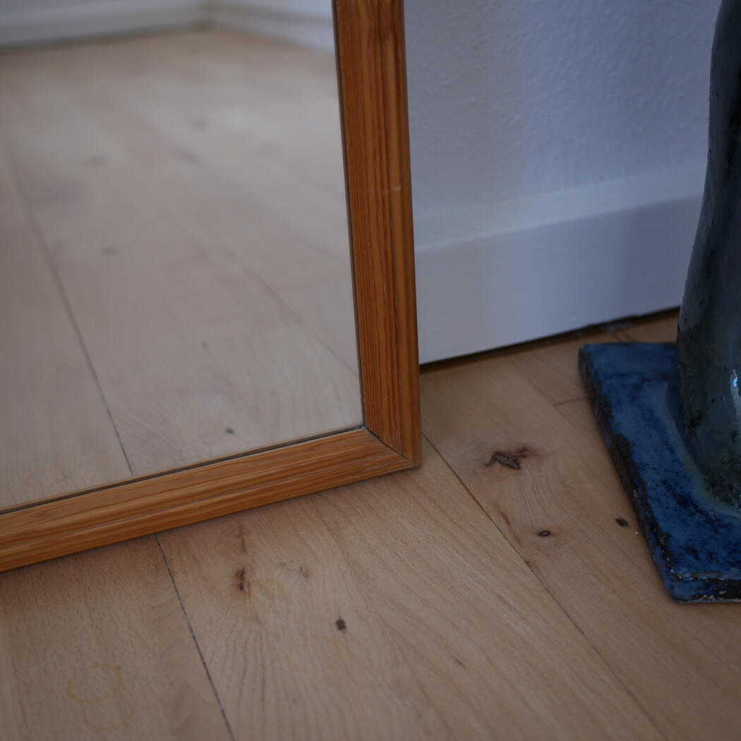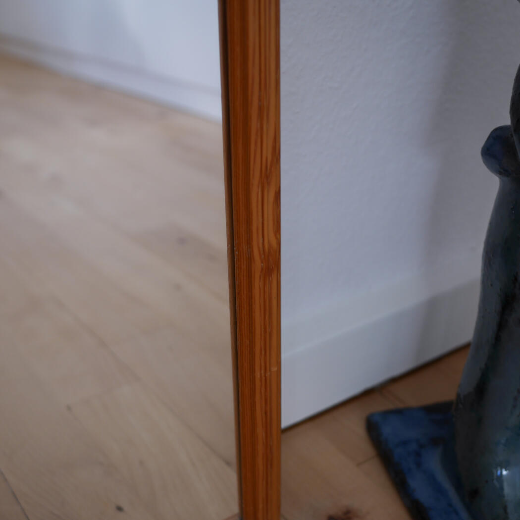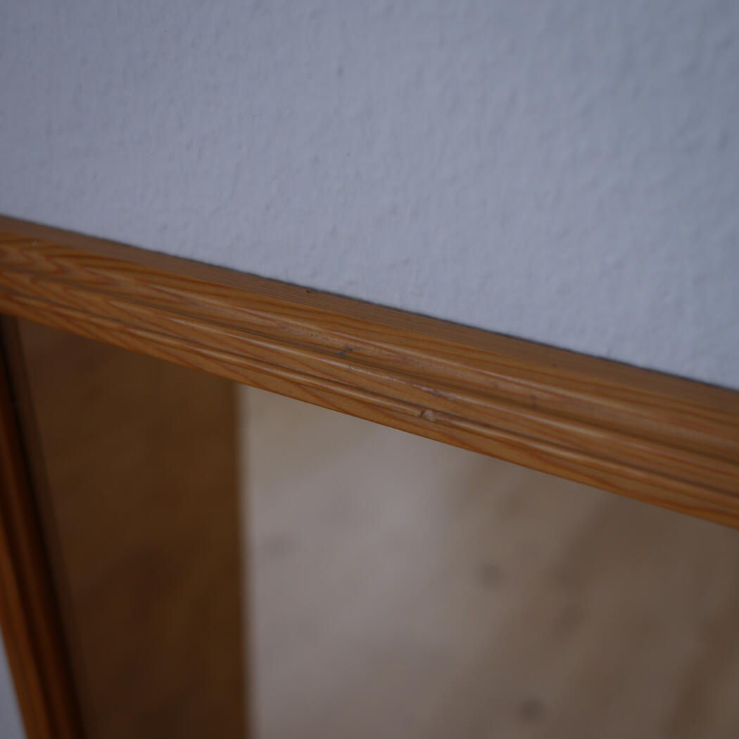 Et fint og enkelt aflangt spejl med fyrretræsramme. Rammen har over tid fået den helt rigtige farve. Rammen har desuden flotte og enkle udskæringer, som giver god dybde. Spejlet er fundet i Sverige.