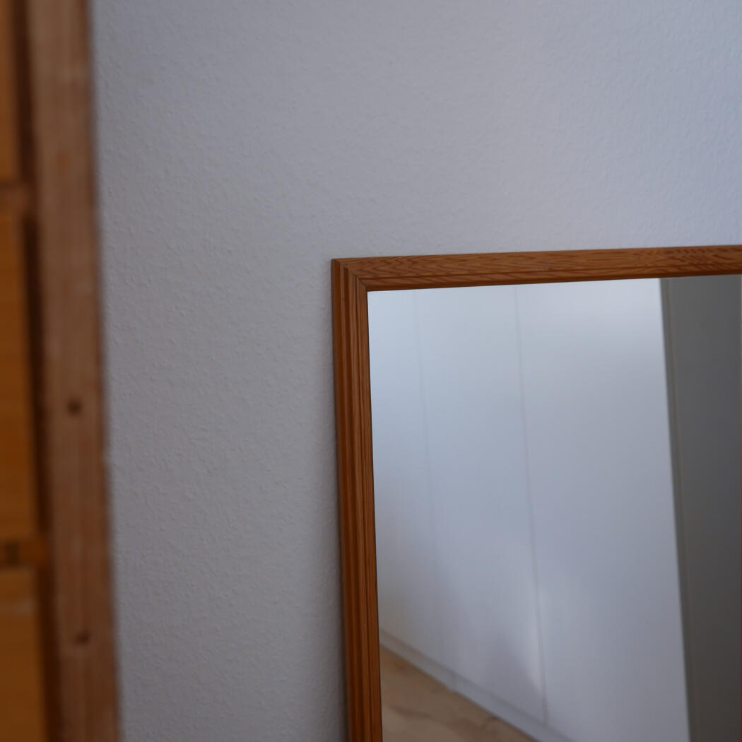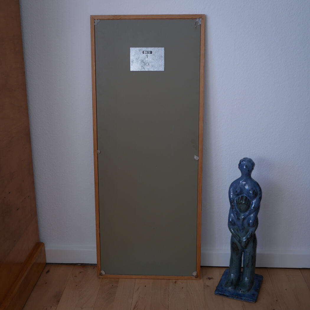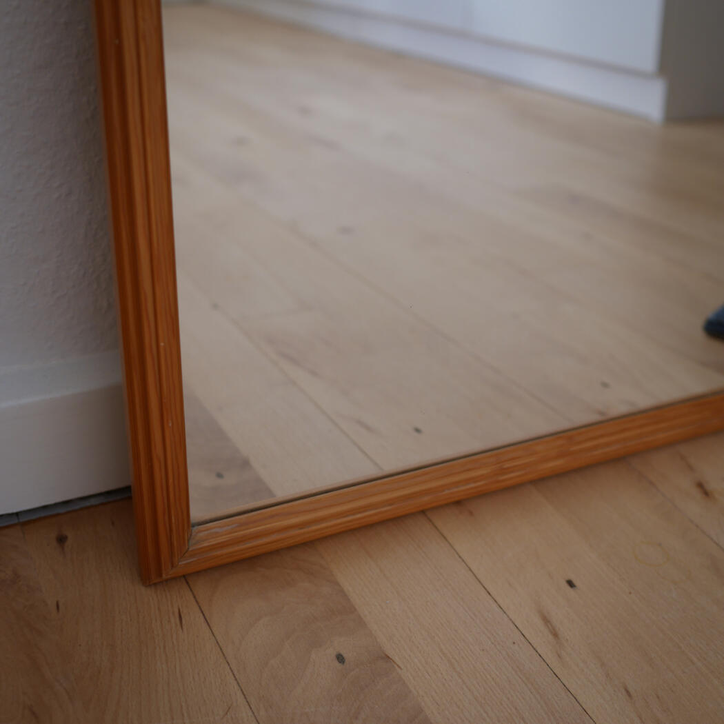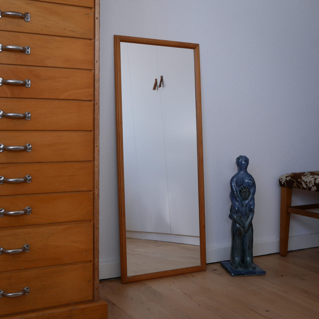 Et fint og enkelt aflangt spejl med fyrretræsramme. Rammen har over tid fået den helt rigtige farve. Rammen har desuden flotte og enkle udskæringer, som giver god dybde. Spejlet er fundet i Sverige.