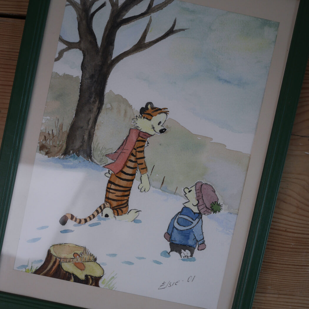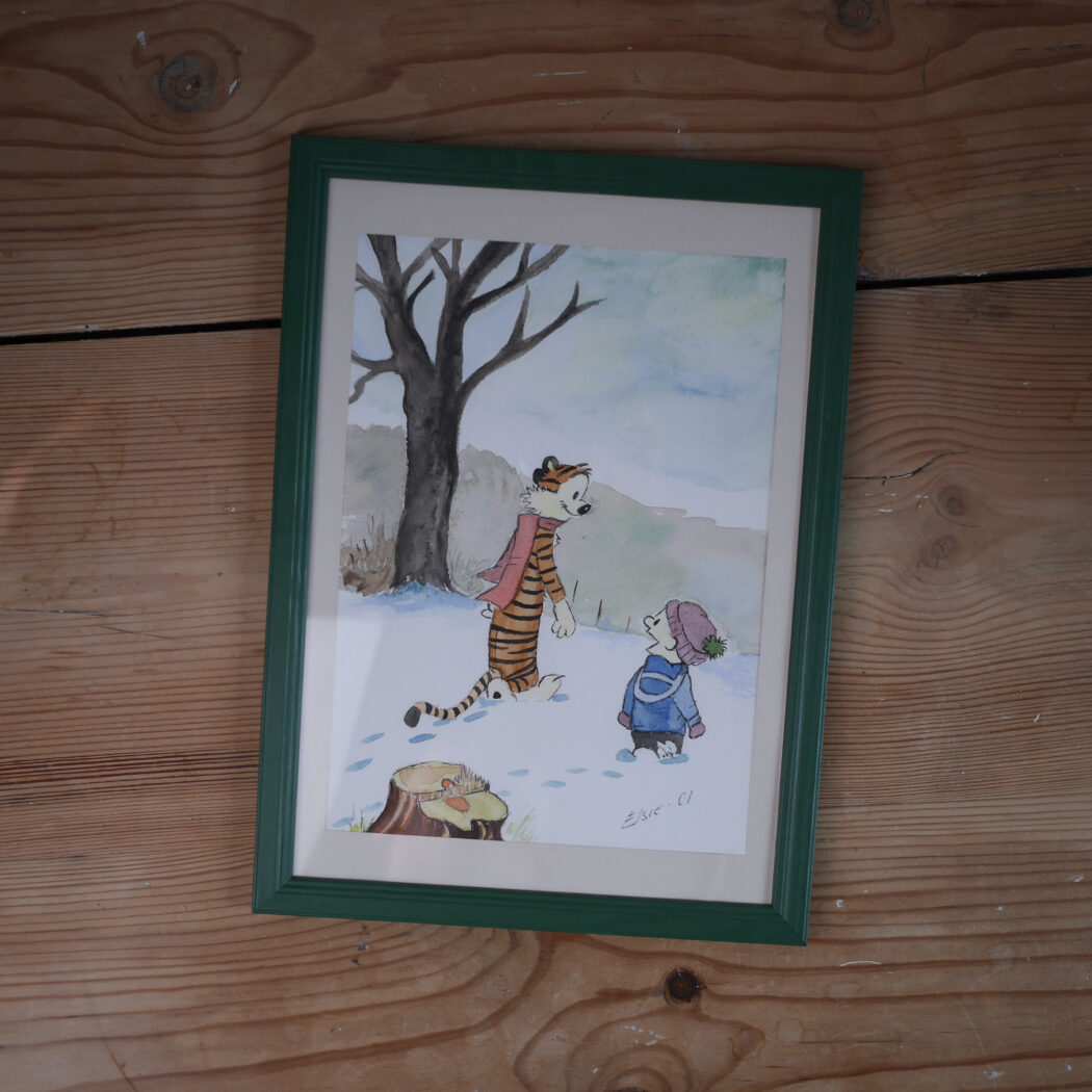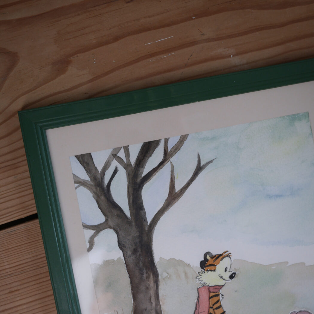 Et helt utrolig fint akvarel billede af Steen & Stoffer på tur. Farverne er så smukke og den grønne ramme passer så flot til billedet og dets farver. Et håndværk i særklasse, som vil passe smukt på børneværelset. Billedet er fundet i Sverige.