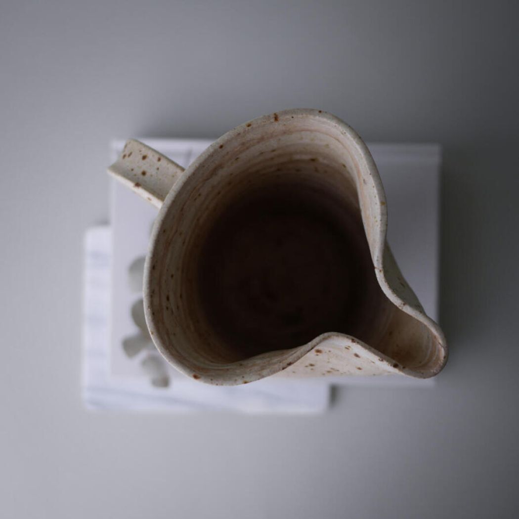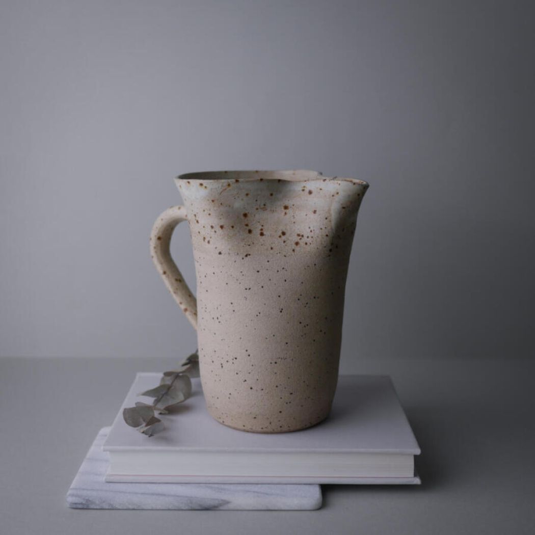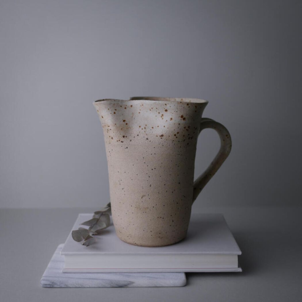 En super cool keramikkande i den lækreste skulpturelle formsprog. Kanden er i en lys nuance med lækre rustikke nistre i glasuren. En kande til dekoration, en kølig lemonade eller vilde blomster i sommerhuset.