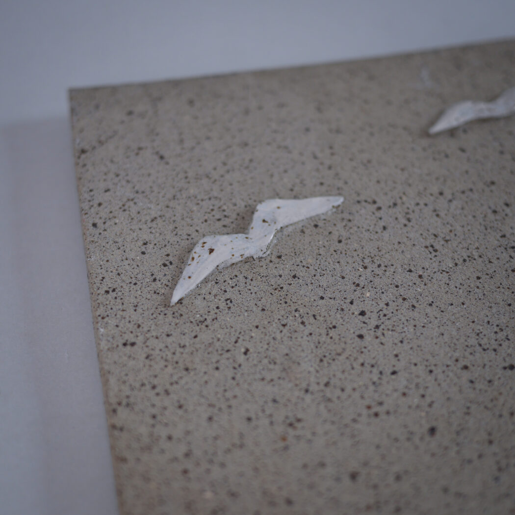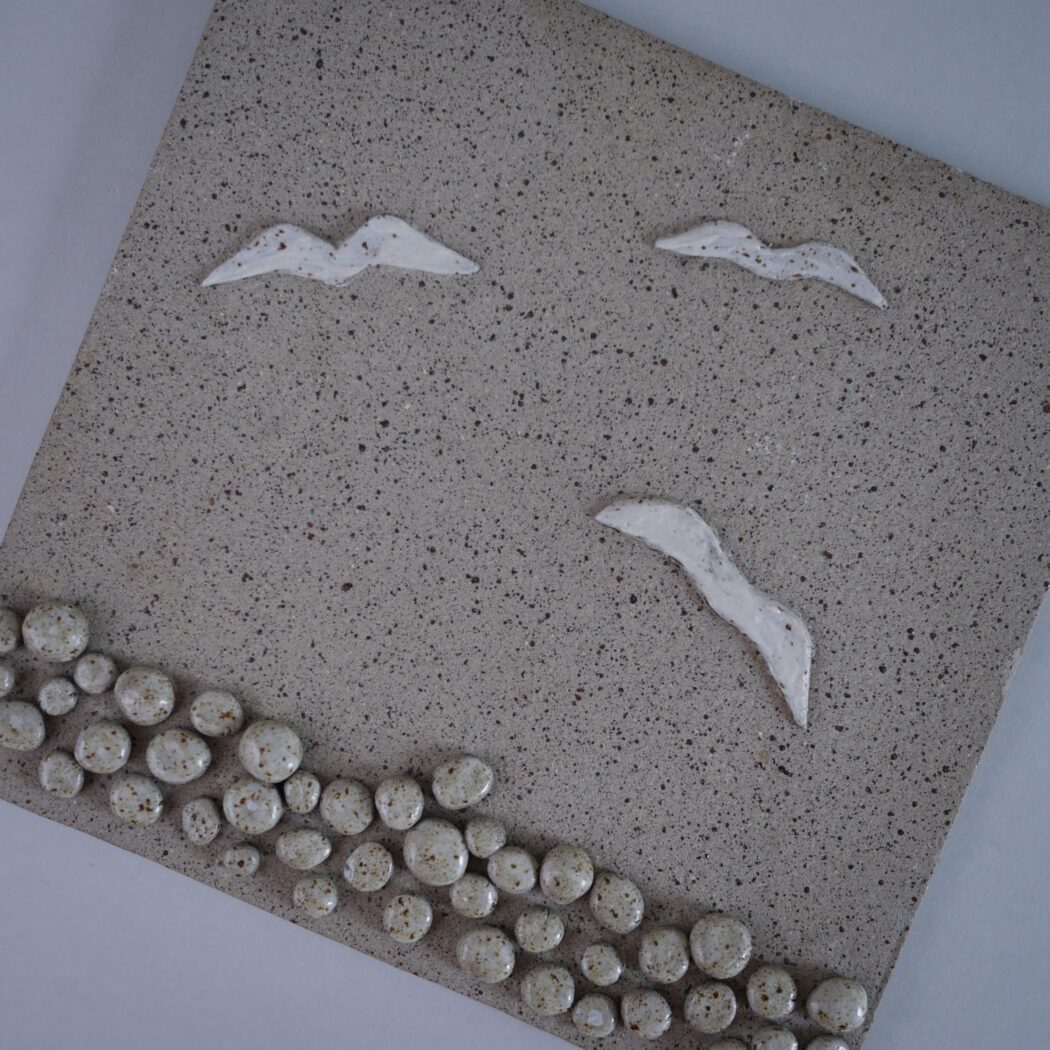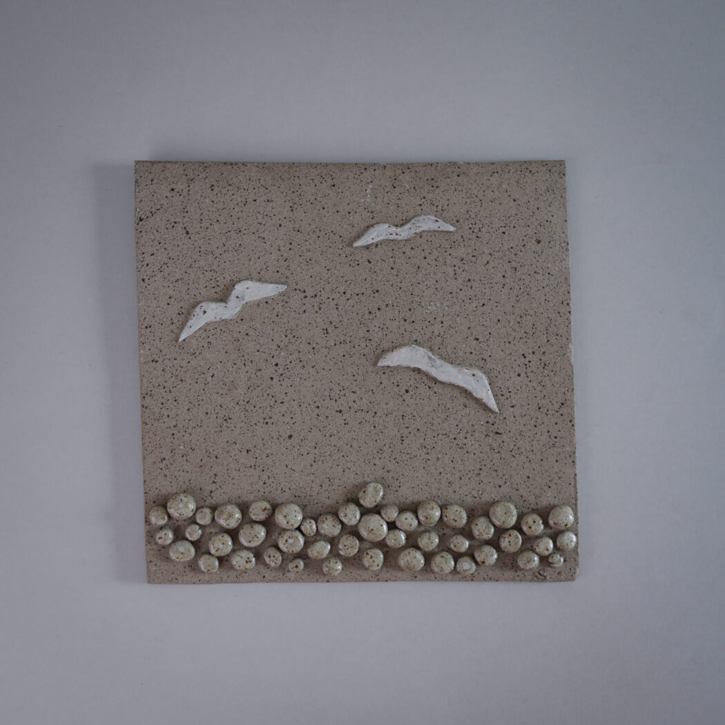Et enkelt kvadratisk beige keramik relief med hvide fugle i luften. Perfekt til sommerhuset ved vandet eller som et dekorativt element til din billedvæg. Et fund fra Sverige.