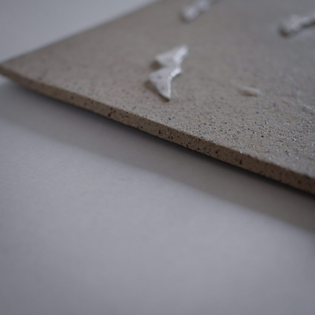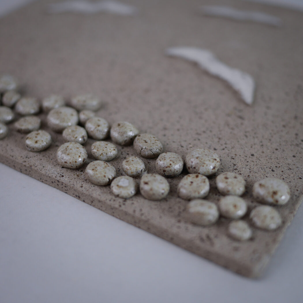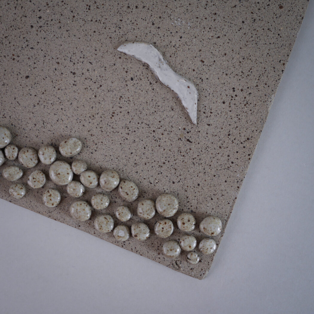Et enkelt kvadratisk beige keramik relief med hvide fugle i luften. Perfekt til sommerhuset ved vandet eller som et dekorativt element til din billedvæg. Et fund fra Sverige.