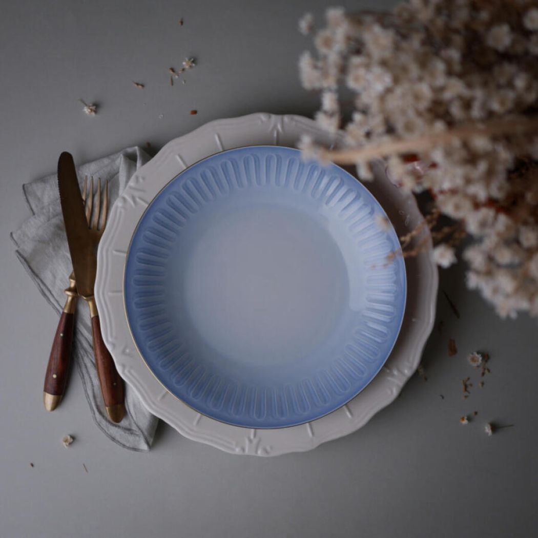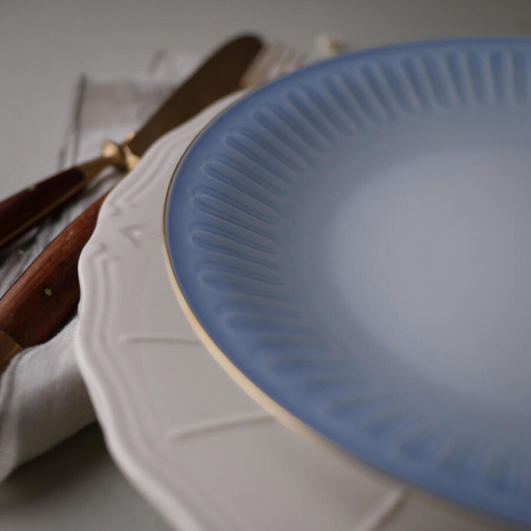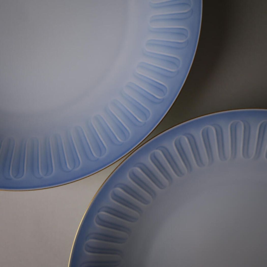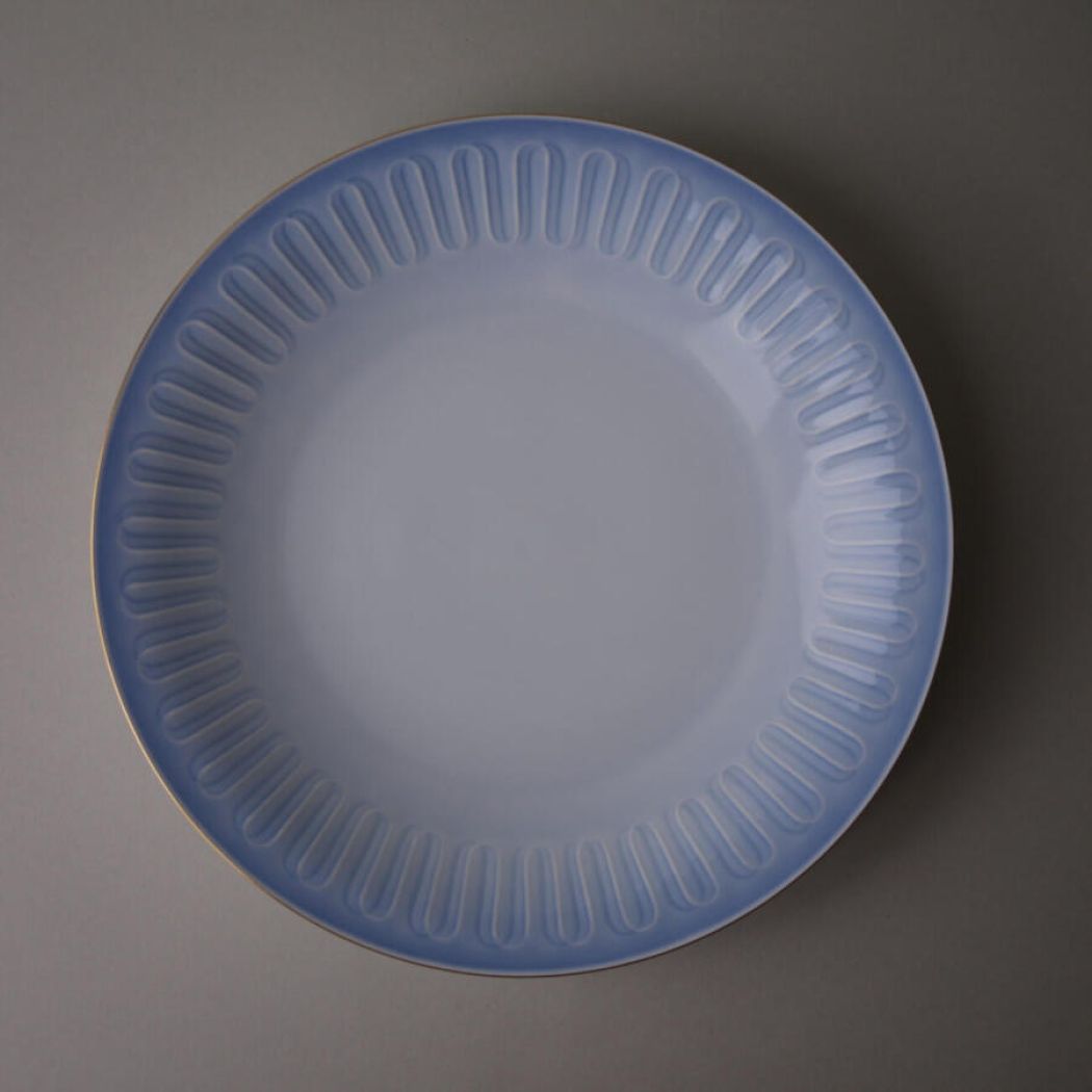 Fine blå frokosttallerkner fra Bing & Grøndahl med svungne dekorationer. Den lyseblå farve er så virkelig flot, og dekorationerne ligner nærmest bånd, som er foldet sirligt langs kanten. De er fundet i fantastiske Sverige. 12 stk. haves, sælges i sæt af 6 eller 12 stk.