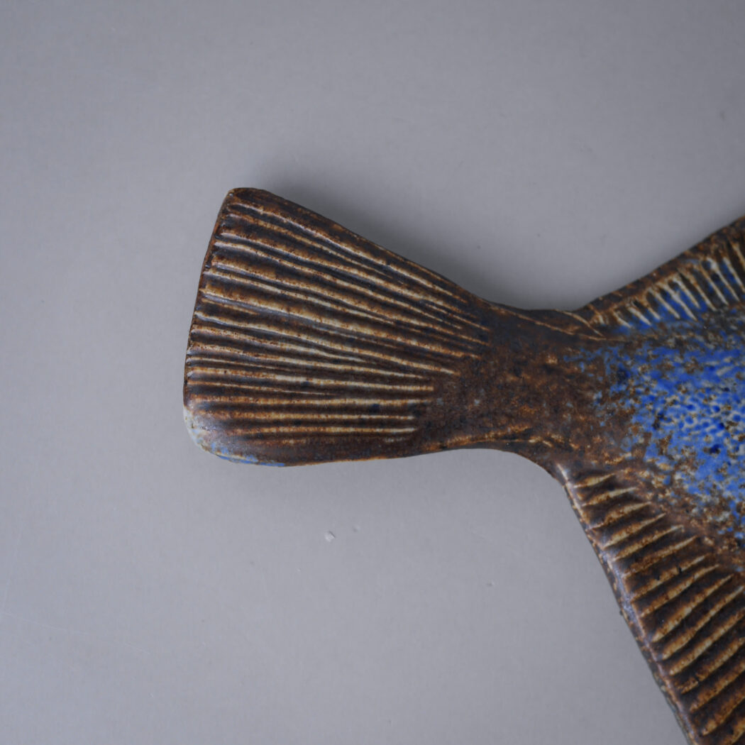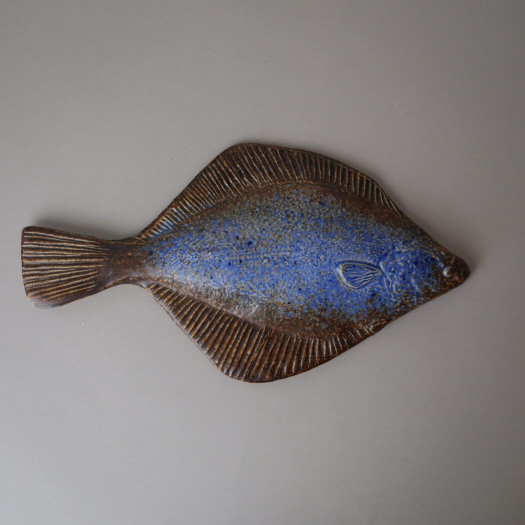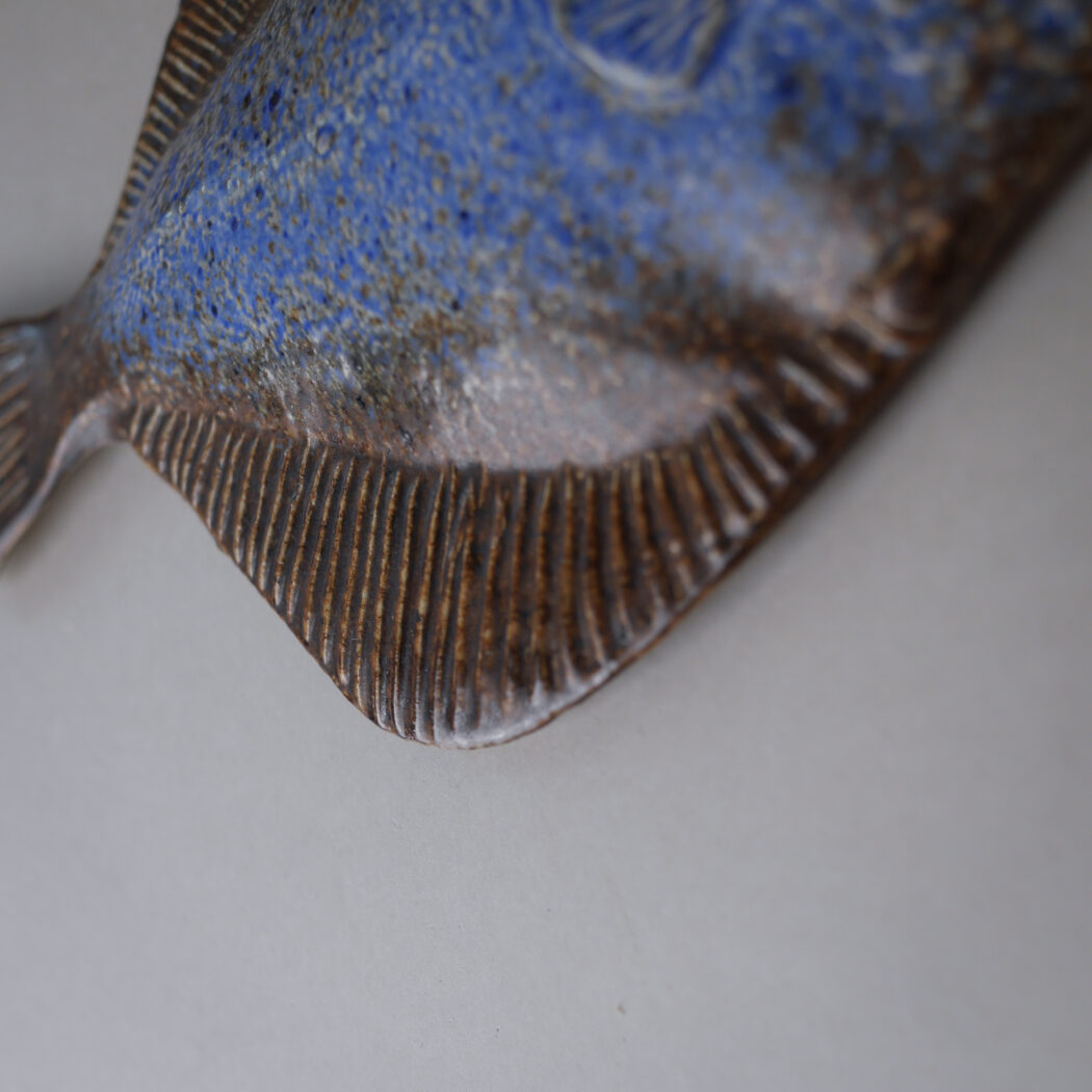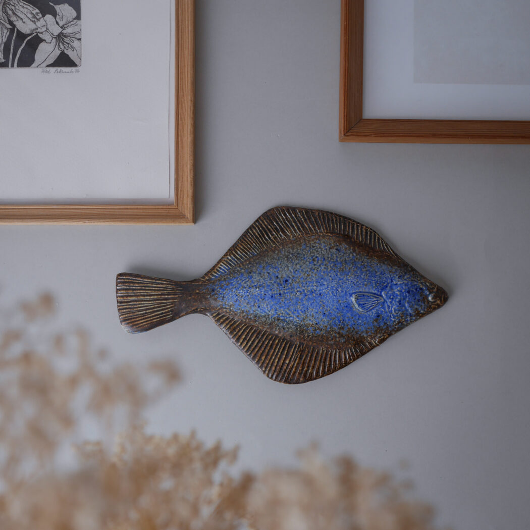 Meget flot blå og brun fisk i keramik til væggen. En dekorativ vægdekoration i særklasse, som tilfører personlighed og karakter til indretningen – og fisk på væggen er i øjeblikket et populært og stilfuldt valg. Fisken er fundet i Jylland og har et smukt, håndlavet udtryk.