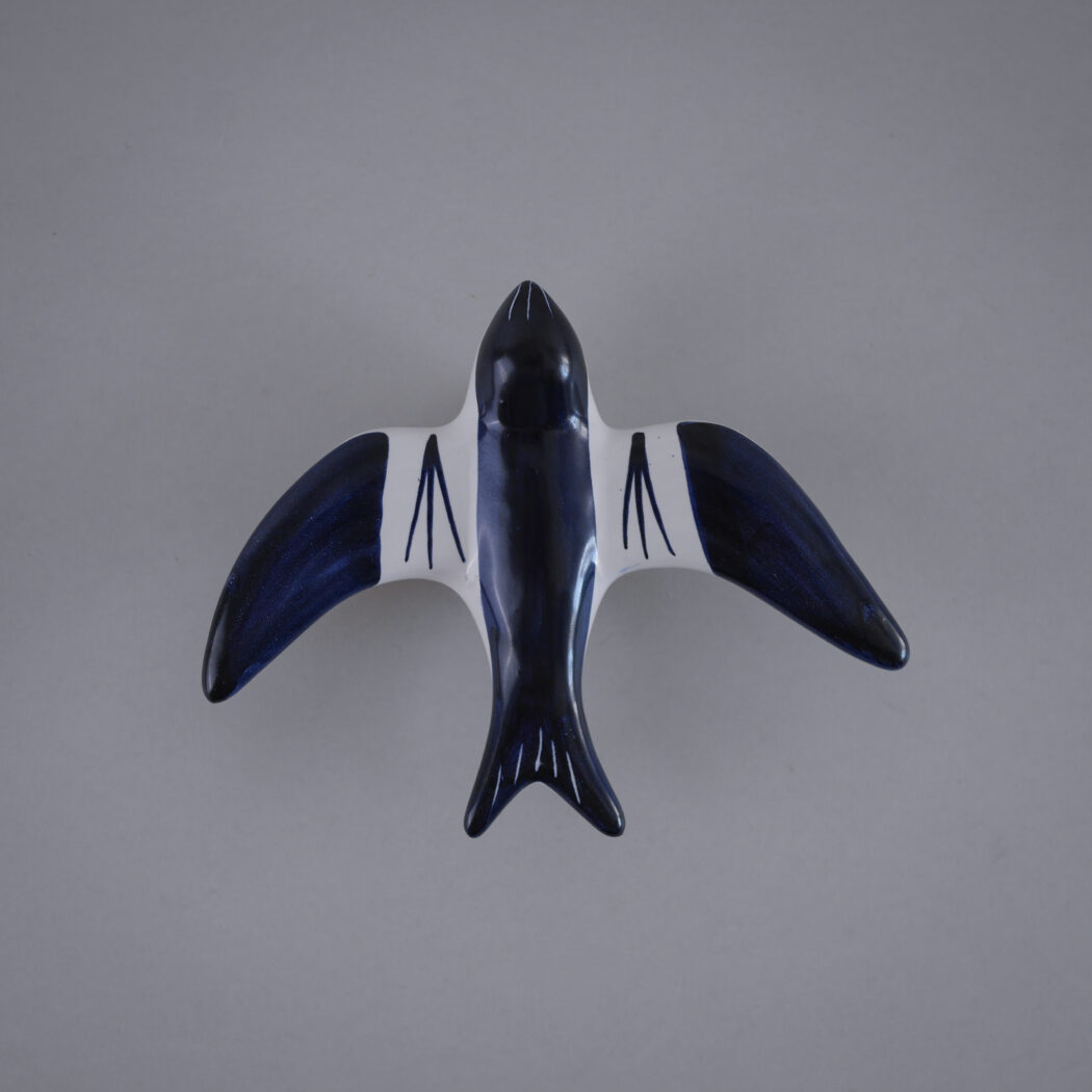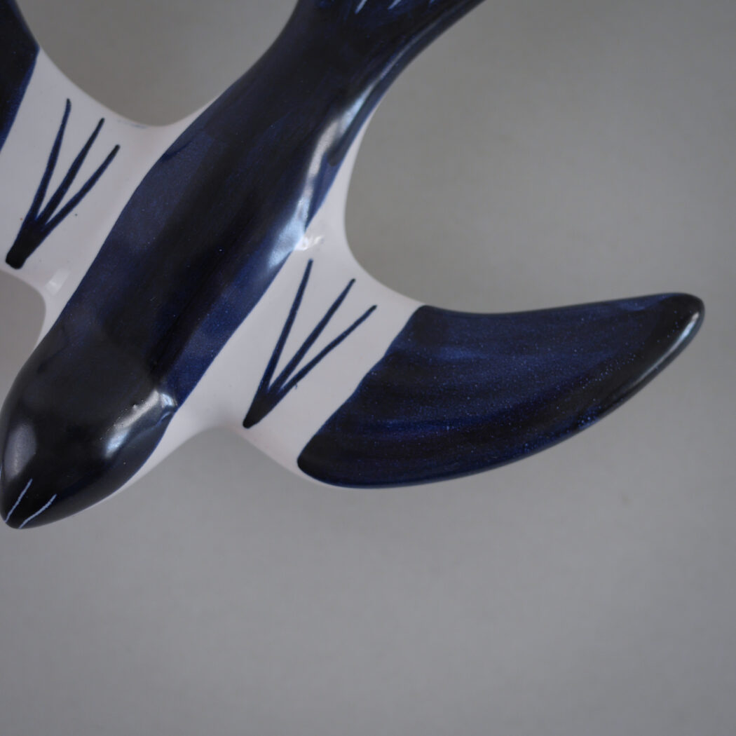 En særligt fin blå og hvid svale i keramik til væggen. Svalen har enkle sorte dekorationer. Den er i perfekt stand, og vil pynte flot på væggen både alene eller sammen med andre vægdekorationer og plakater. Et fund fra Jylland.