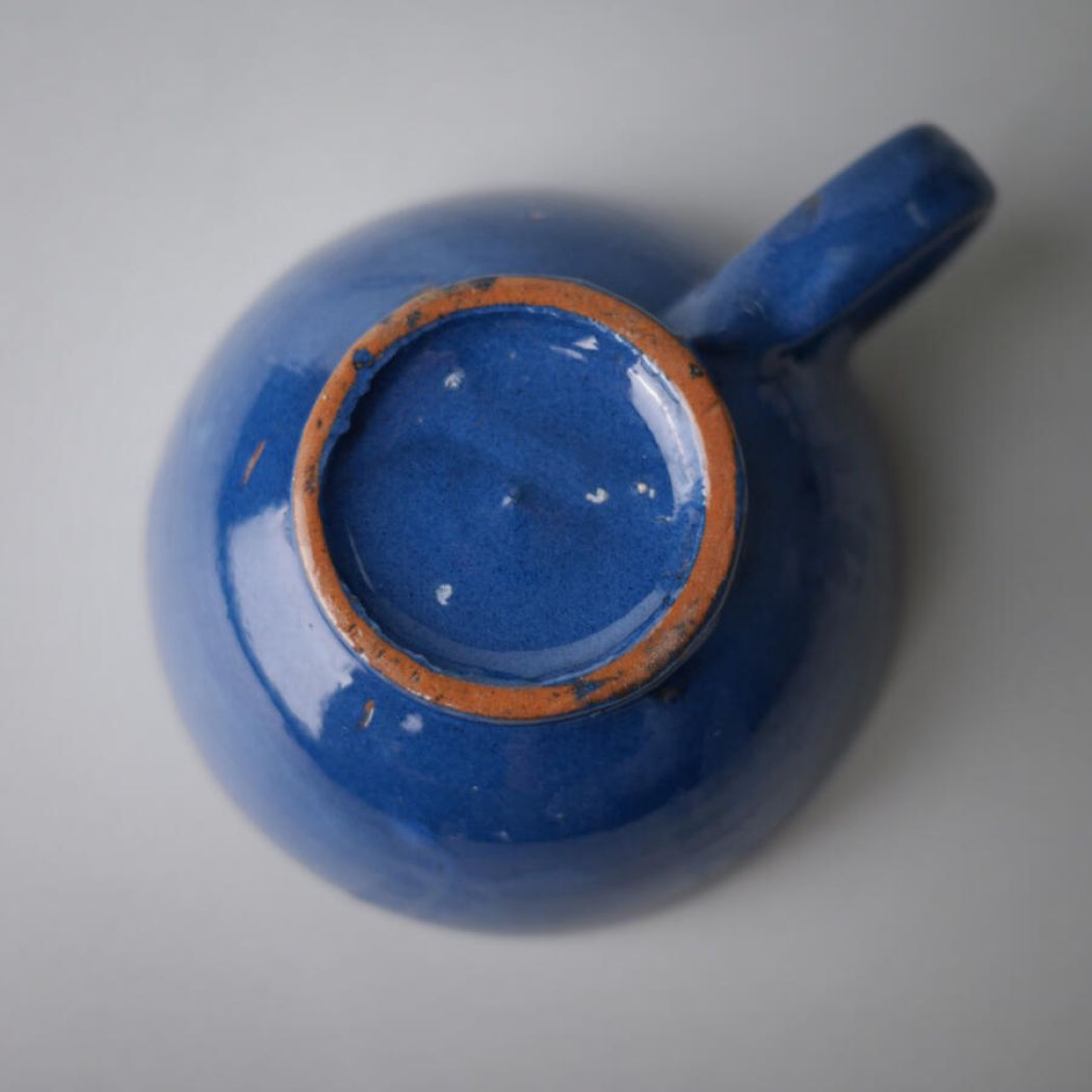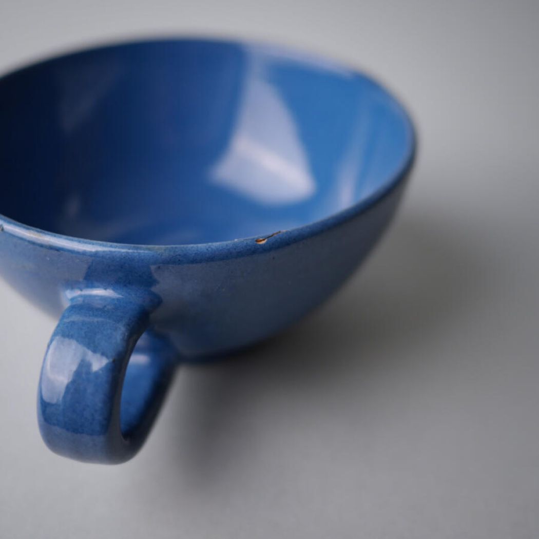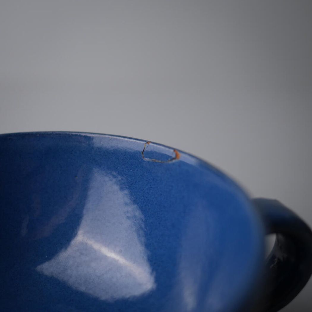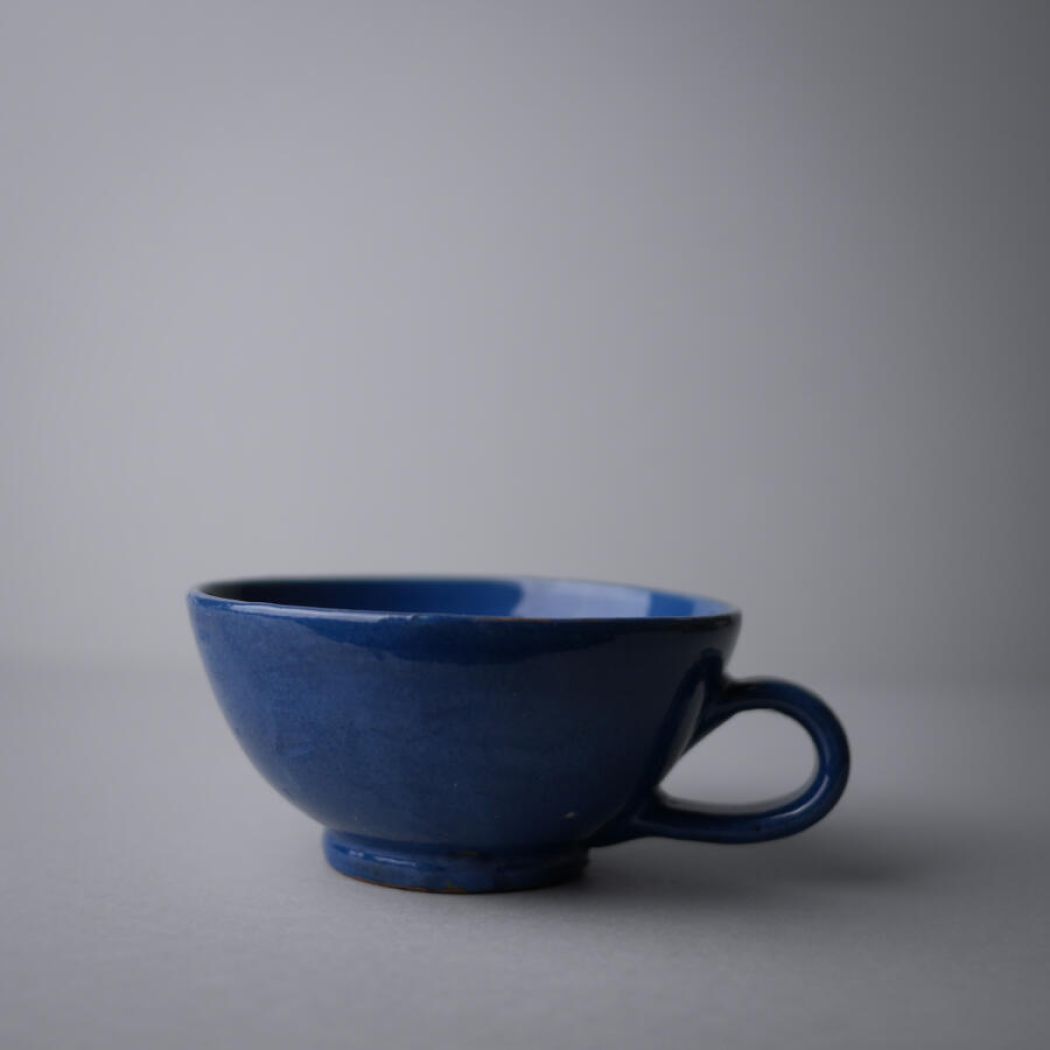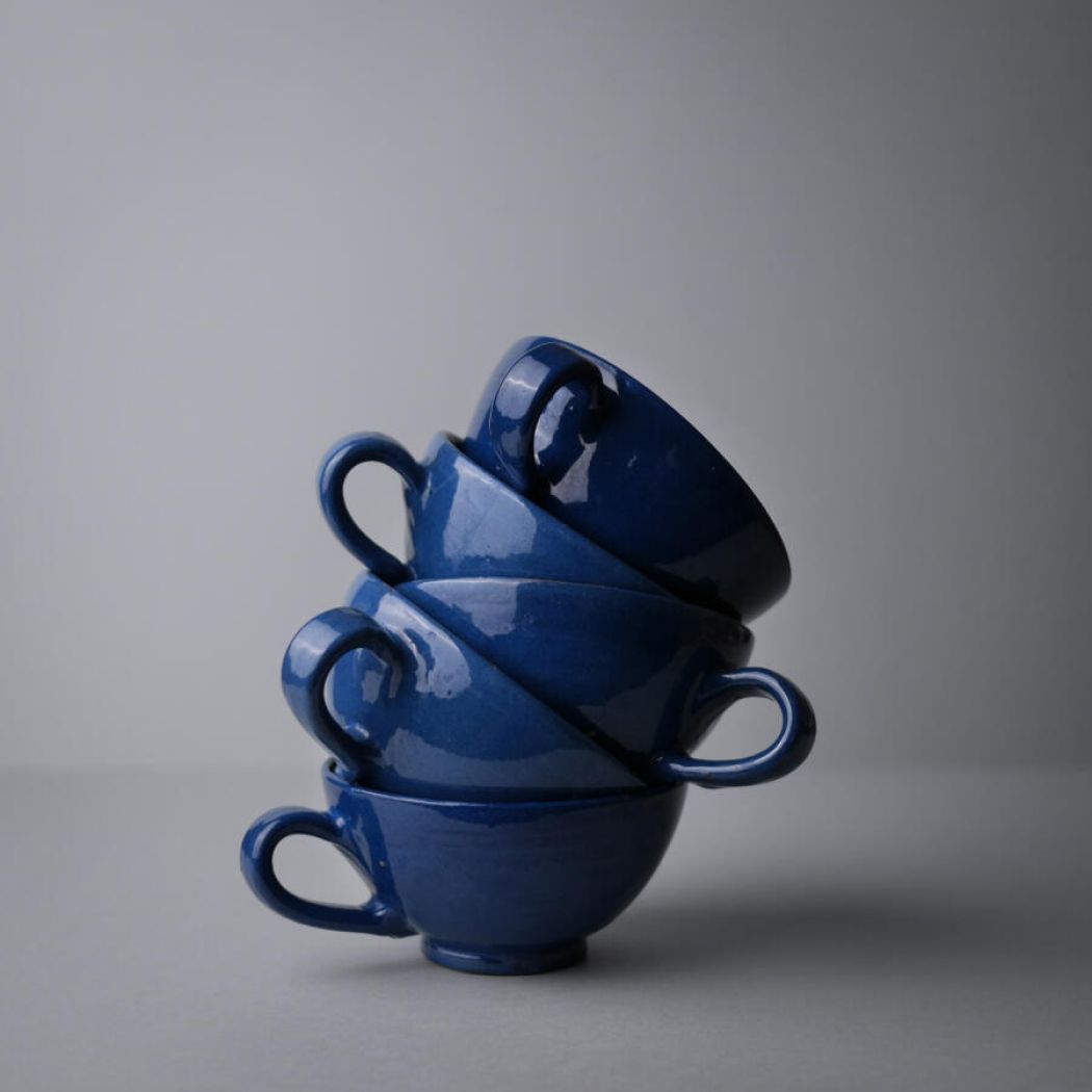 Lækre og rustikke blå keramikkopper i et sejt design. Farven er super flot og det samme er glasuren. De kan stables ovenpå hinanden på en hylde i køkkenet for en personlig og varm køkkenstil. En kop har en mindre reparation, se detaljebilleder. Den følger med gratis. 5 stk. fundet, sælges samlet.