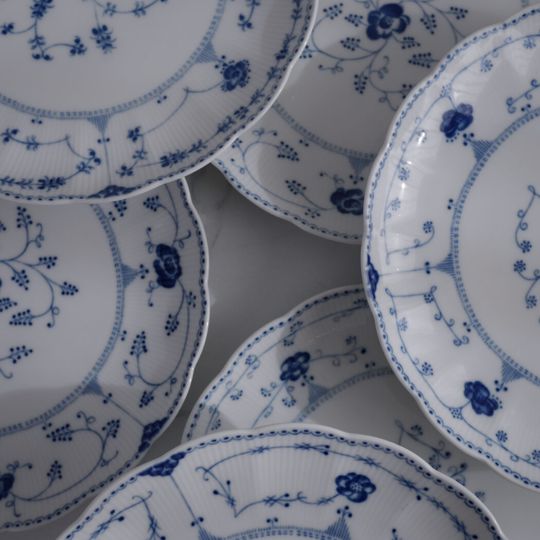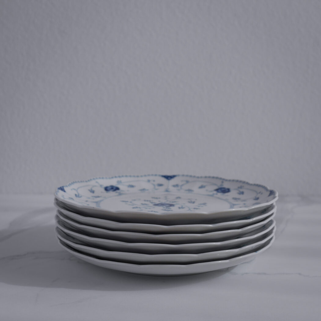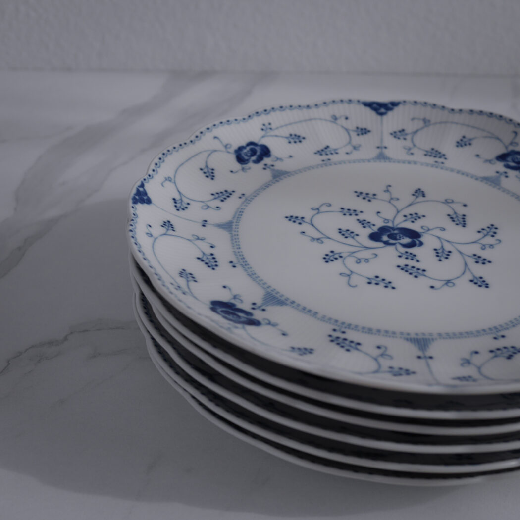 De smukke store musselmalede middagstallerkner fra Svaneholm er simpelthen magiske. De buede kanter og blå dekorationer giver det fineste udtryk. Dekorationerne er lidt forskellige, hvilket er super charmerende. 6 stk. fundet i Sverige, og de sælges samlet.