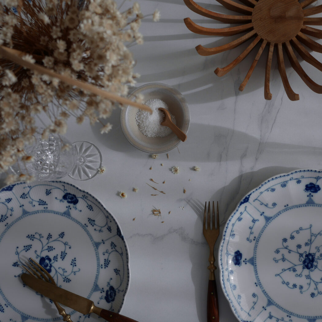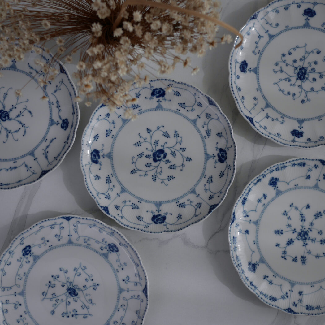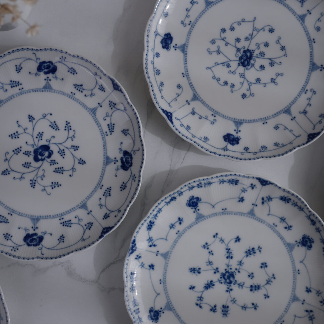 De smukke store musselmalede middagstallerkner fra Svaneholm er simpelthen magiske. De buede kanter og blå dekorationer giver det fineste udtryk. Dekorationerne er lidt forskellige, hvilket er super charmerende. 6 stk. fundet i Sverige, og de sælges samlet.