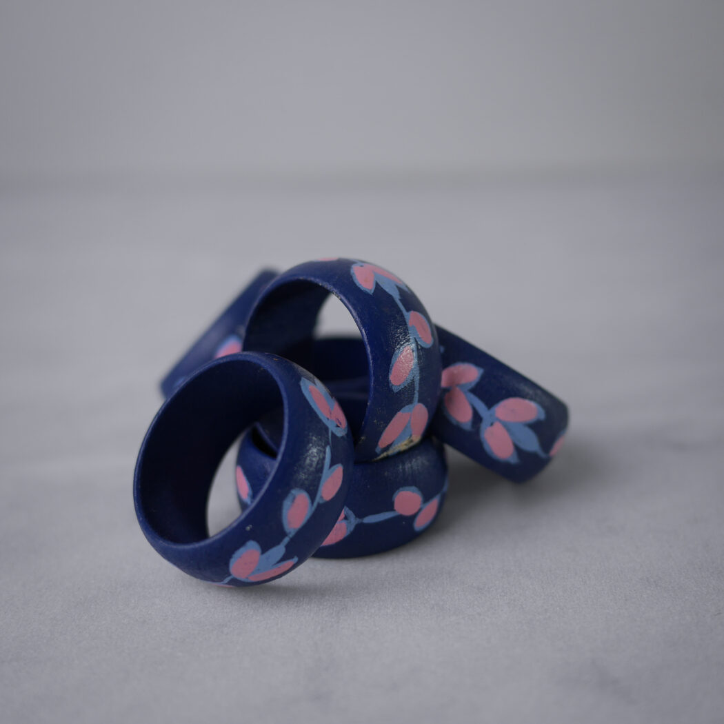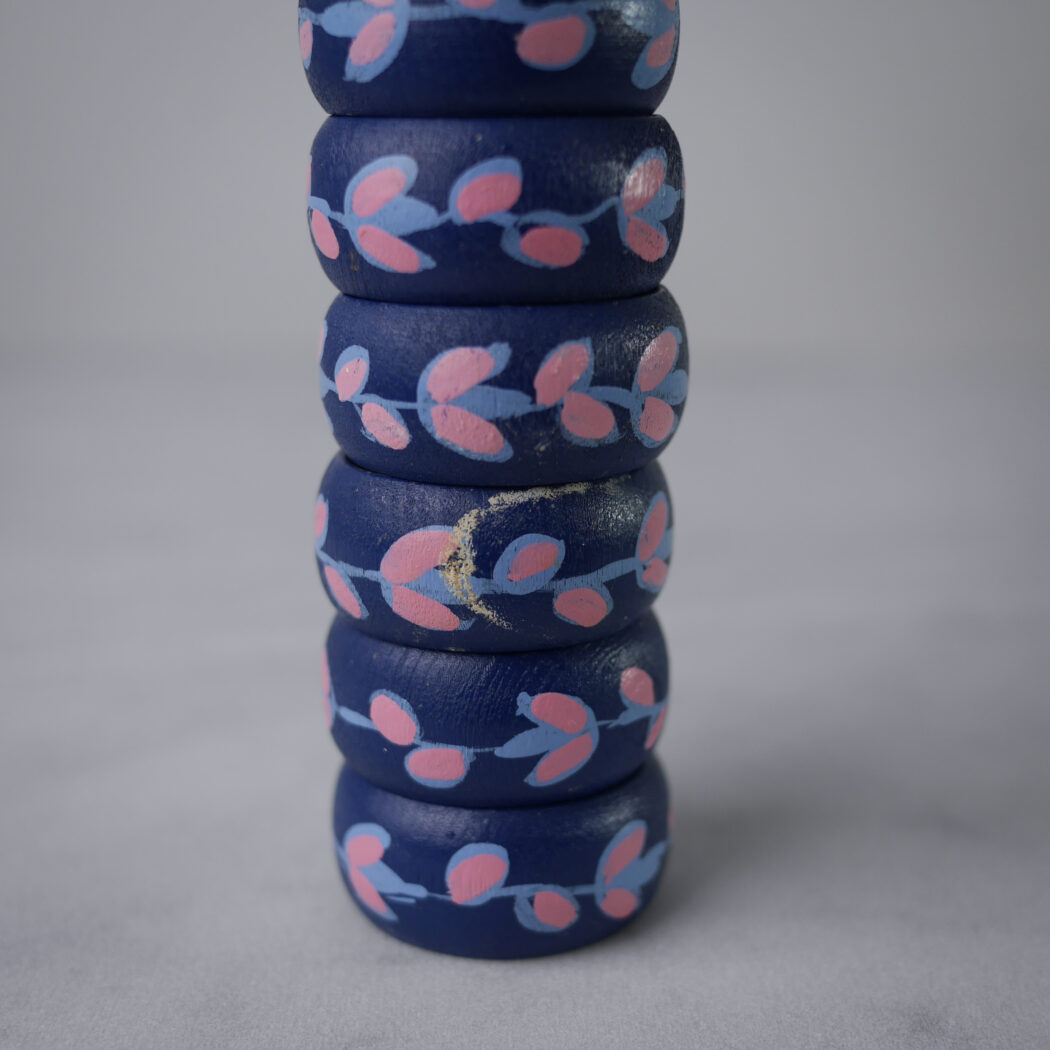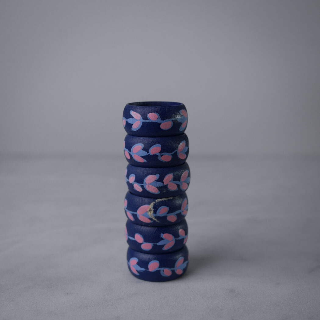 Fine blå servietringe i træ med håndmalede lyserøde blomster dekorationer. Det er de små detaljer, som fuldender borddækningen. 6 stk. fundet i Sverige, sælges samlet.