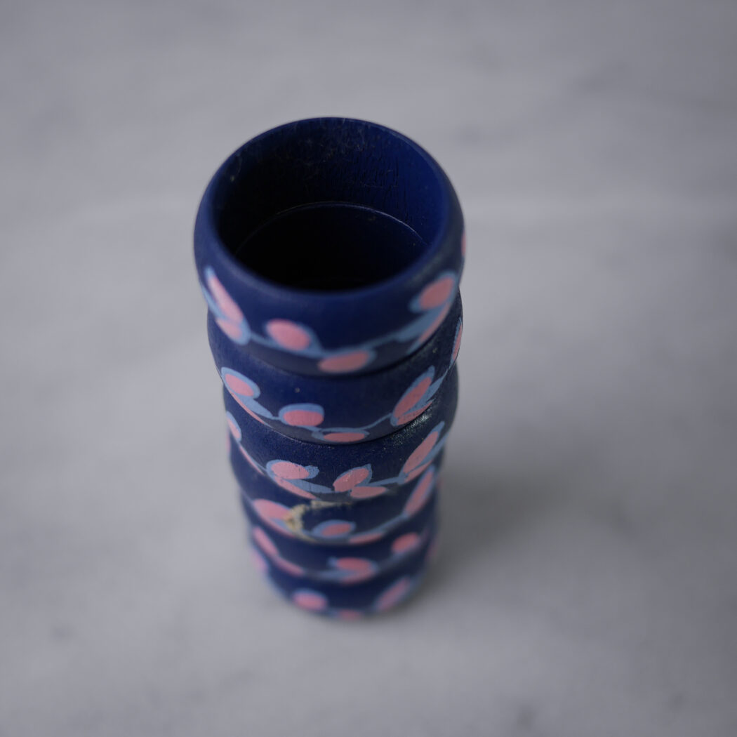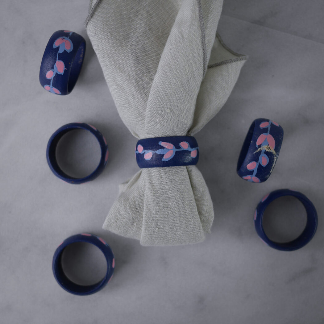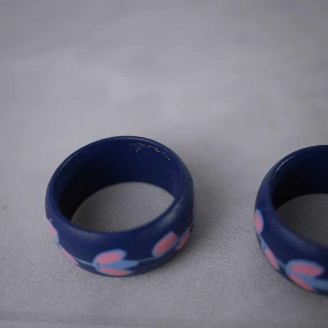 Fine blå servietringe i træ med håndmalede lyserøde blomster dekorationer. Det er de små detaljer, som fuldender borddækningen. 6 stk. fundet i Sverige, sælges samlet.