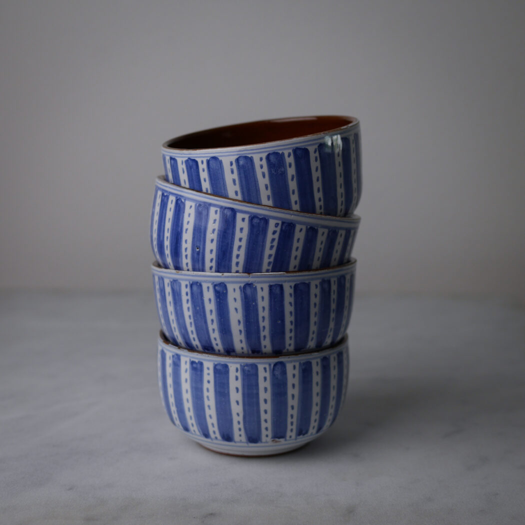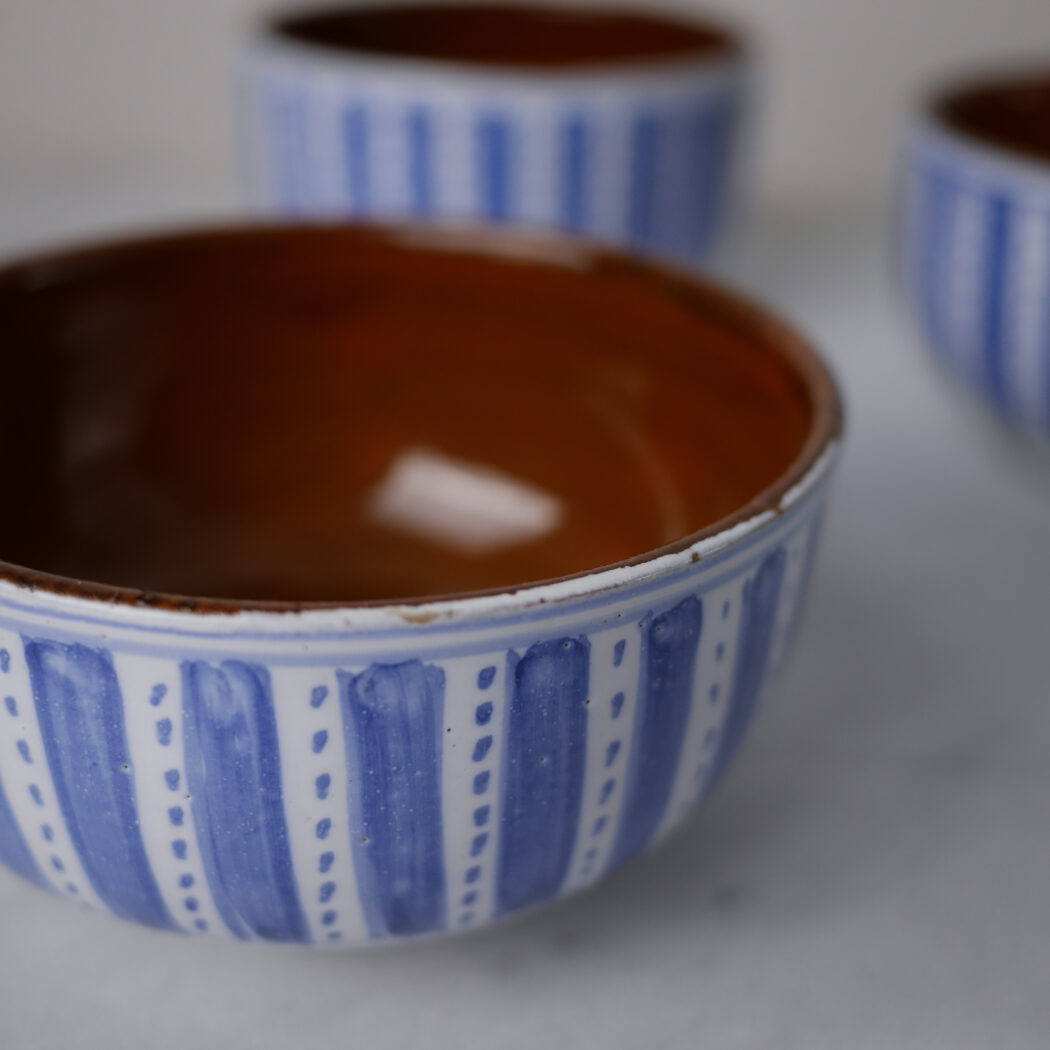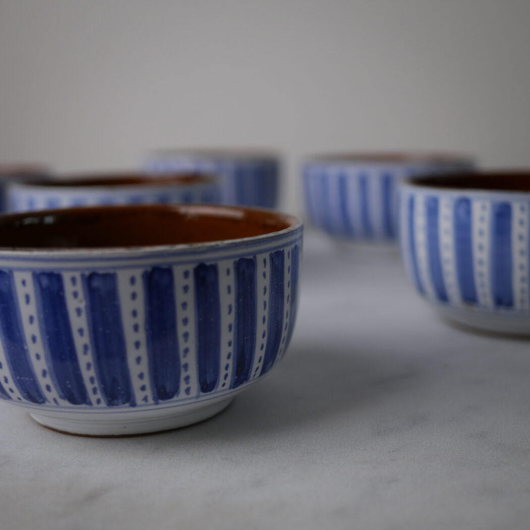 Skønne blåstribede skåle – de virker håndmalede, måske fra Spanien eller Portugal. Perfekte til alle dagens måltider. De er ikke helt ens i størrelsen, hvilket kun er en ekstra charme. 6 stk. Fundet i Sverige, de sælges samlet.