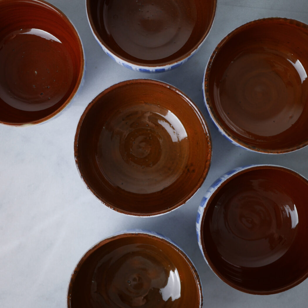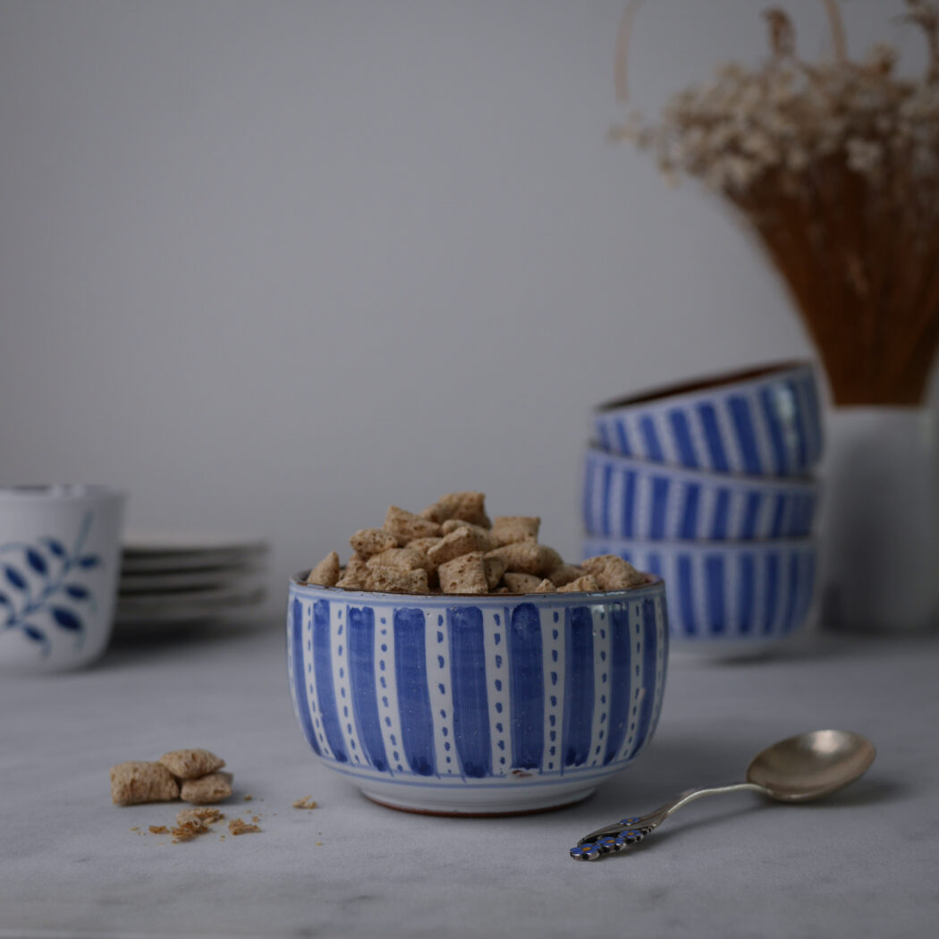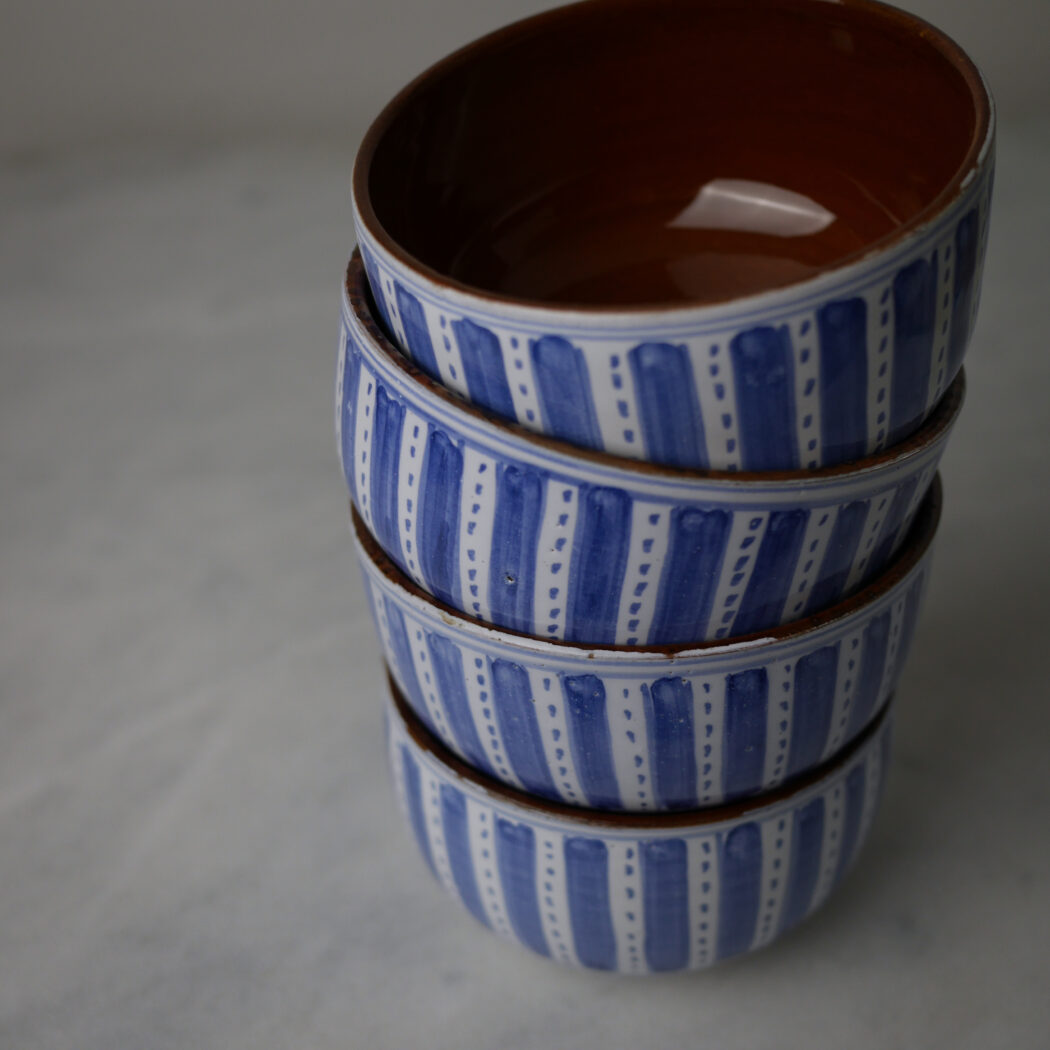 Skønne blåstribede skåle – de virker håndmalede, måske fra Spanien eller Portugal. Perfekte til alle dagens måltider. De er ikke helt ens i størrelsen, hvilket kun er en ekstra charme. 6 stk. Fundet i Sverige, de sælges samlet.