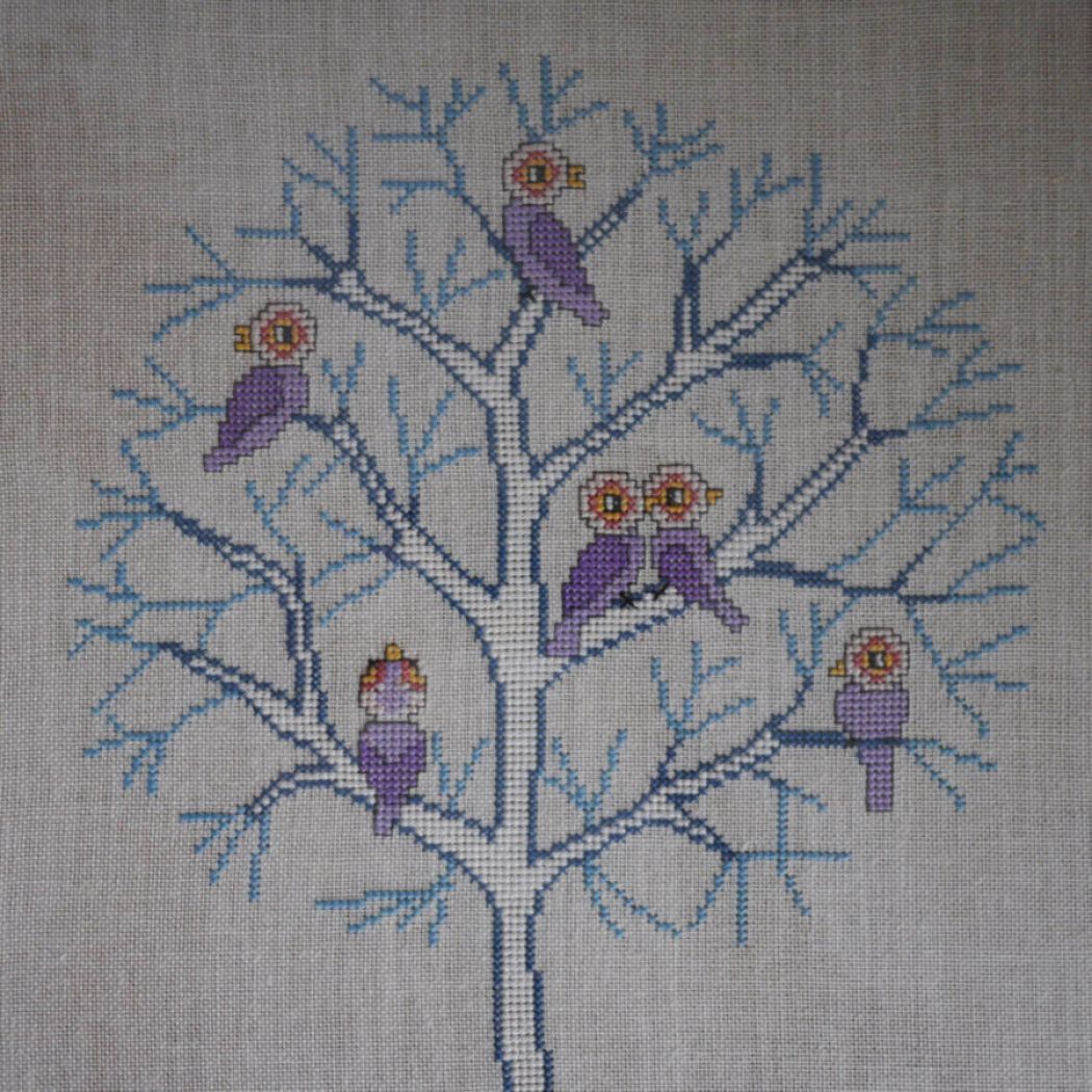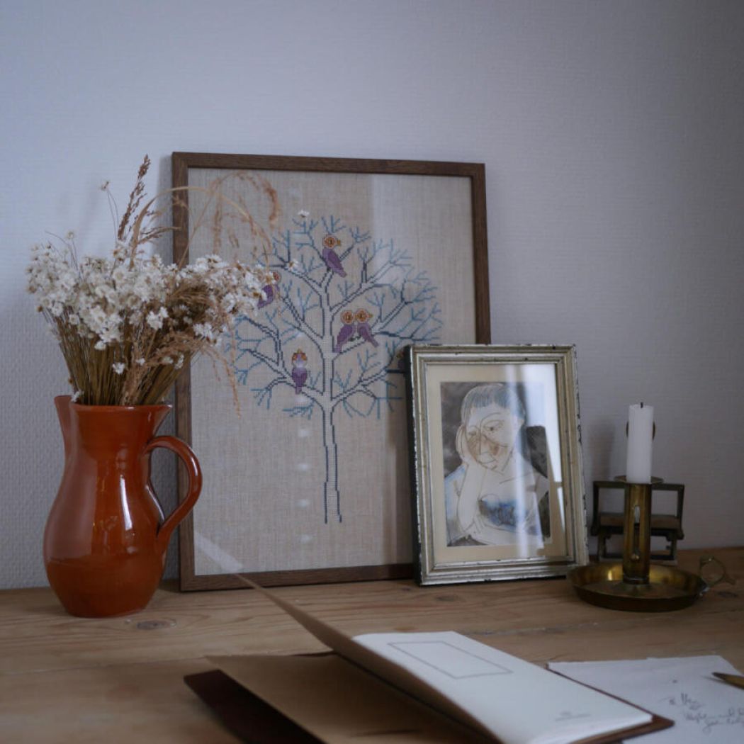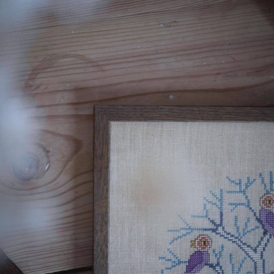 Jeg er helt sikker på, at broderede billeder er på vej ind i indretningen, hvis de altså har de helt rigtige motiver og farvenuancer. Dette fine fine broderede vintage billede med lilla fugle er så smukt! Sarte lyse farver og se lige de små fugle, som kysser hinanden, så bedårende. Billedet er fundet i Sverige. Rammen kan tilkøbes, den er i mørk egetræ fra Italien og med ægte glas.