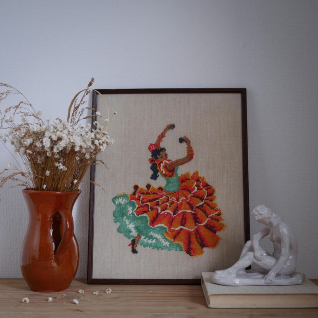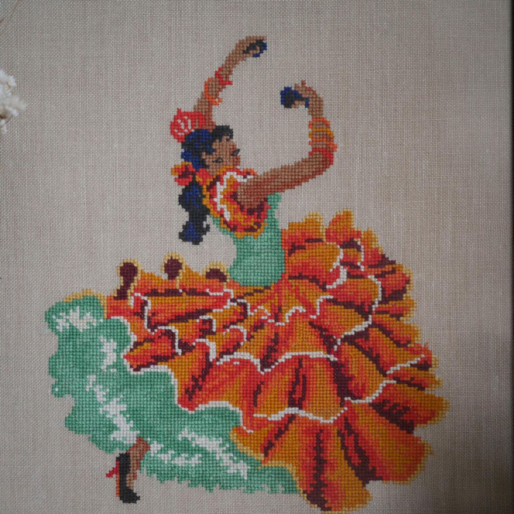 Et unikt og farverigt broderet billede med en eksotisk spansk danserinde. Broderede billeder hitter i indretningen, men de skal have de rigtige motiver og farver – og begge dele spiller bare her! Unikke billeder til din boligindretning.