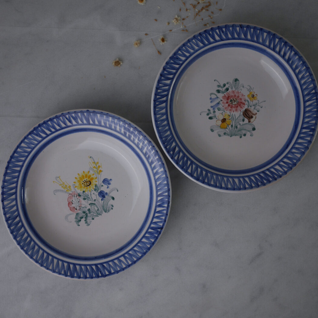 En samling dybe vintage keramik tallerkner med blå striber og fine blomster. De giver borddækningen en fin og særlig stemning, som man kun opnår med unikke vintage tallerkener. 5 stk. fundet i Sverige, sælges samlet.