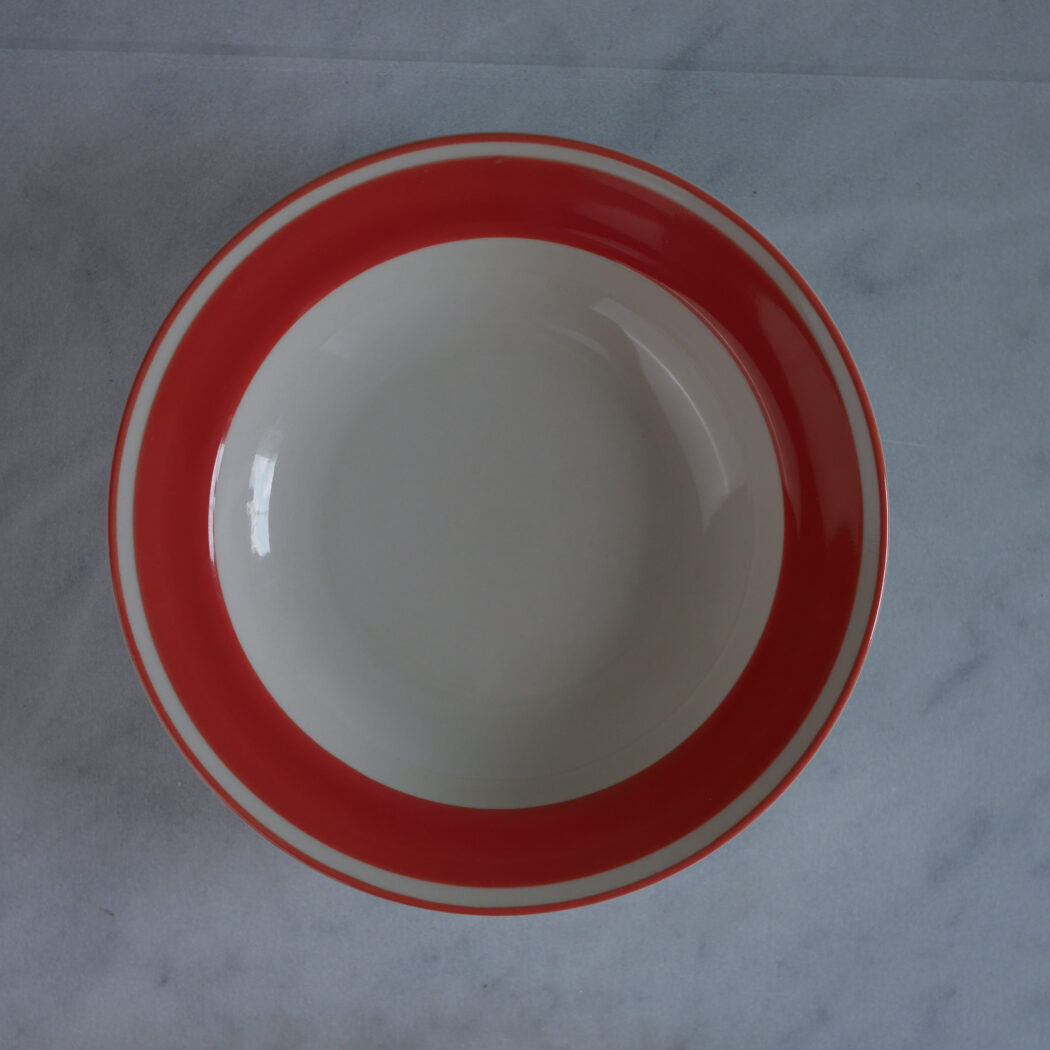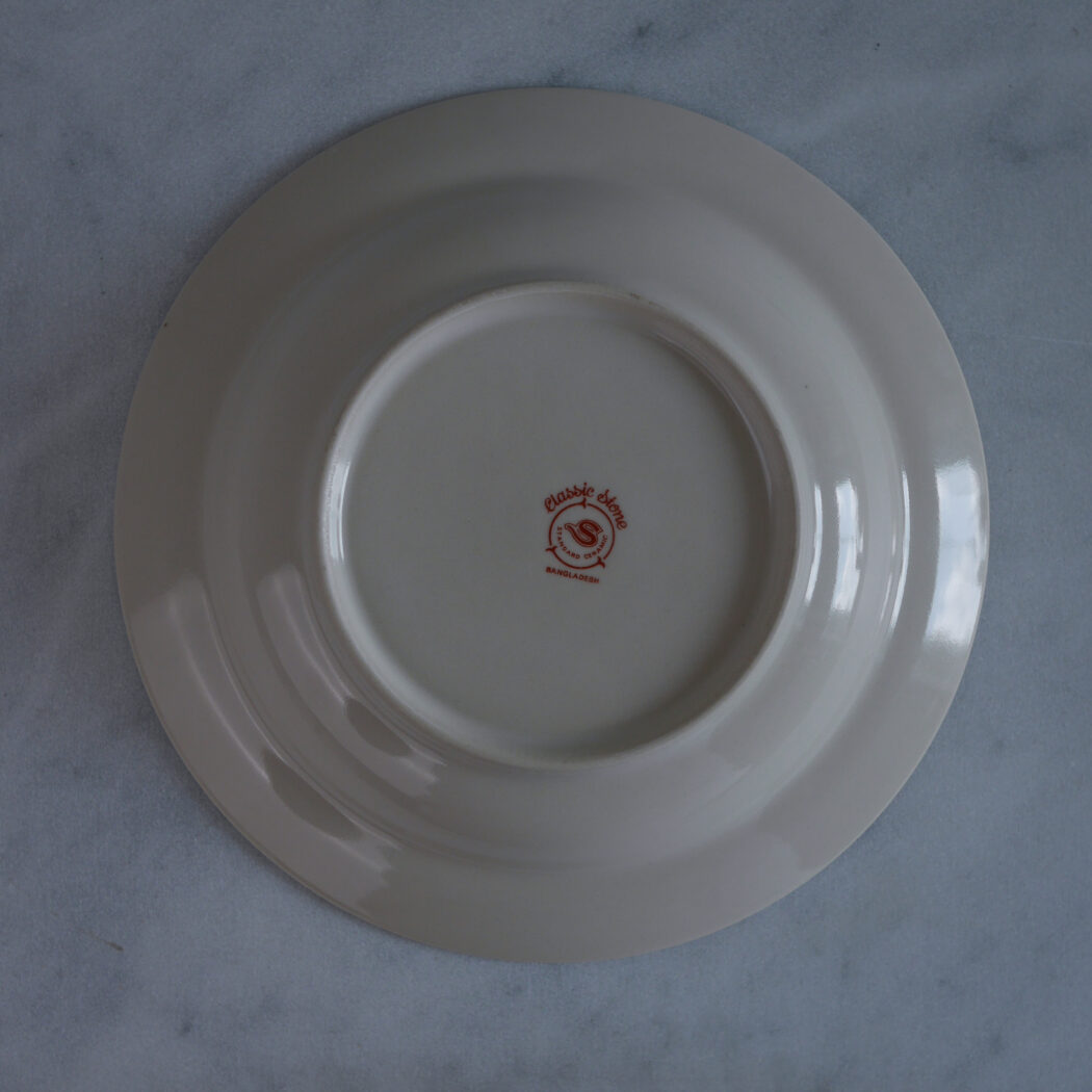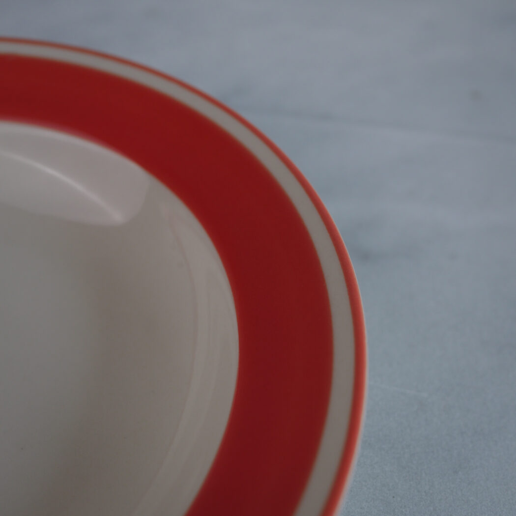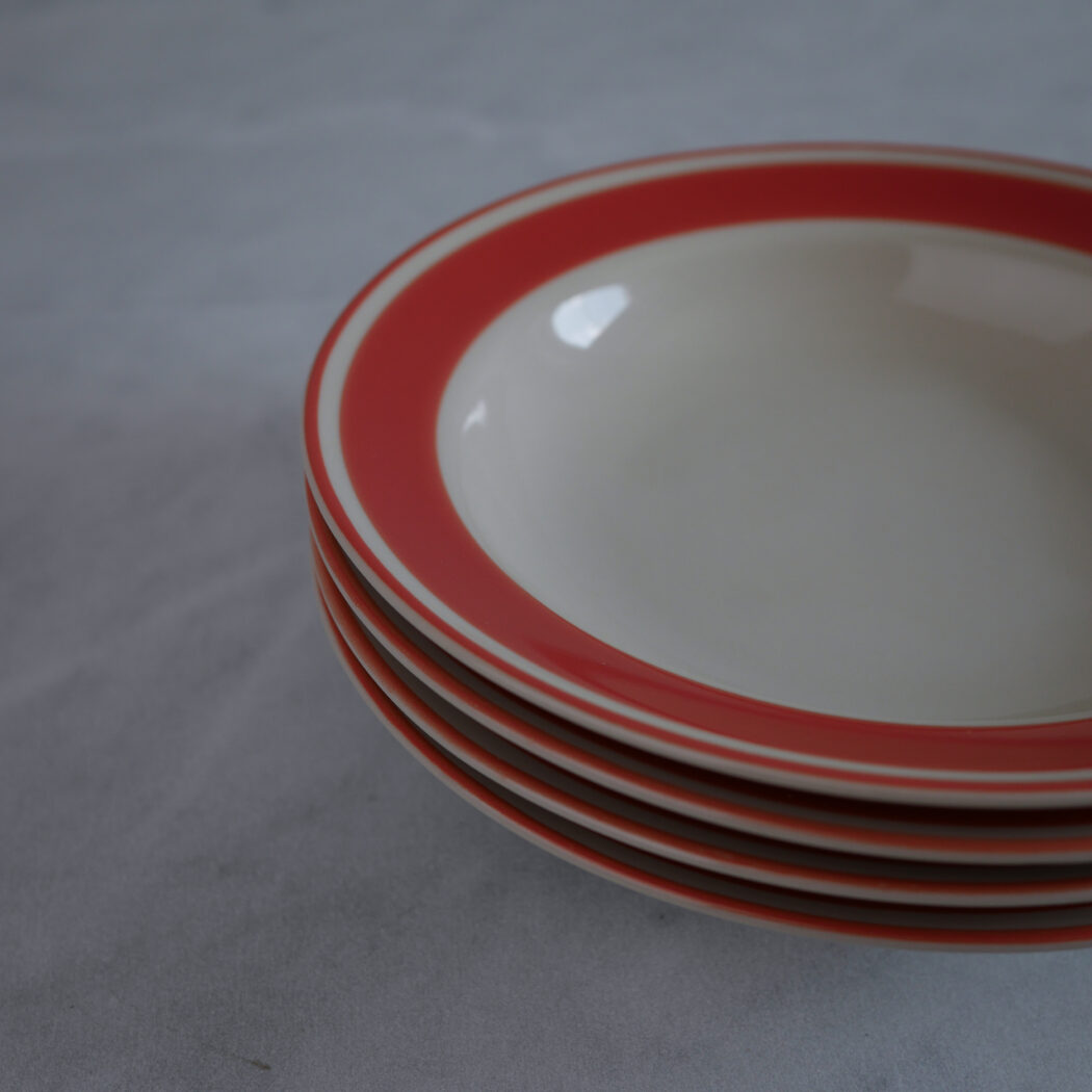 Fine dybe beige tallerkner med koralfarvede kanter. De emmer af sommer og sol, og de vil pynte smukt på middagsbordet. 4 stk. fundet i Sverige, de sælges samlet. Se også de matchende frokosttallerkner på webshoppen.