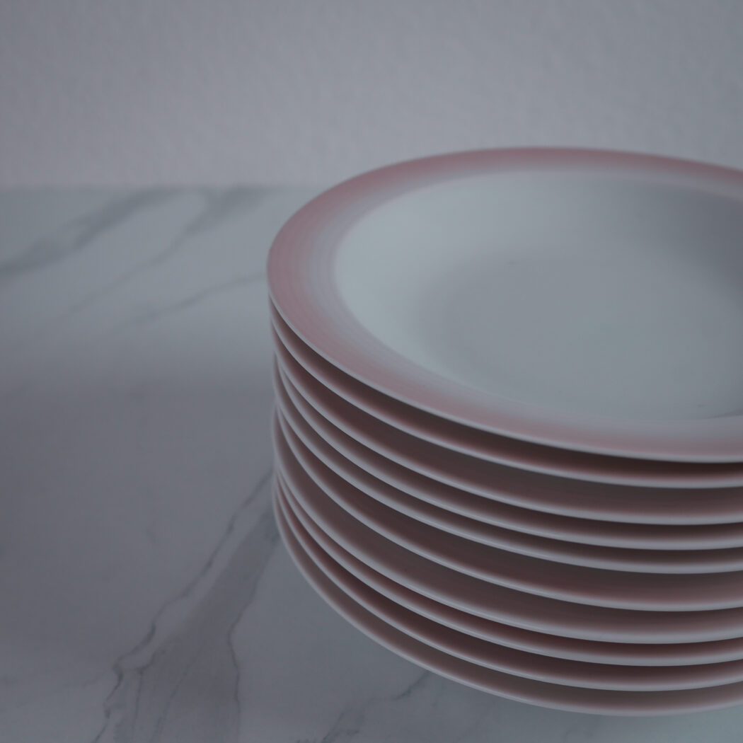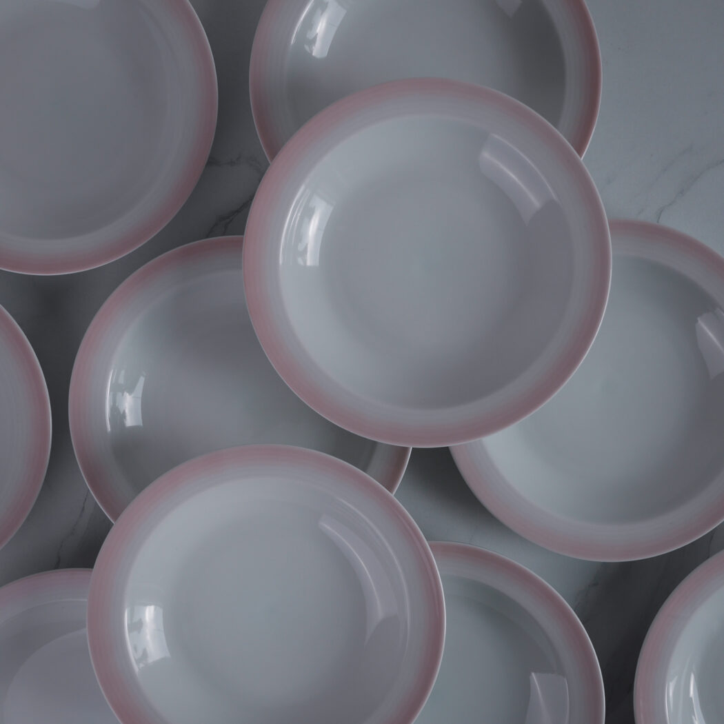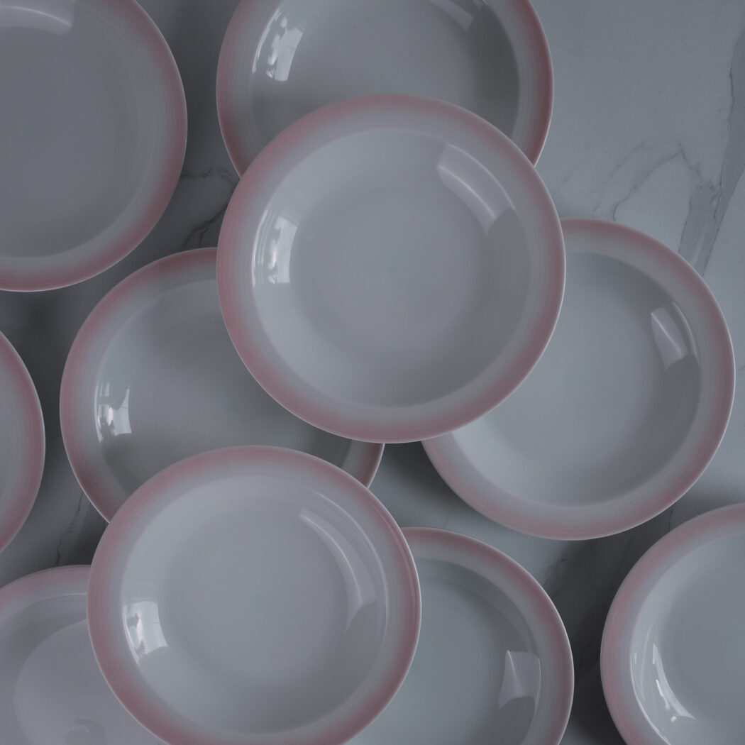 Et sæt på ti smukke, dybe tallerkner i sart rosa porcelæn. Den blide pasteltoning giver et let og luftigt udtryk, perfekt til at skabe en lys og indbydende borddækning. Tallerknerne er et charmerende svensk fund og de 10 stk. sælges samlet.