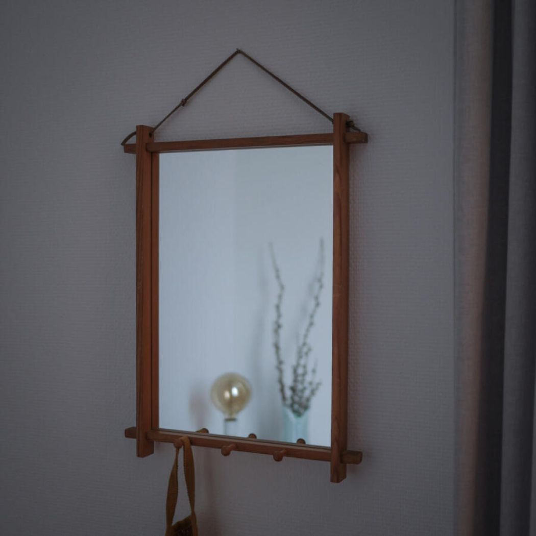 Et helt utroligt skønt retro spejl i træ – det er jeg godt nok lidt forelsket i. Det har små knager forneden og hænges op i en enkel lys lædersnor. Skal dit sommerhus have lidt retro stemning, så er dette spejl helt perfekt! Retro, når det er allerbedst!