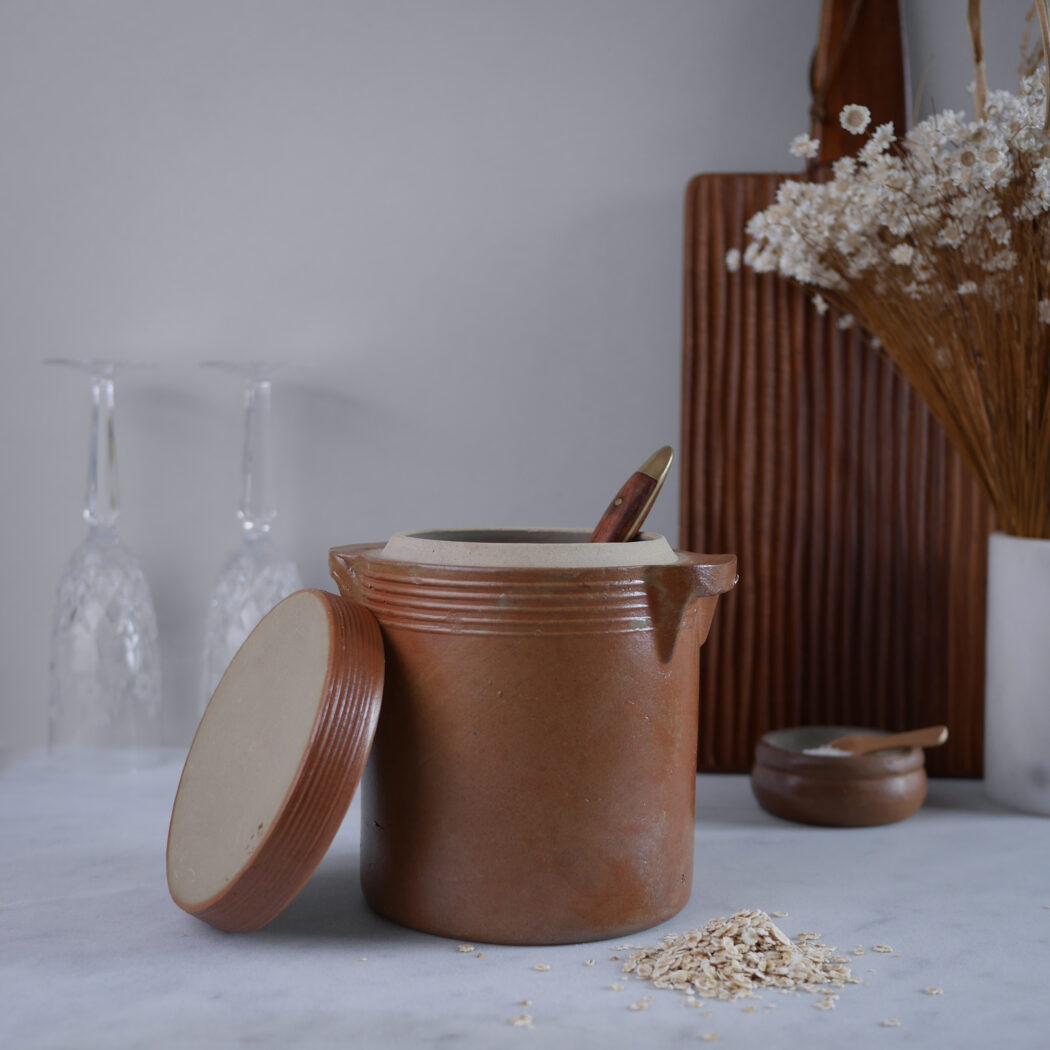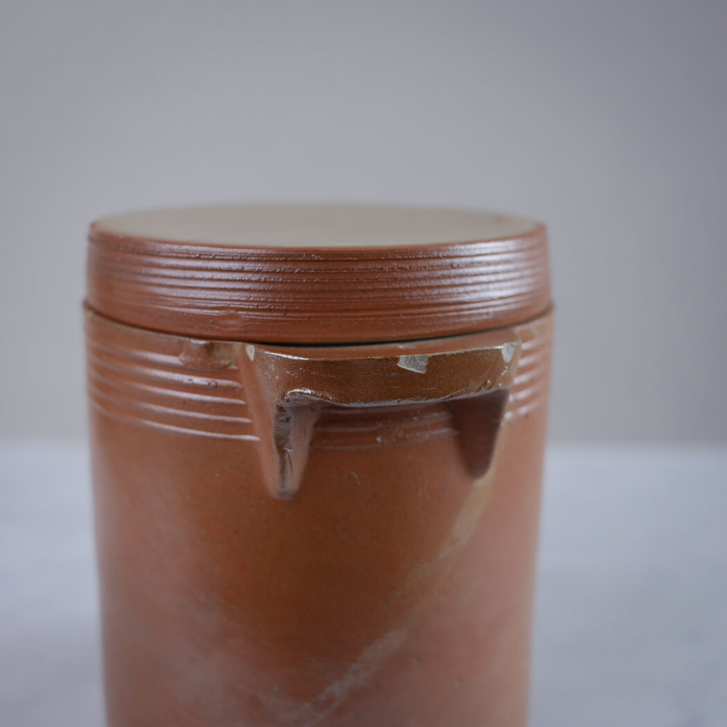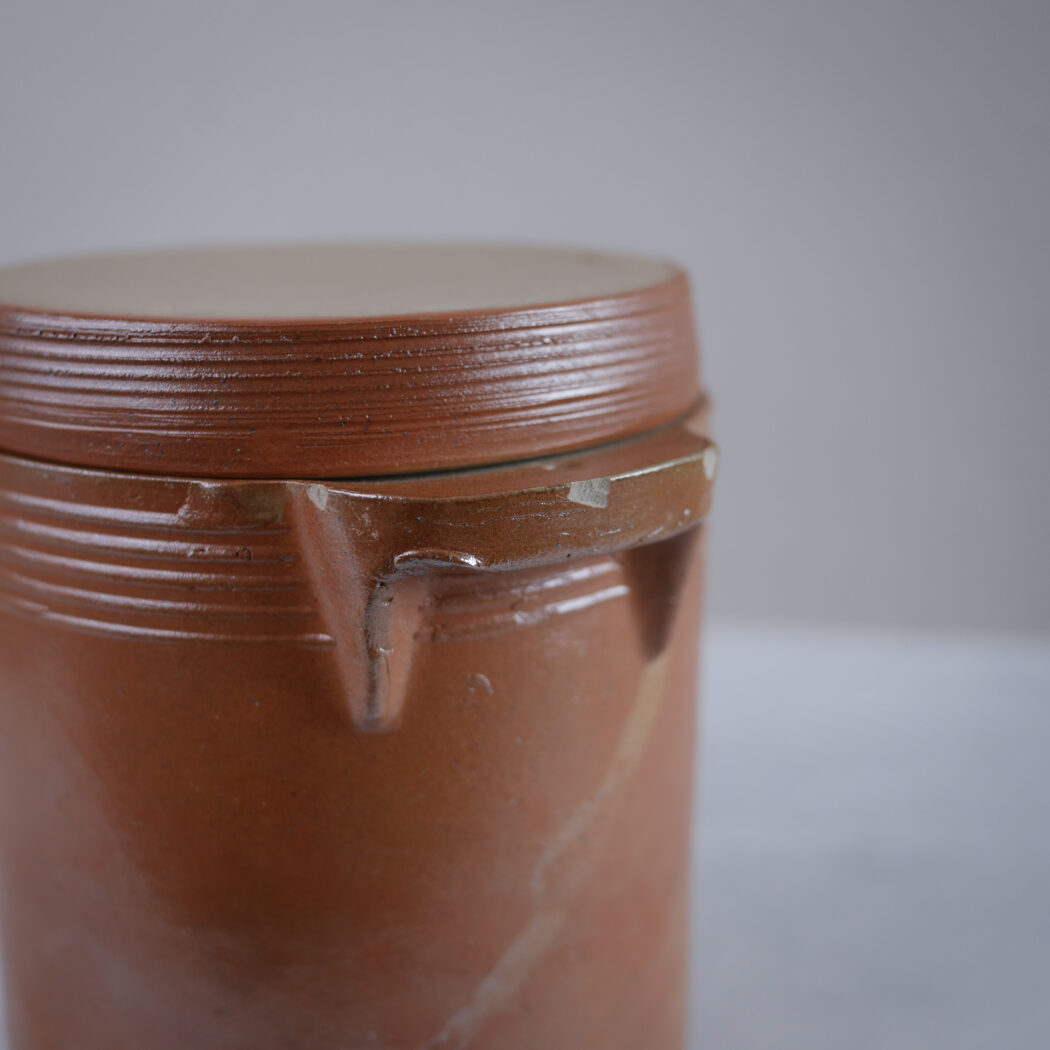 En lækker rustik brun fransk keramik krukke med praktisk låg til opbevaring i køkkenet. Lækker fransk keramik i en varm brun nuance. Obs. lille nag, se detalje foto. Et fund fra Sverige.