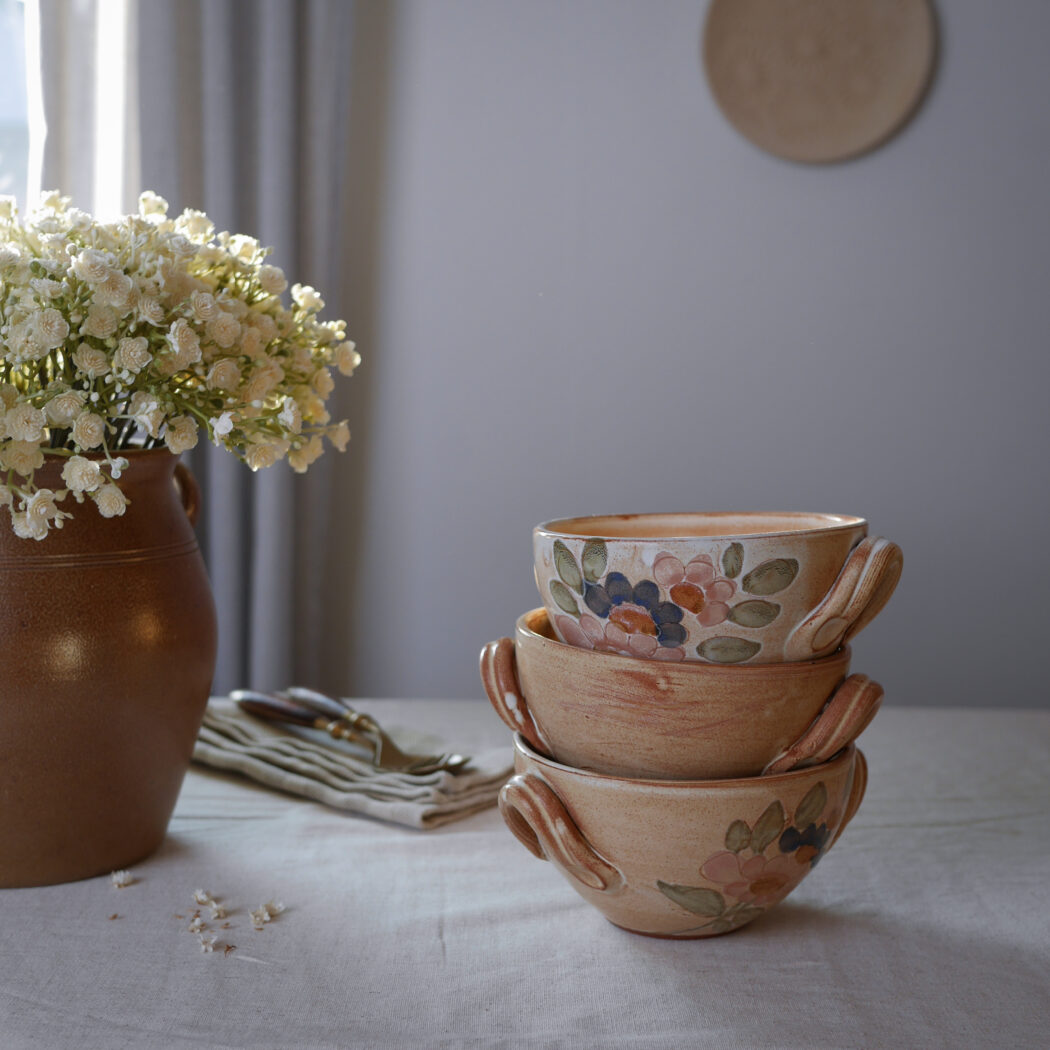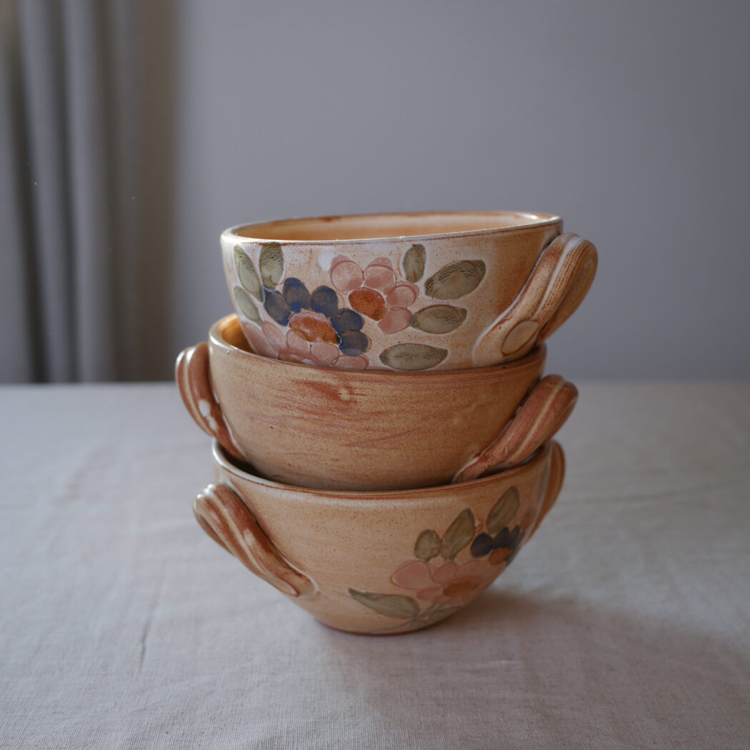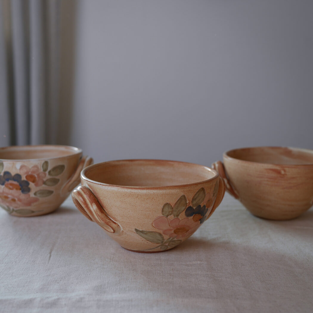 Et samling smukke franske skåle i keramik med blomster motiv. En fin lys beige glasur med masser af spil i farvenuancerne. Skålene har små pyntehanke og en god størrelse til en portion morgenmad, salat eller tilbehør til bordet. 6 stk. fundet i Sverige, de sælges i sæt af 3 stk.
