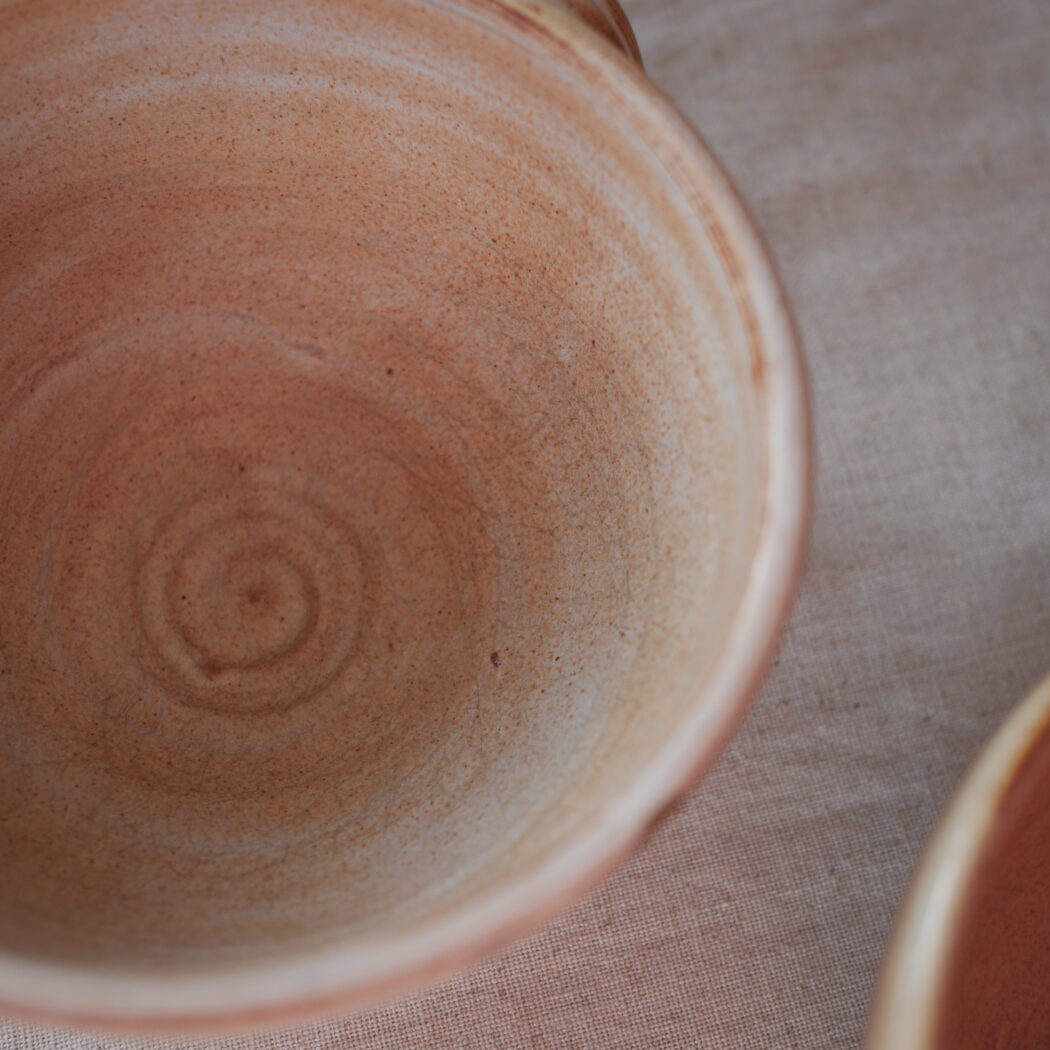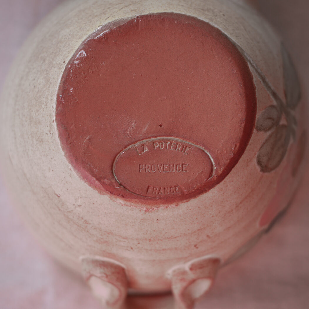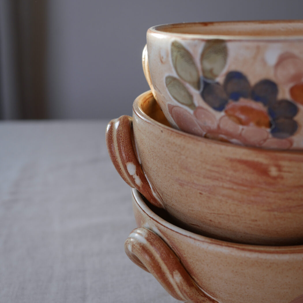 Et samling smukke franske skåle i keramik med blomster motiv. En fin lys beige glasur med masser af spil i farvenuancerne. Skålene har små pyntehanke og en god størrelse til en portion morgenmad, salat eller tilbehør til bordet. 6 stk. fundet i Sverige, de sælges i sæt af 3 stk.
