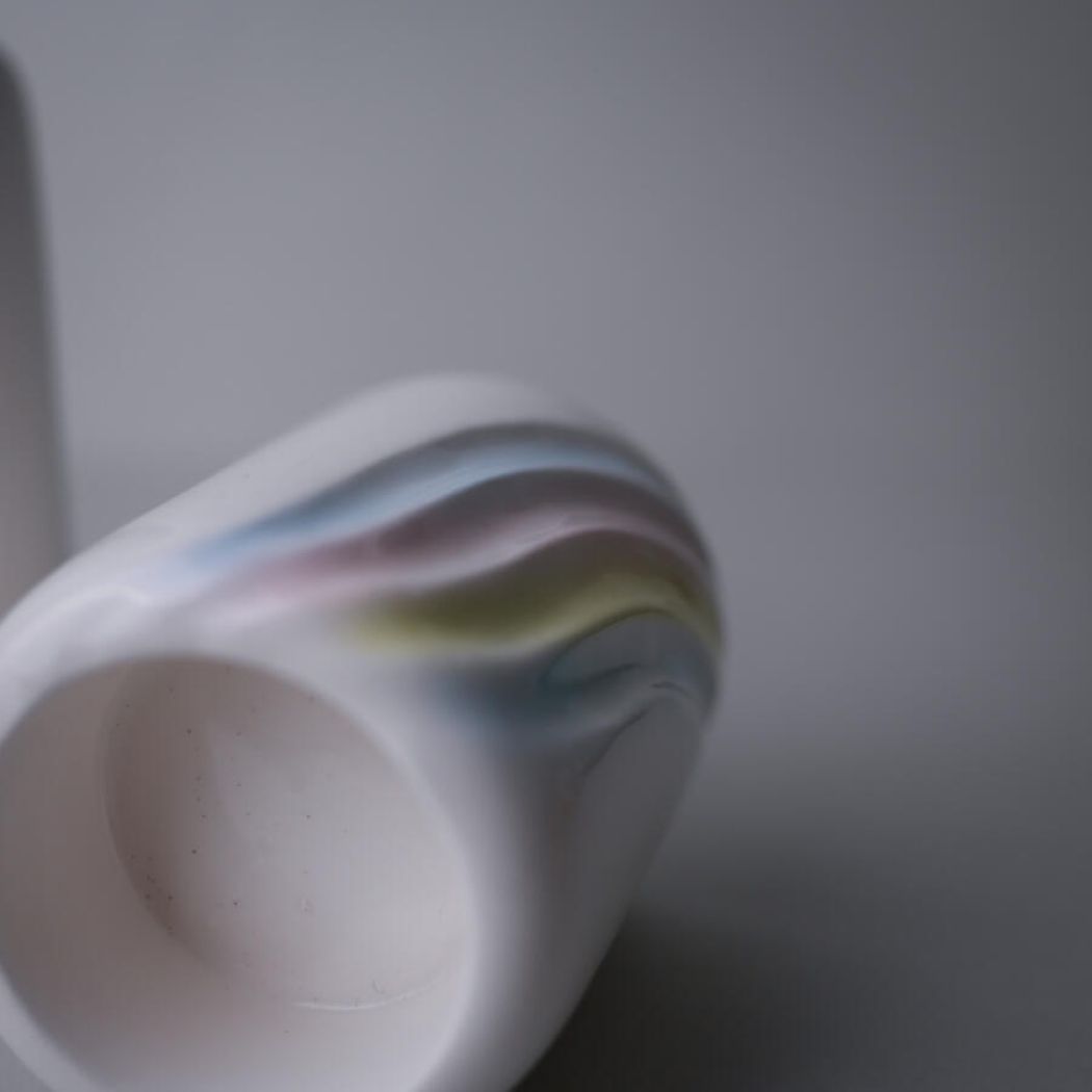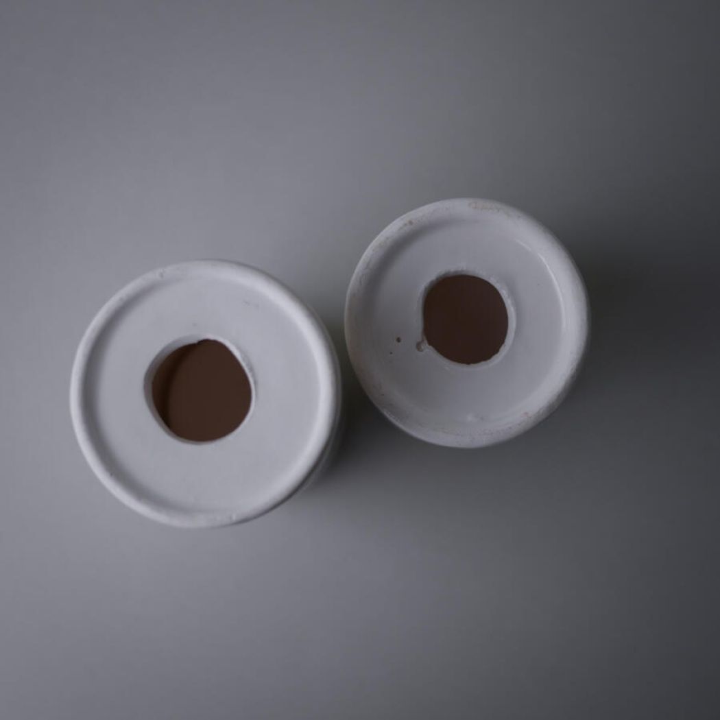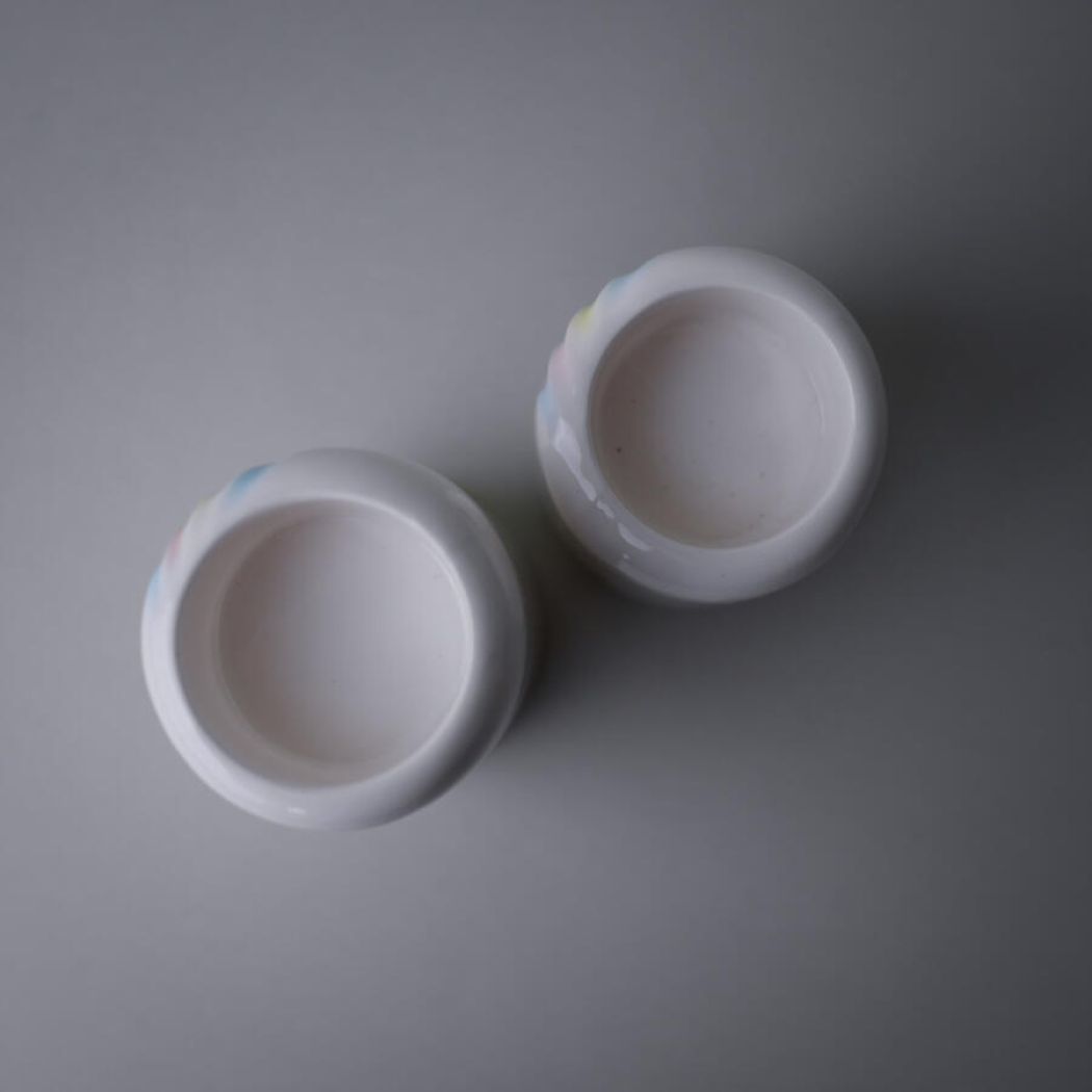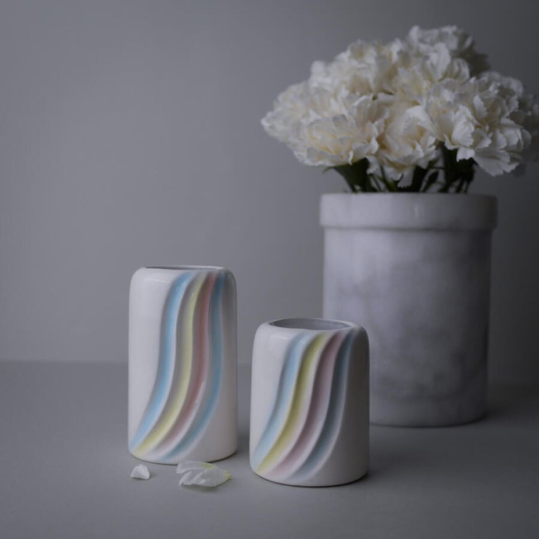 Flotte hvide porcelæns fyrfadsstager med pastelstriber, som en hel regnbue af pastelfarver. Fine og feminine lysestager med et skønt retro look. 2 stk. haves, sælges samlet.