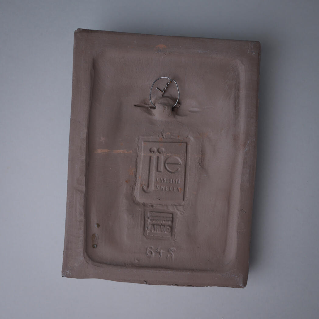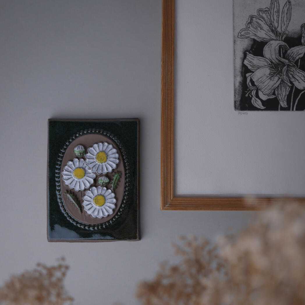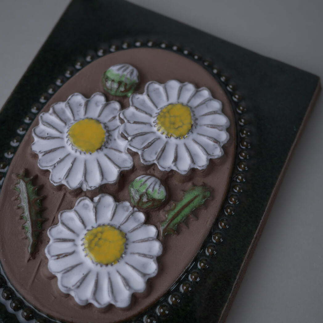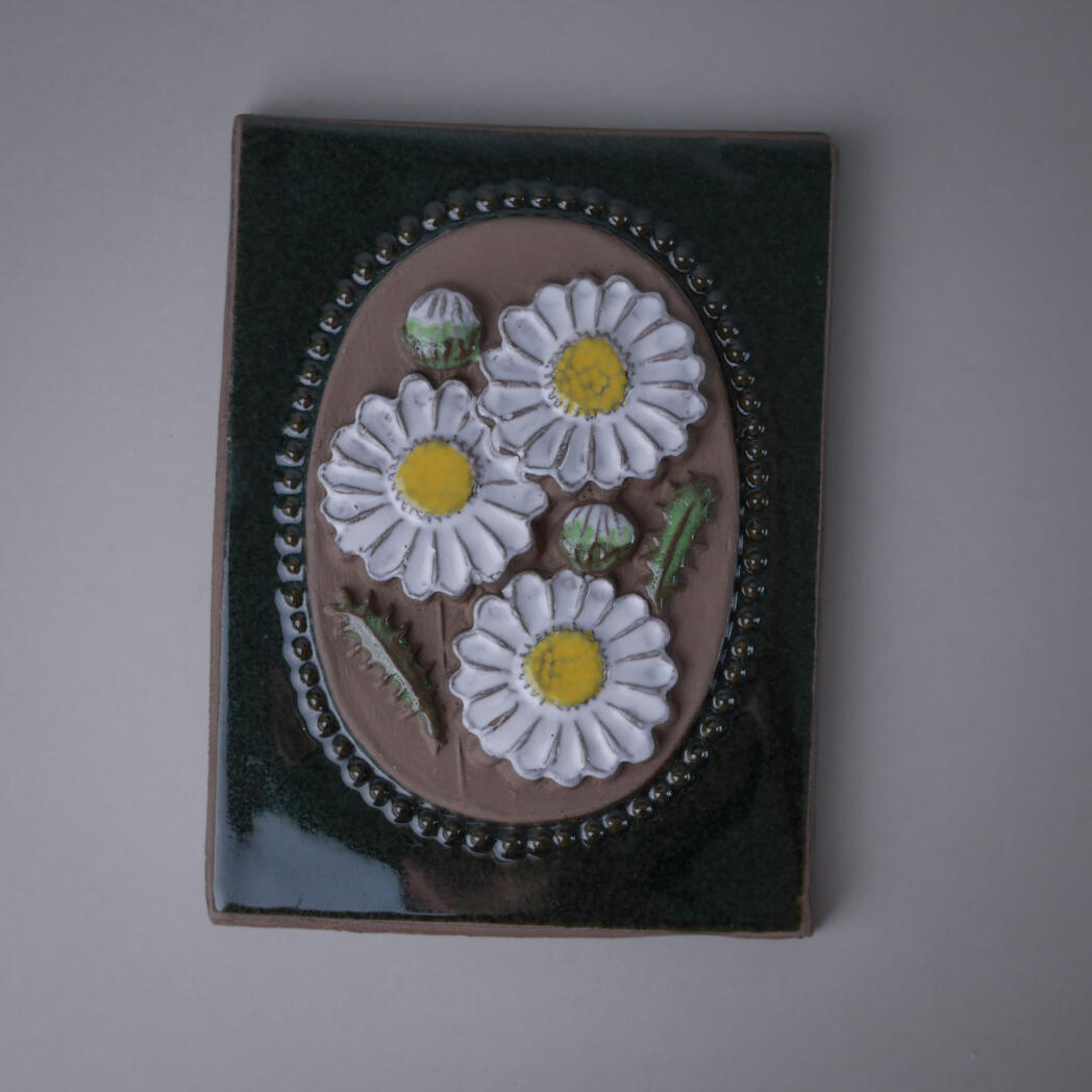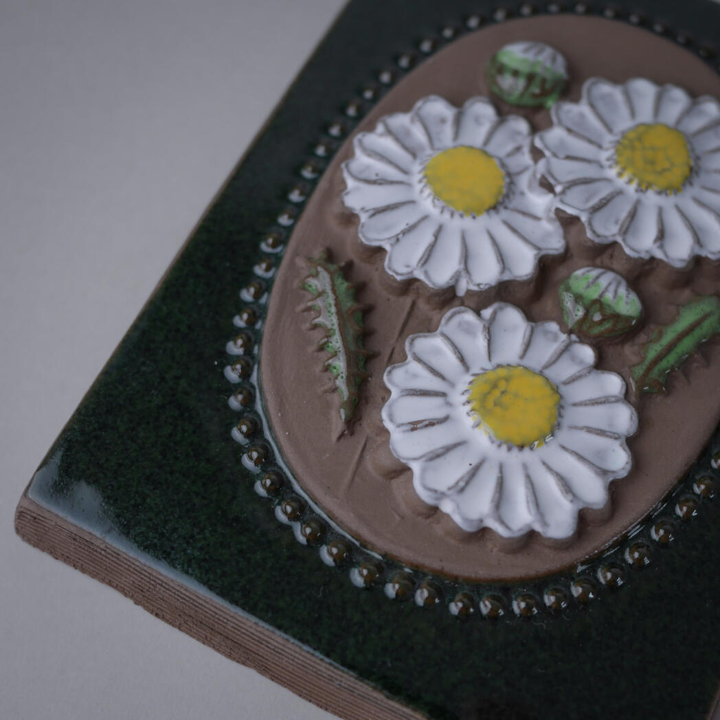 Et fint grønt keramik relief med hvide blomster. Den mørkegrønne baggrund får de smukke blomster til at træde frem, og det giver blikfang på væggen. Relieffet er fundet i Sverige.
