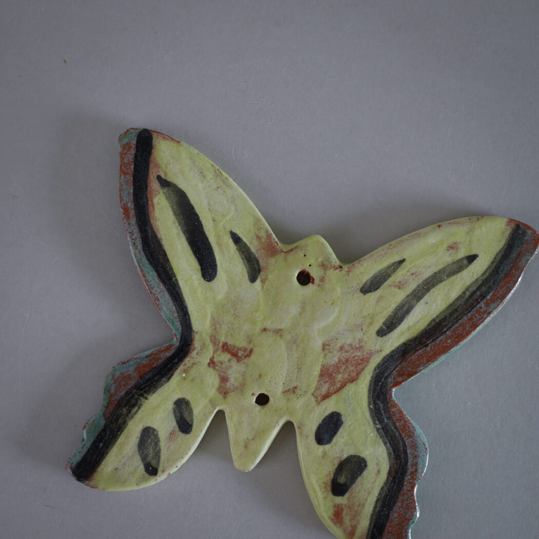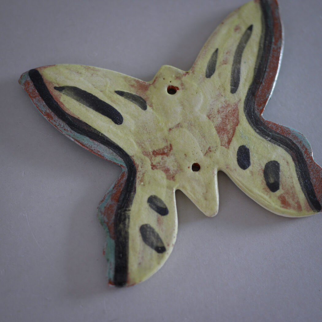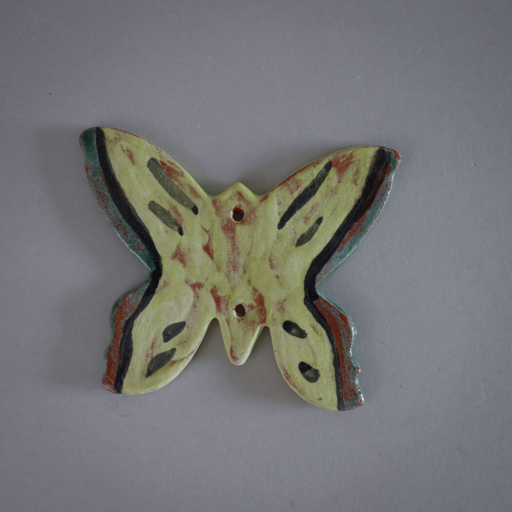 En sød lille gul keramik sommerfugl til ophæng. Hæng den på et lille søm, og giv din billedvæg kulør og personlighed eller sæt en lille fin snor i, så den kan hænge på et skabsgreb. Et fund fra Sverige.