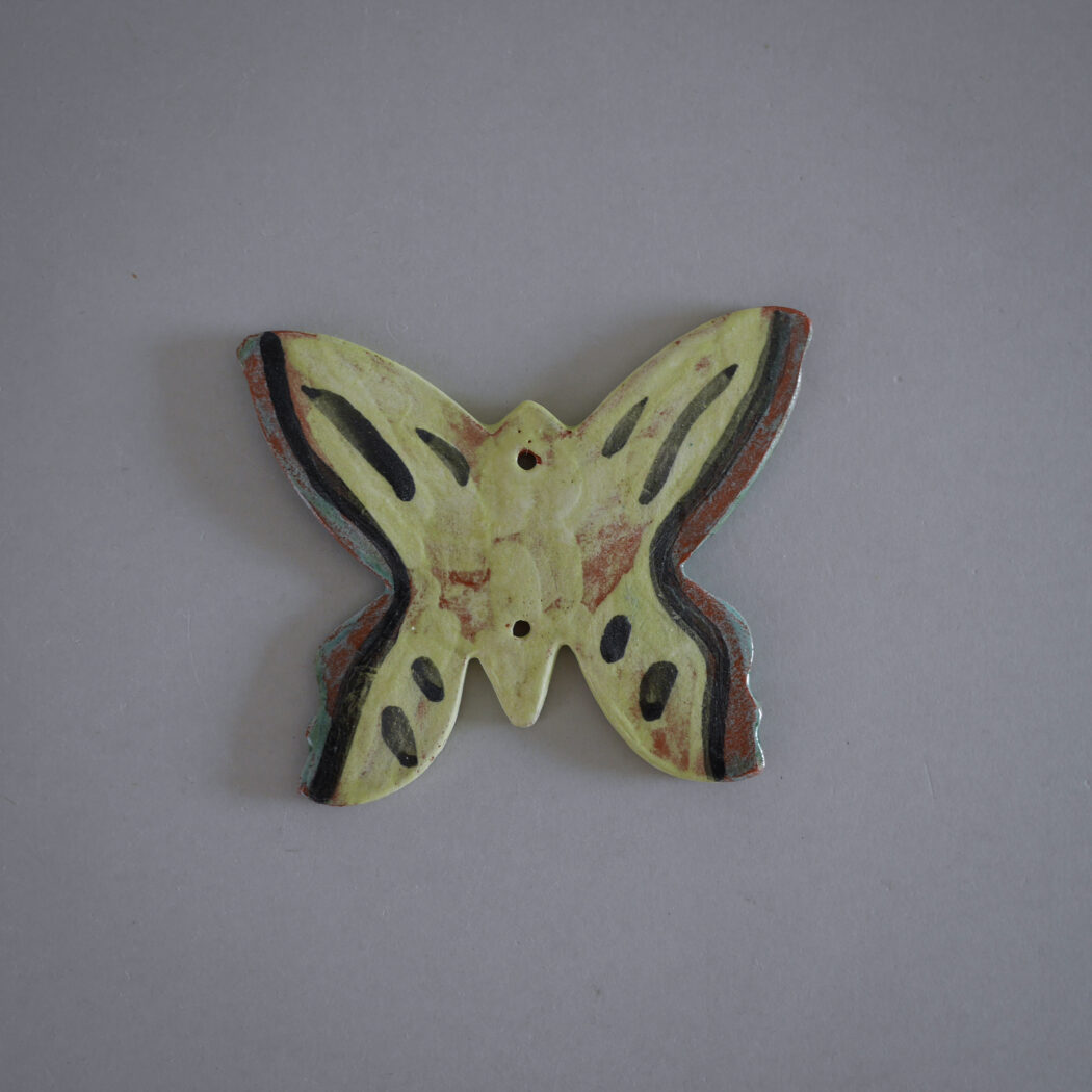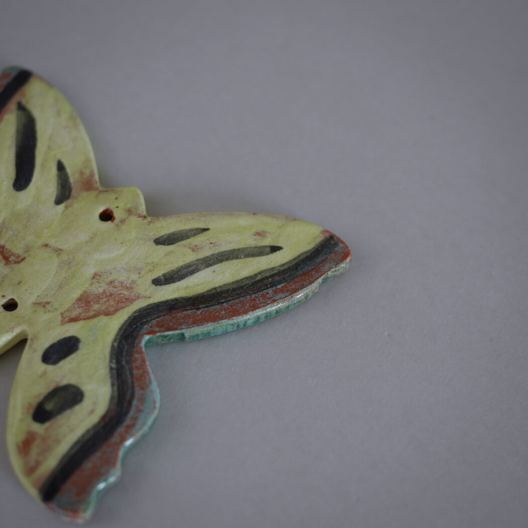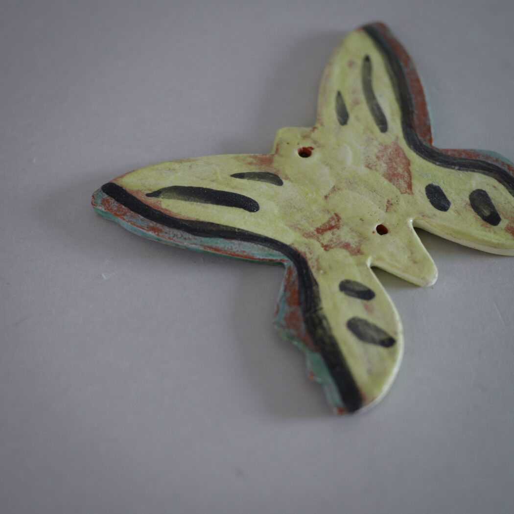 En sød lille gul keramik sommerfugl til ophæng. Hæng den på et lille søm, og giv din billedvæg kulør og personlighed eller sæt en lille fin snor i, så den kan hænge på et skabsgreb. Et fund fra Sverige.