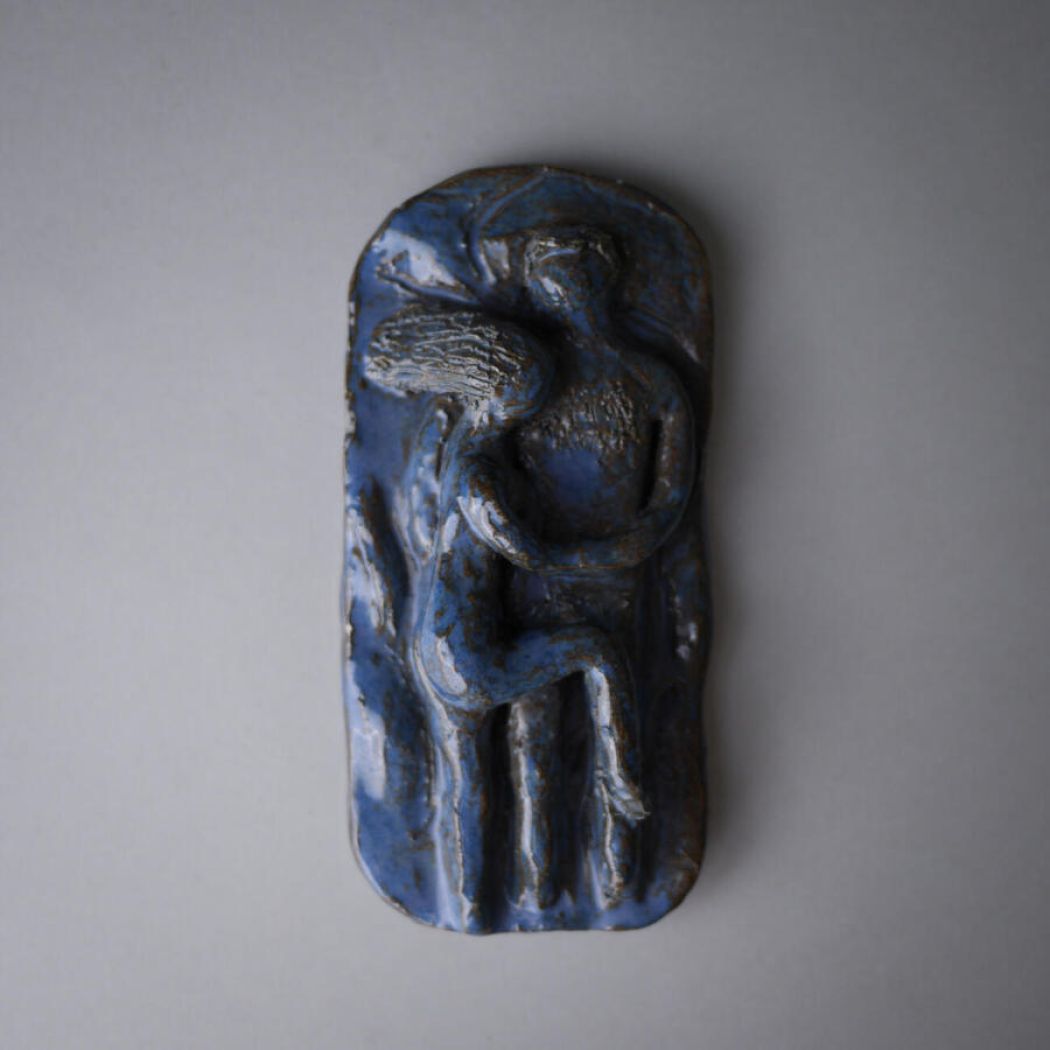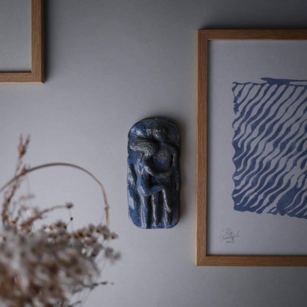 Her kommer et sandt unika relief til væggen i den smukkeste blå farve med brunlige nuancer, som nemt passer ind i indretningen. Det er håndlavet med motivet af et par – det er bare helt igennem vidunderligt! Unikke ting til væggen er i høj kurs, og der er langt i mellem, at man finder så skønt et eksemplar. Jeg medsender ophæng til væggen.
