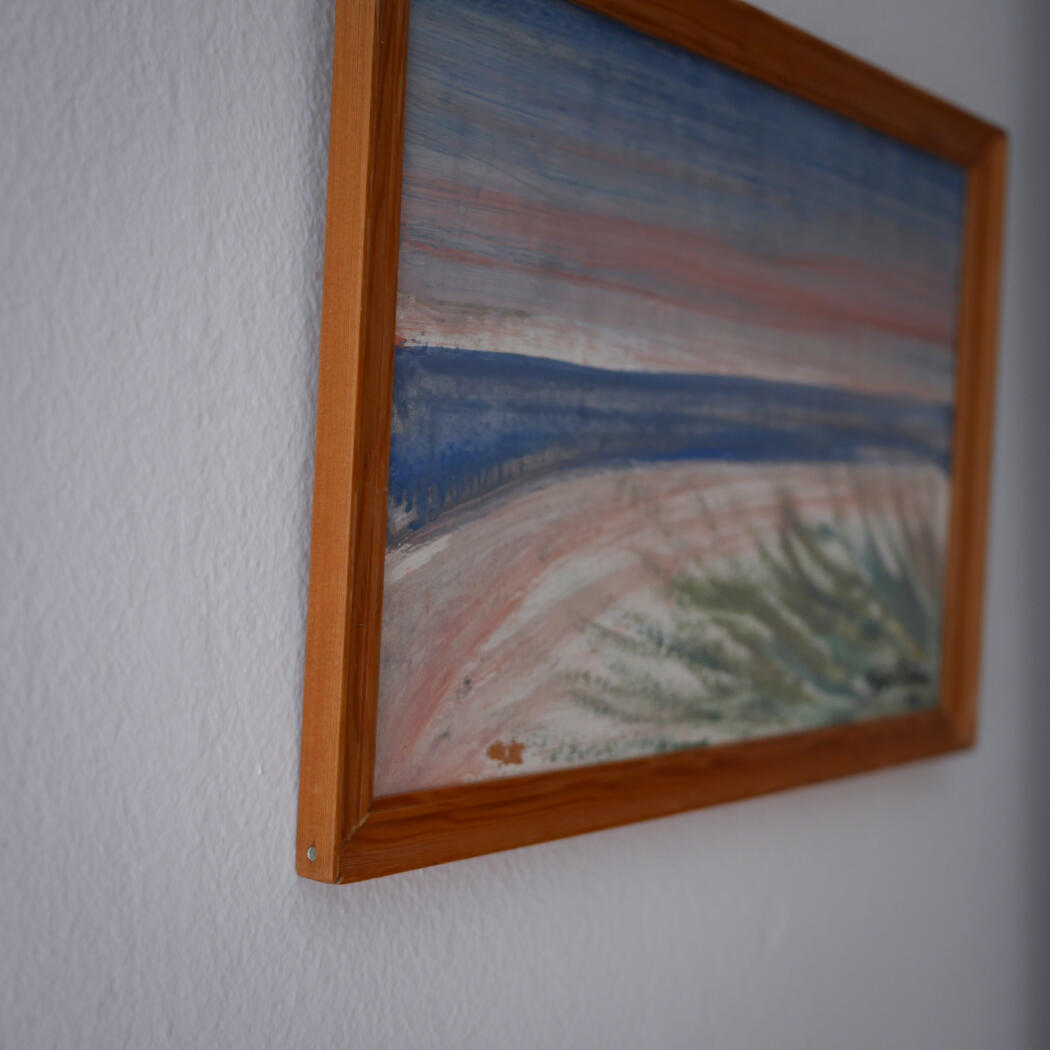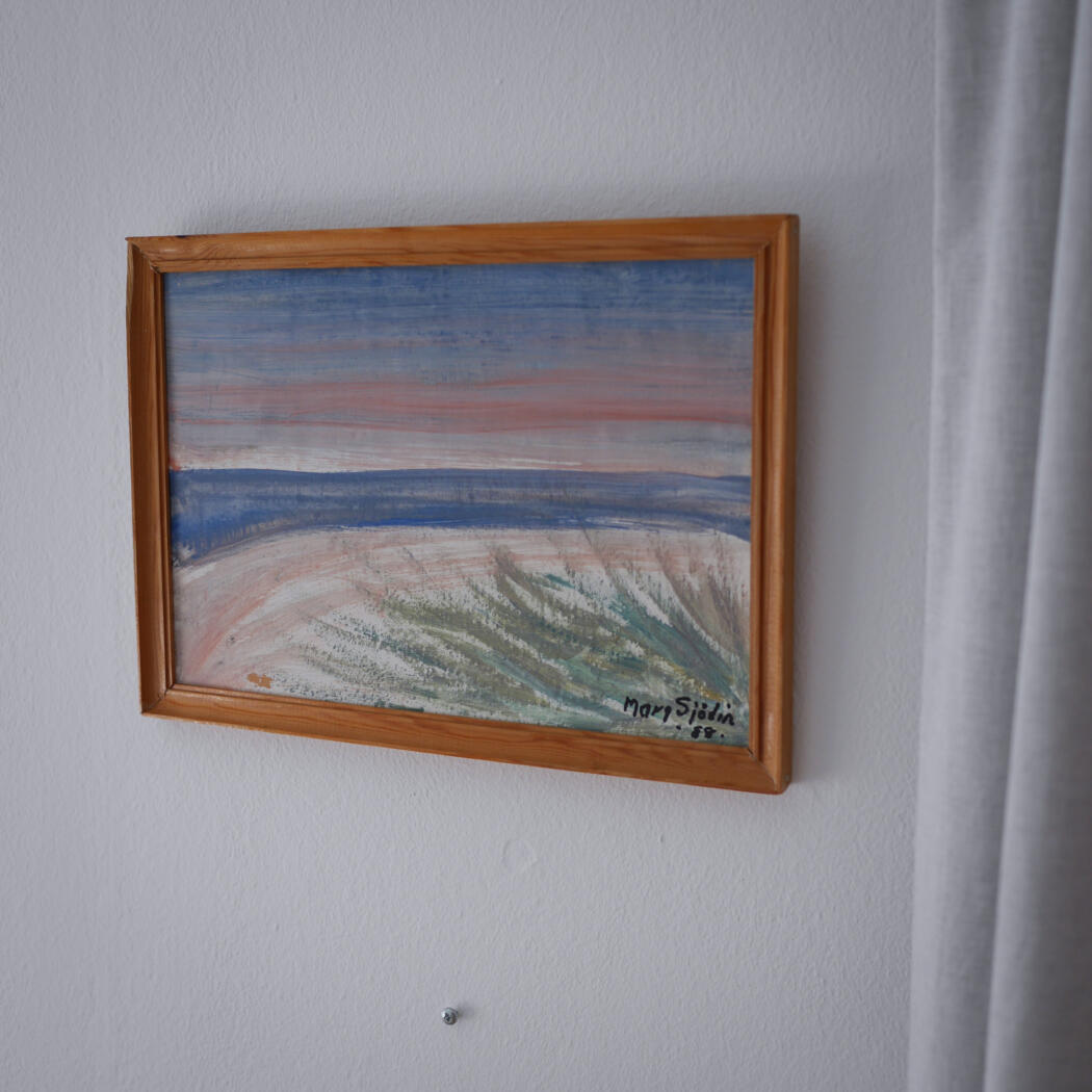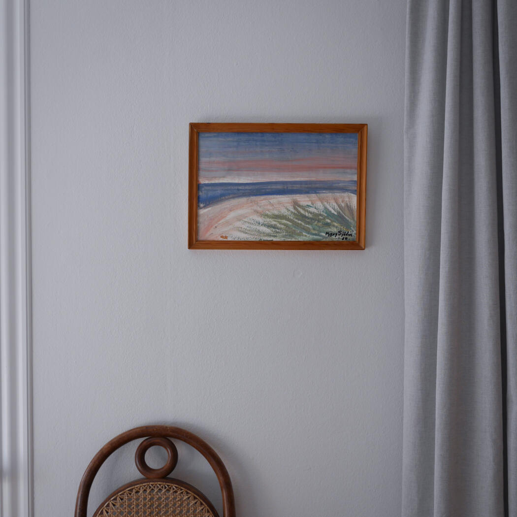 Et charmerende håndmalet billede af strand i smukke pastelfarver. Et håndlavet fund, som dette, giver indretningen personlighed og særpræg. Billedet er fundet i Sverige.