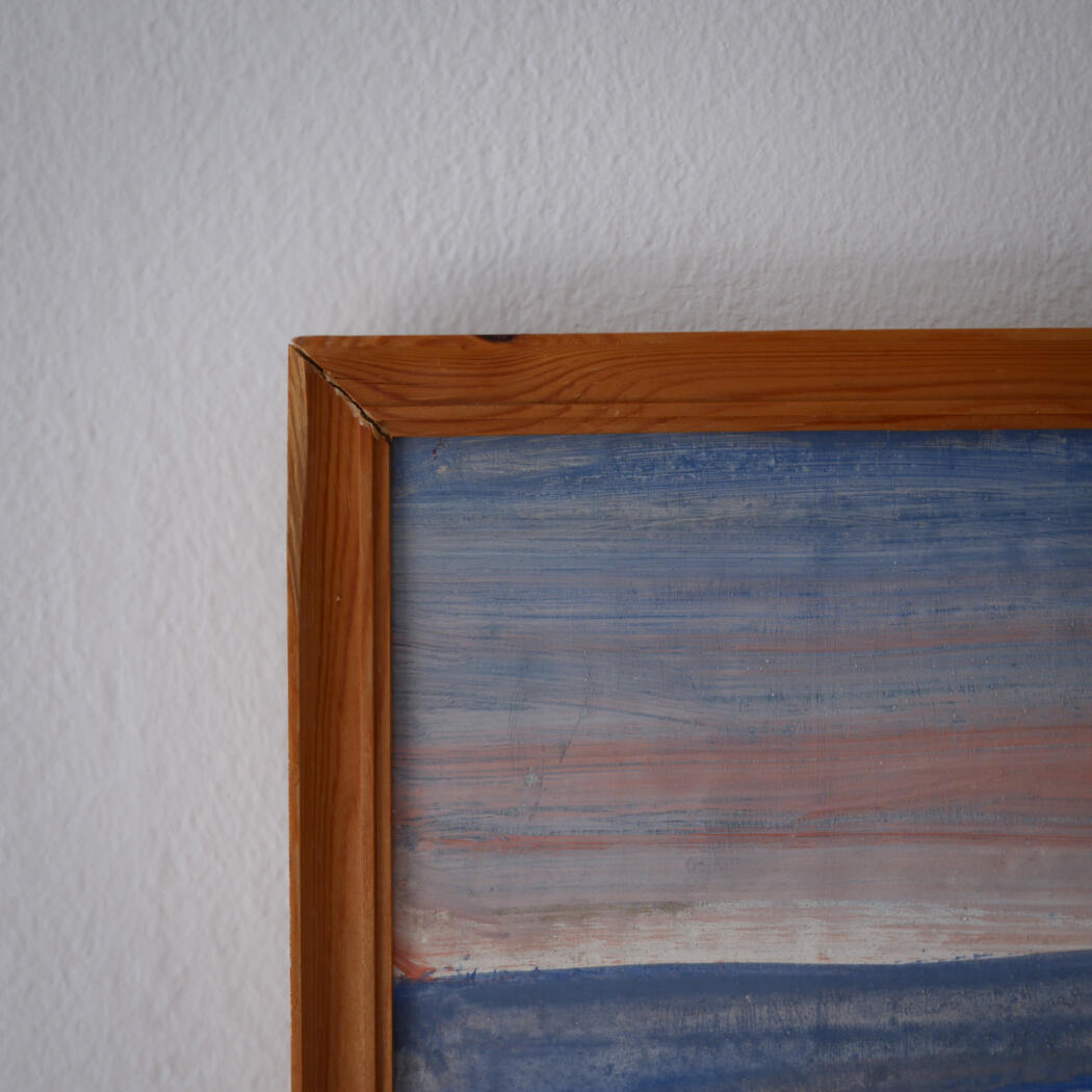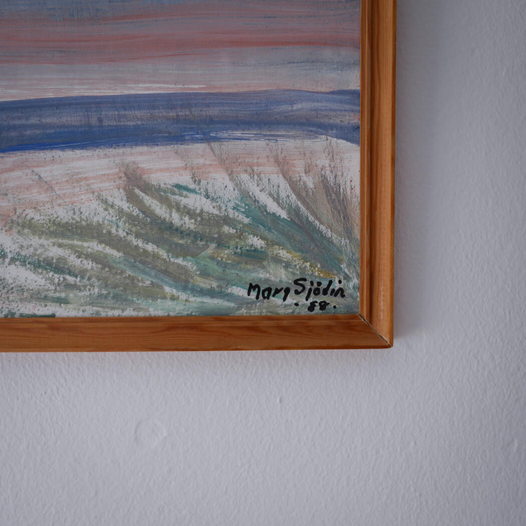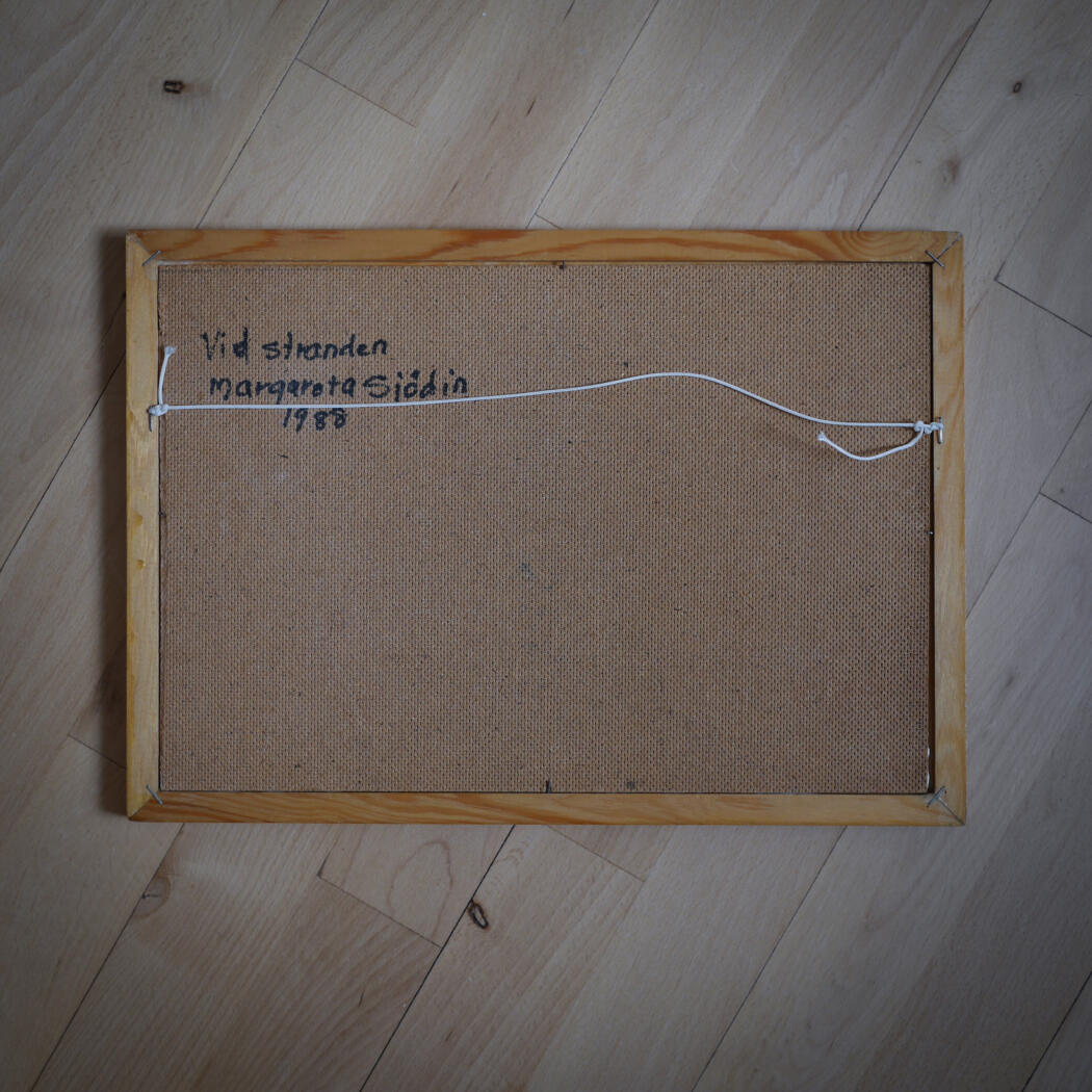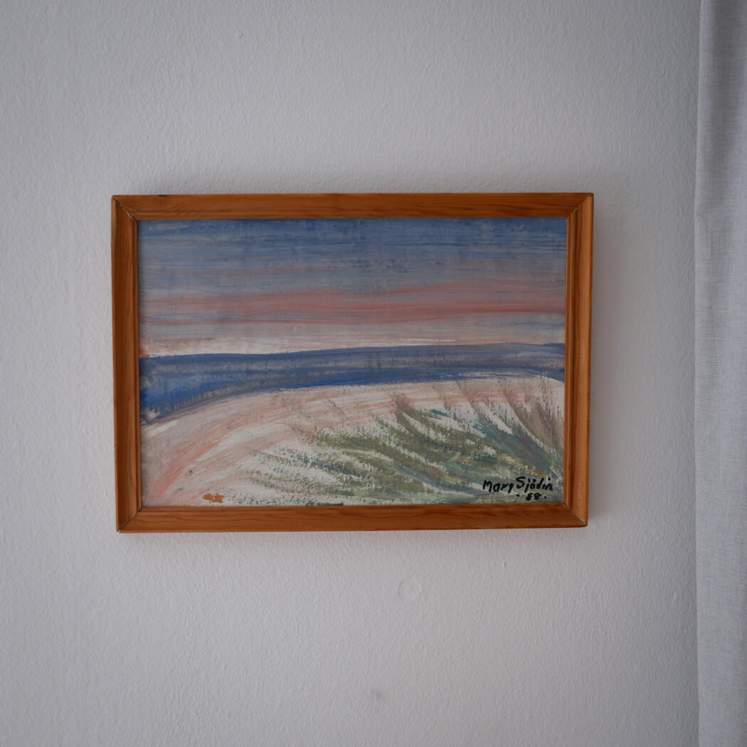 Et charmerende håndmalet billede af strand i smukke pastelfarver. Et håndlavet fund, som dette, giver indretningen personlighed og særpræg. Billedet er fundet i Sverige.