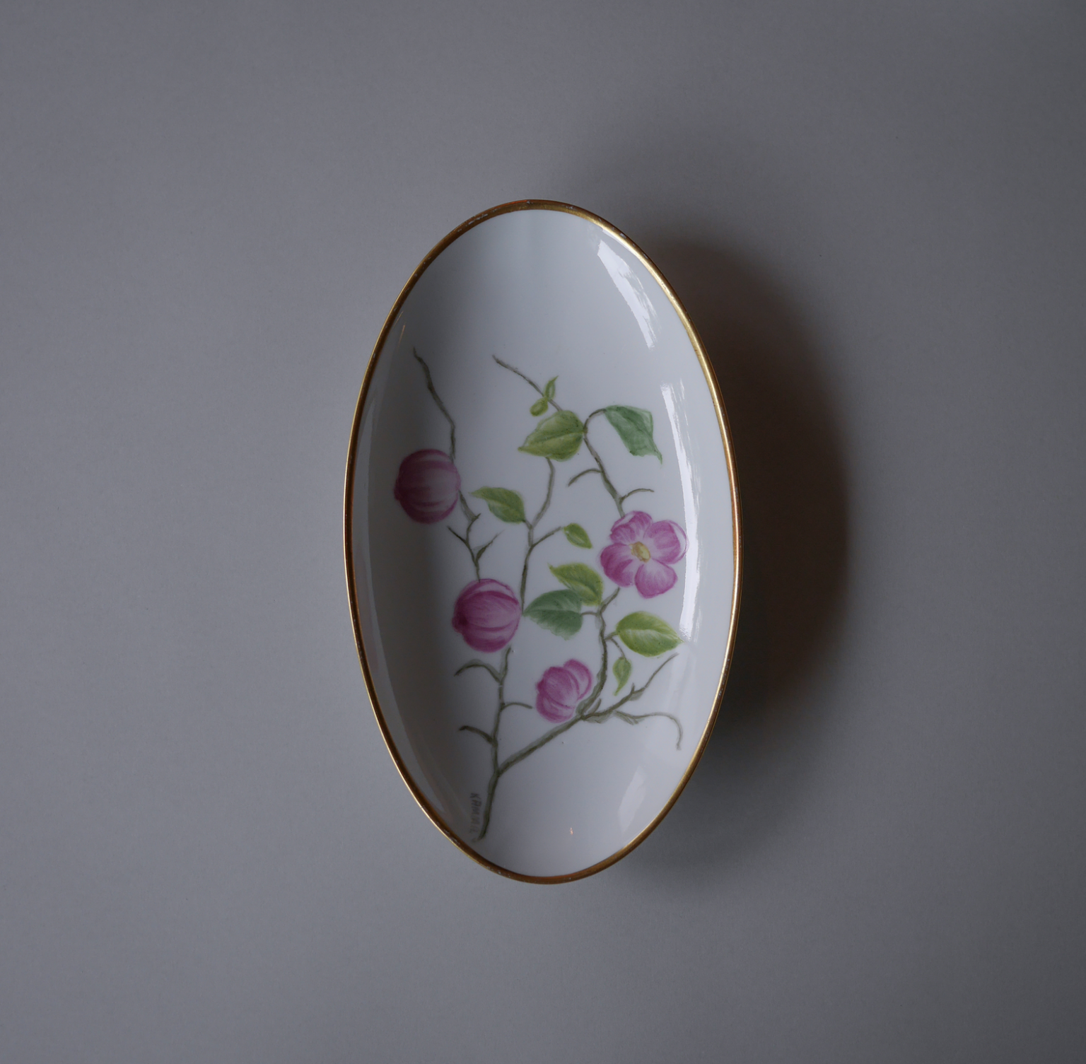 Det fineste ovale fad med guldkant og håndmalede pink blomster. Jeg er så vild med håndmalede fund, de er unikke og tænk en eller anden kreativ sjæl har siddet og skabt så fine motiver for år tilbage. Kombiner med andre fine håndmalede skåle og fade for et unikt sommerbord.