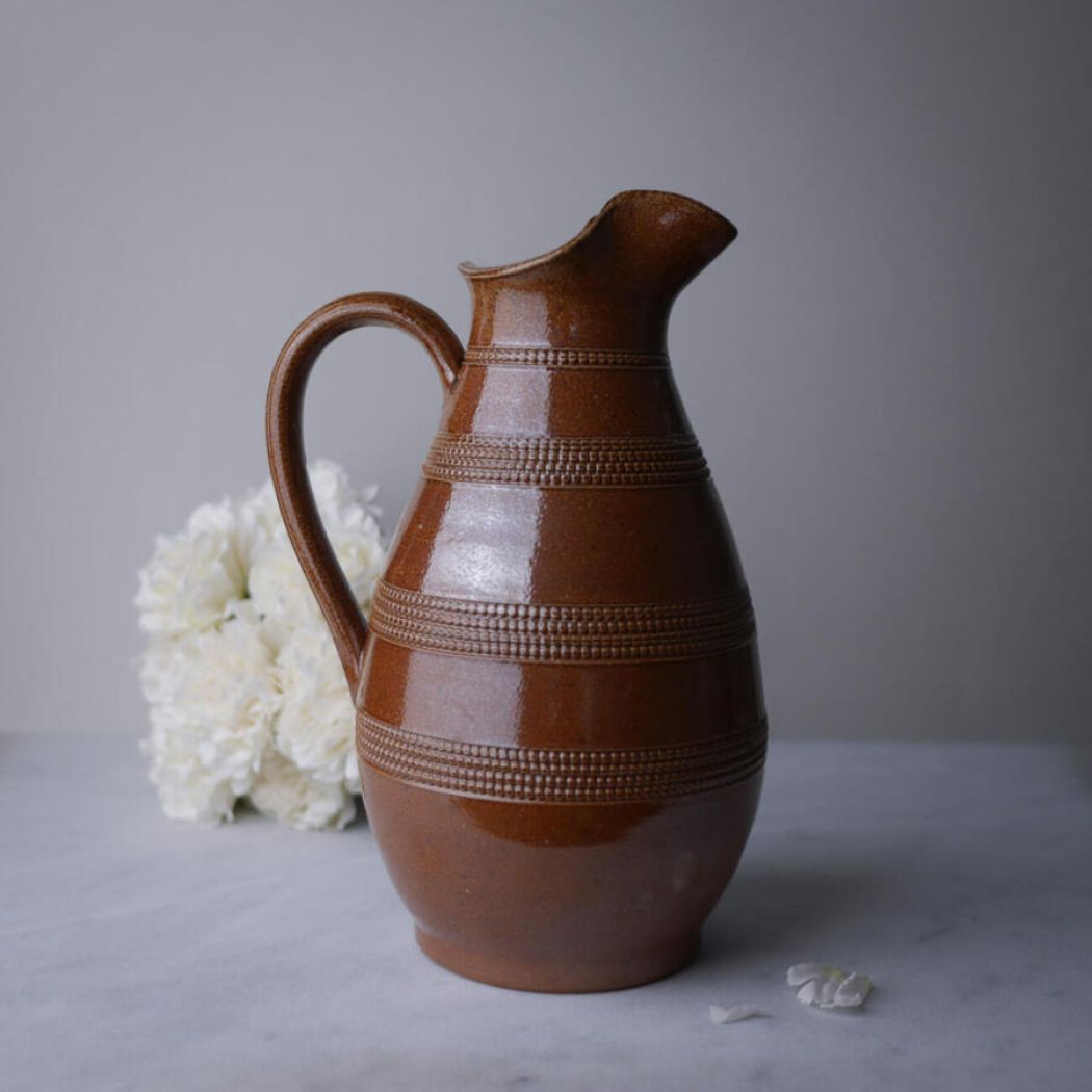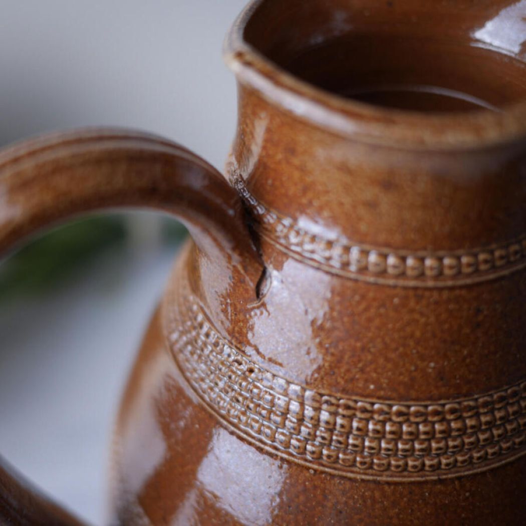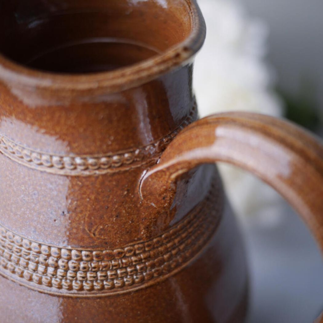 En helt utrolig smuk brun kande i keramik med mønstre i glasuren. Jeg blev vild med den fra første øjekast, men desværre gik hanken løs, da jeg vaskede den og efterfølgende tørrede den i hånden. Denne kande er derfor udelukkende til dekoration. Det kan ikke ses, men hanken sidder lidt løst. Prisen er sat derefter.