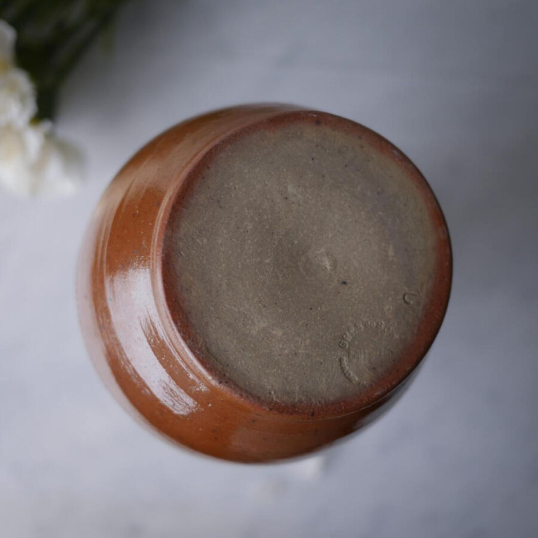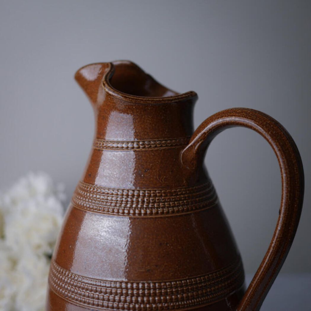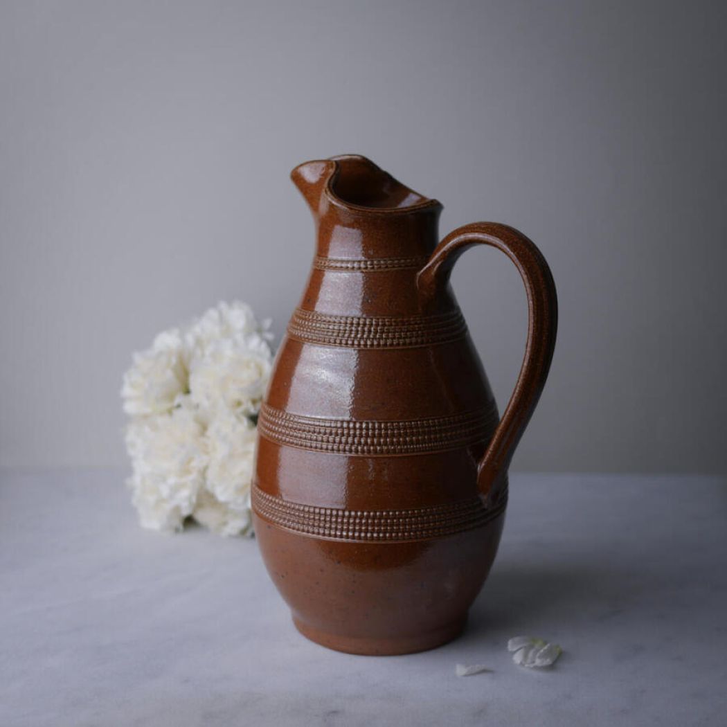 En helt utrolig smuk brun kande i keramik med mønstre i glasuren. Jeg blev vild med den fra første øjekast, men desværre gik hanken løs, da jeg vaskede den og efterfølgende tørrede den i hånden. Denne kande er derfor udelukkende til dekoration. Det kan ikke ses, men hanken sidder lidt løst. Prisen er sat derefter.