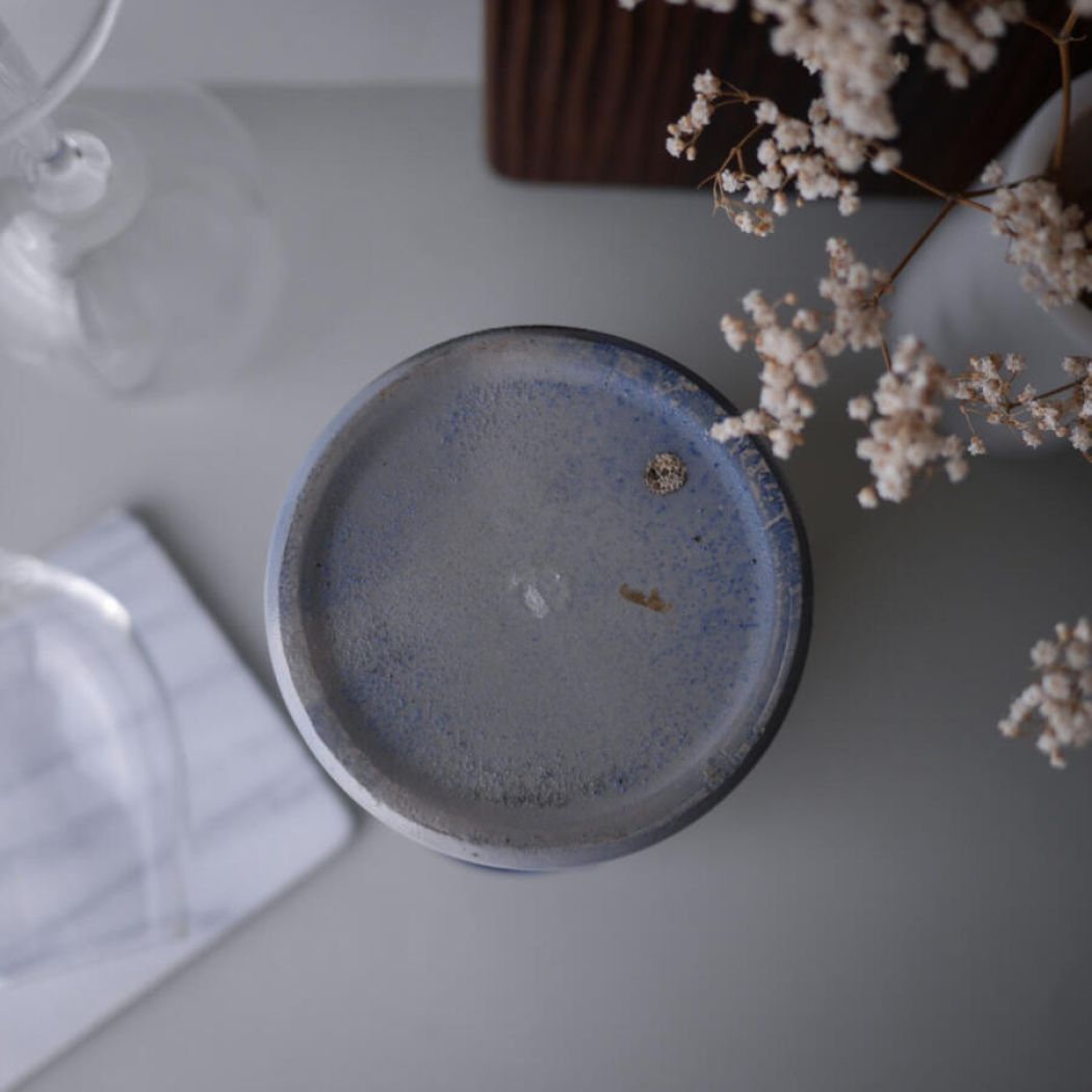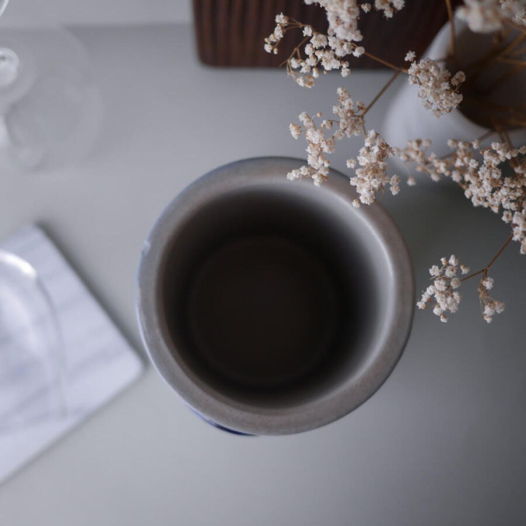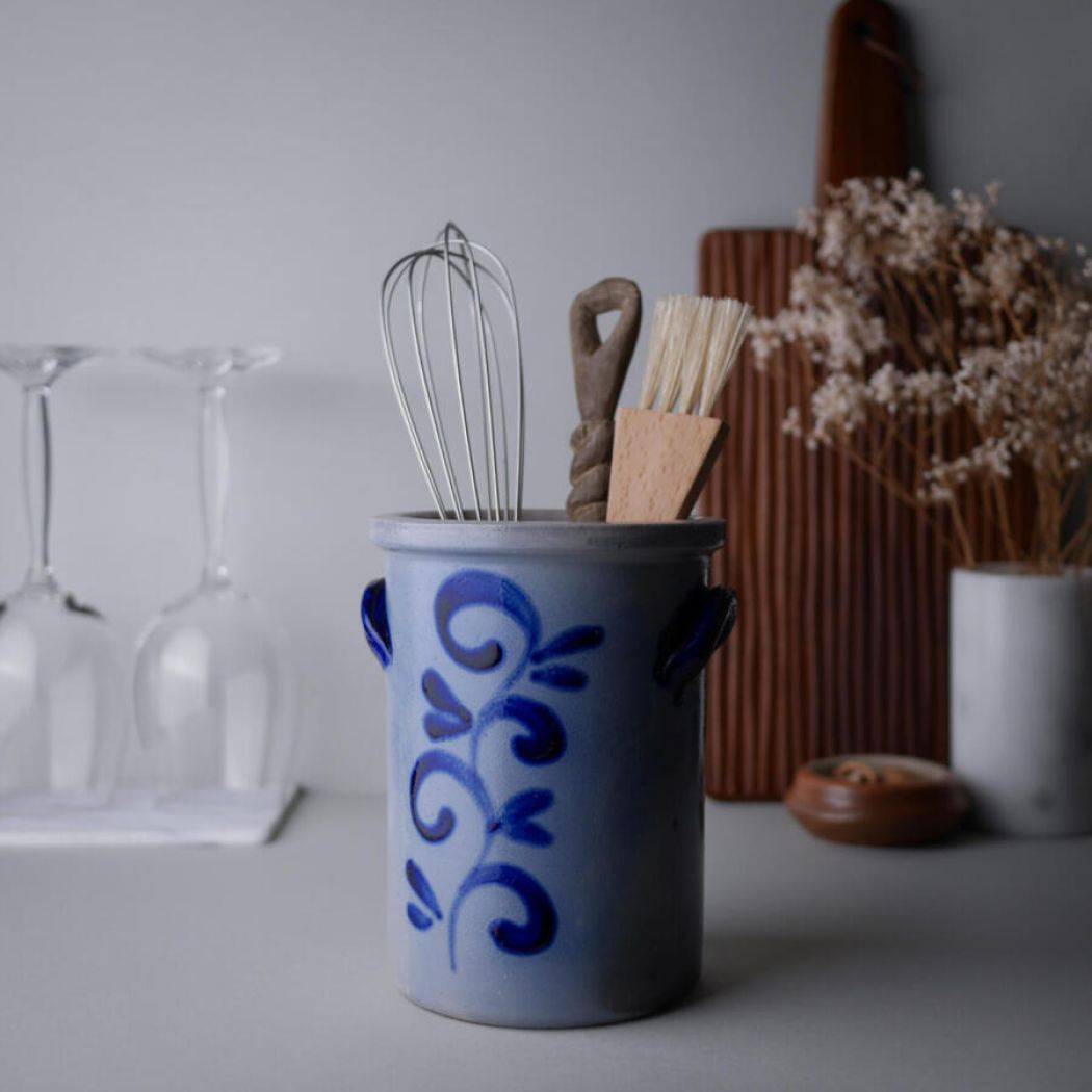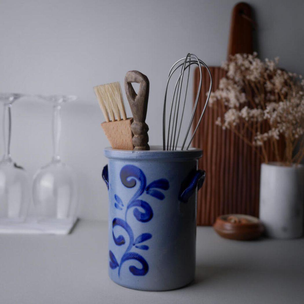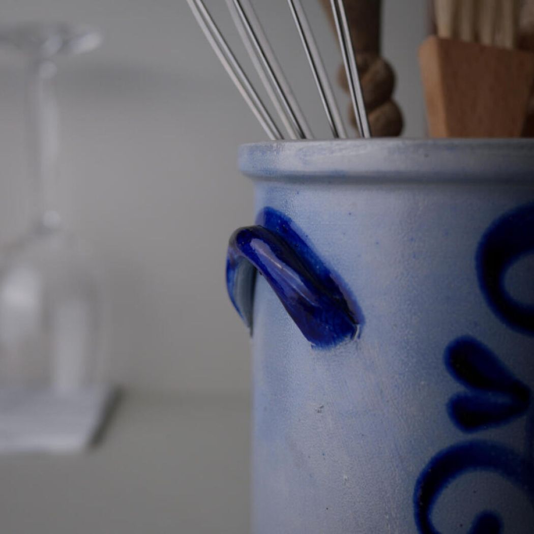 En virkelig flot høj keramikkrukke i en pæn grå nuance med klare mørkeblå detaljer og motiv. En dekorativ krukke, som er perfekt til opbevaring af køkkenredskaber på køkkenbordet – det giver køkkenet personlighed og skaber hygge.