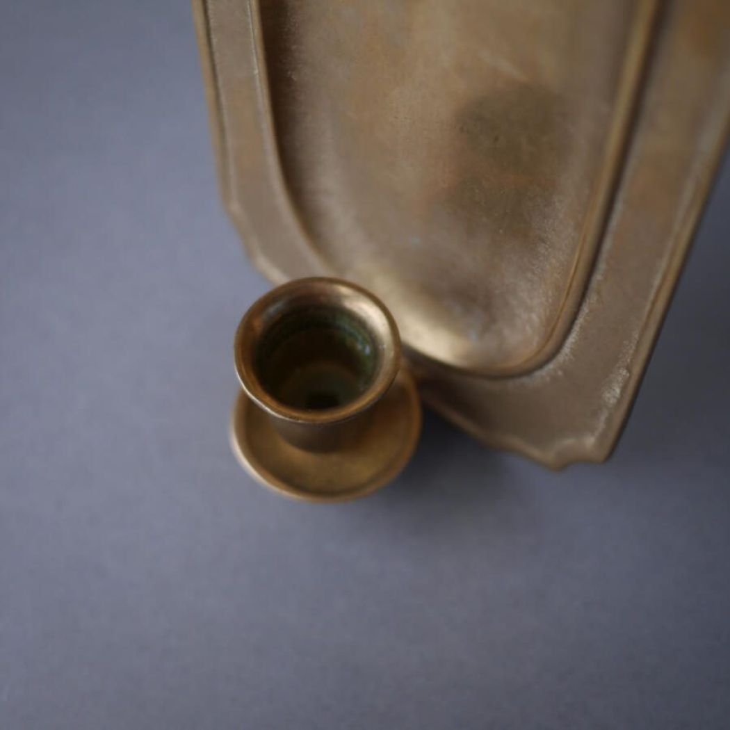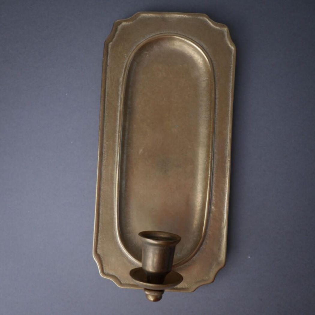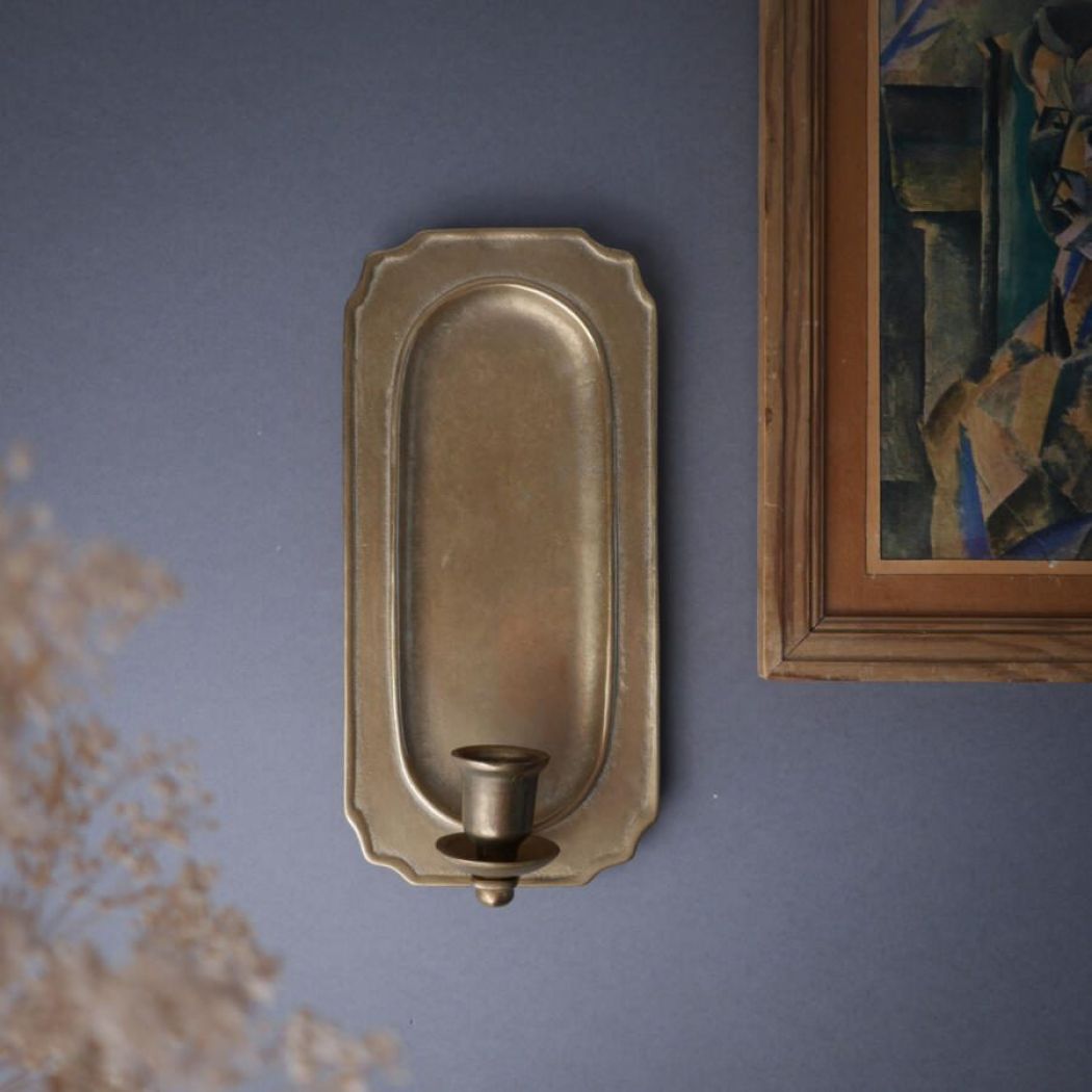En smuk høj messing vægstage i en lækker tung kvalitet. Enkel og dekorativ vægdekoration med plads til et kronelys. Et fint fund fra Fyn.