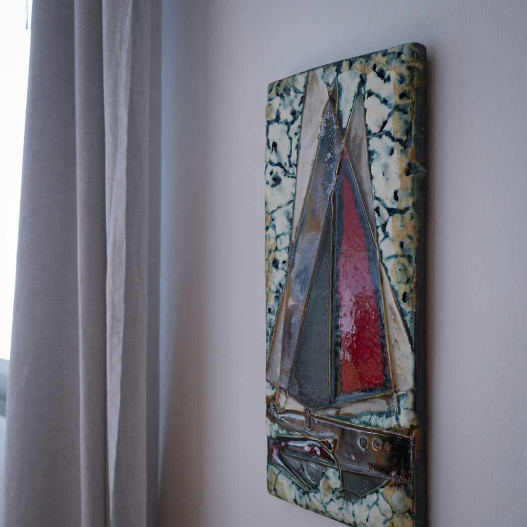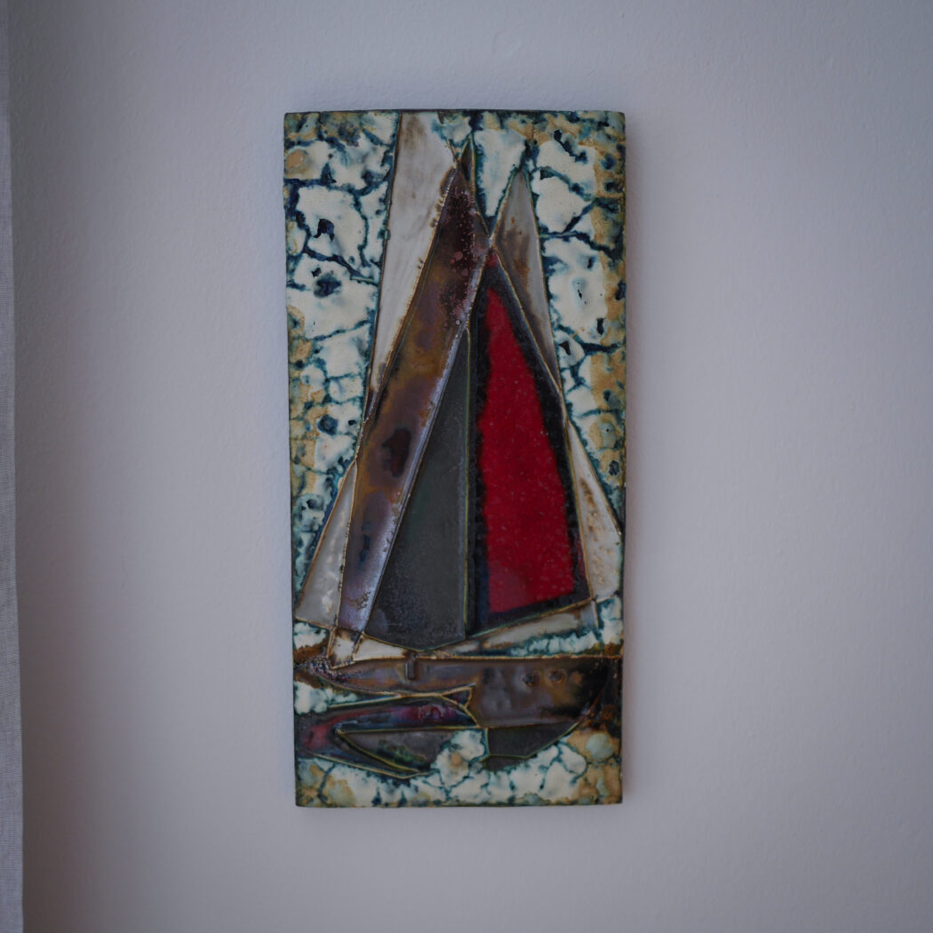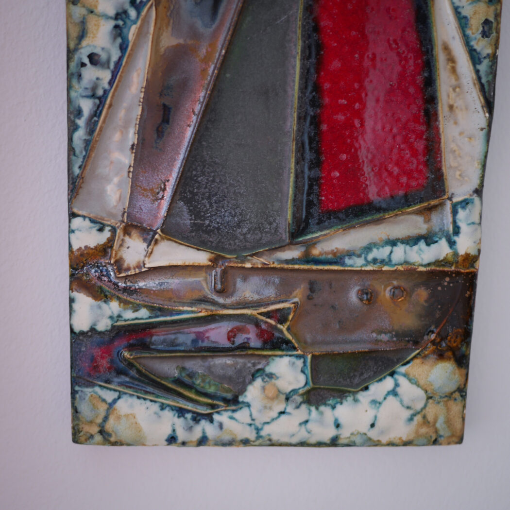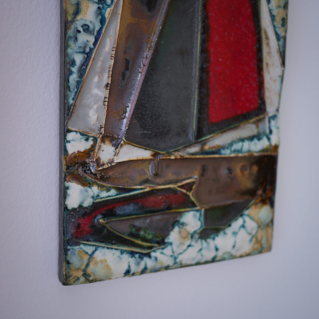 Et utrolig flot højt relief med skibsmotiv i de smukkeste nuancer. Relieffet er skabt på en måde, så det virkelig træder frem på væggen – kæmpe blikfang. Det røde og brune skib på den grønlige baggrund, så flot! Relieffet er fundet i Sverige.