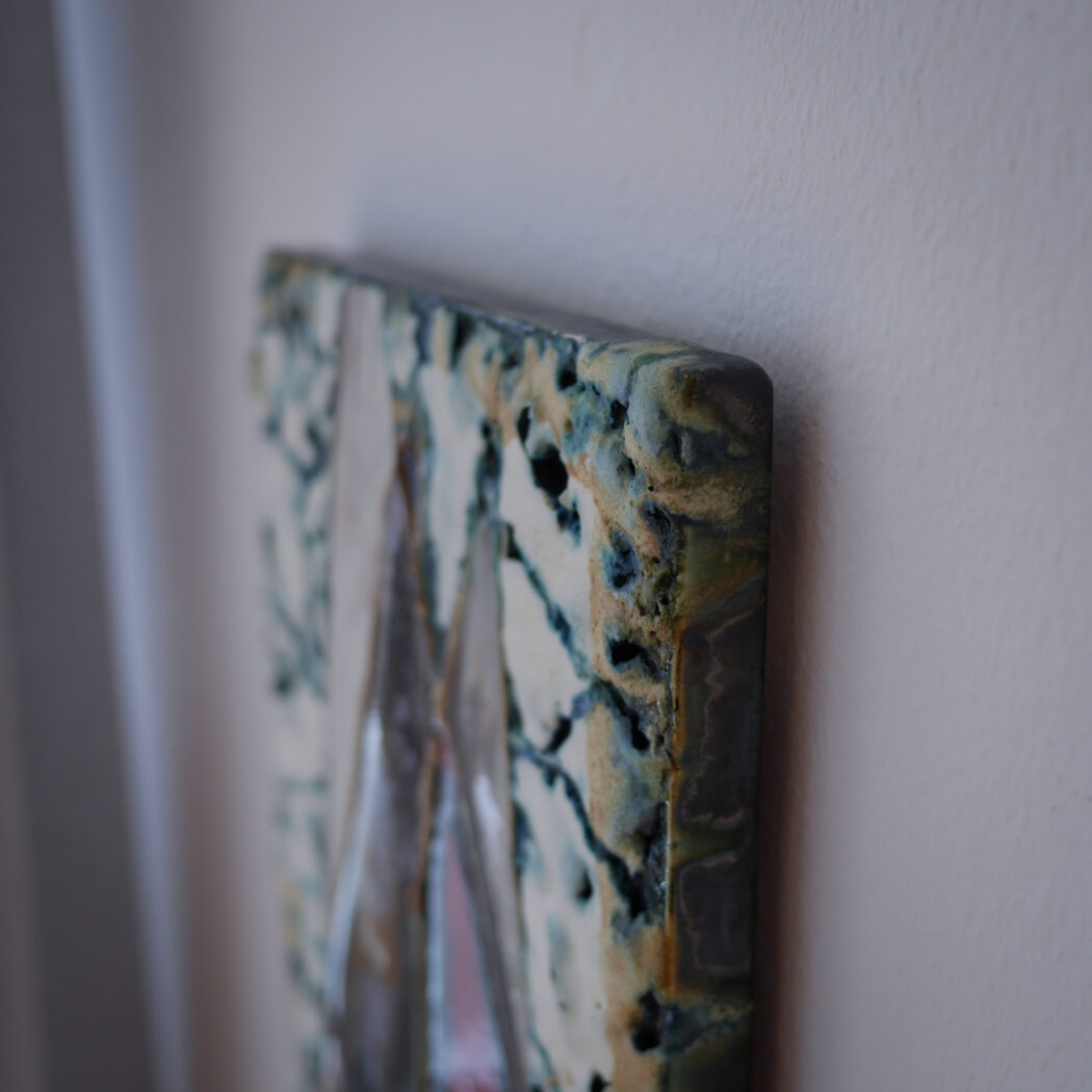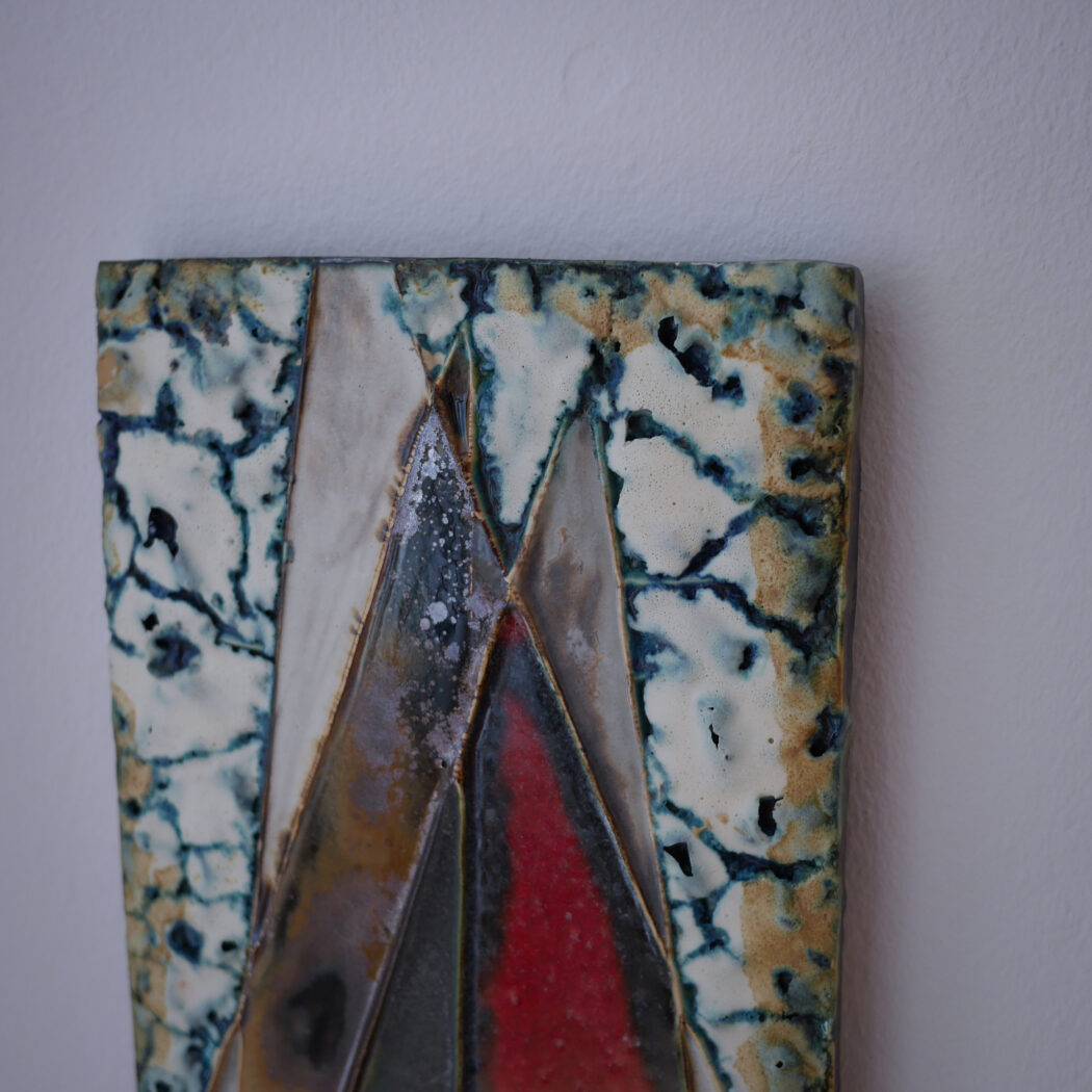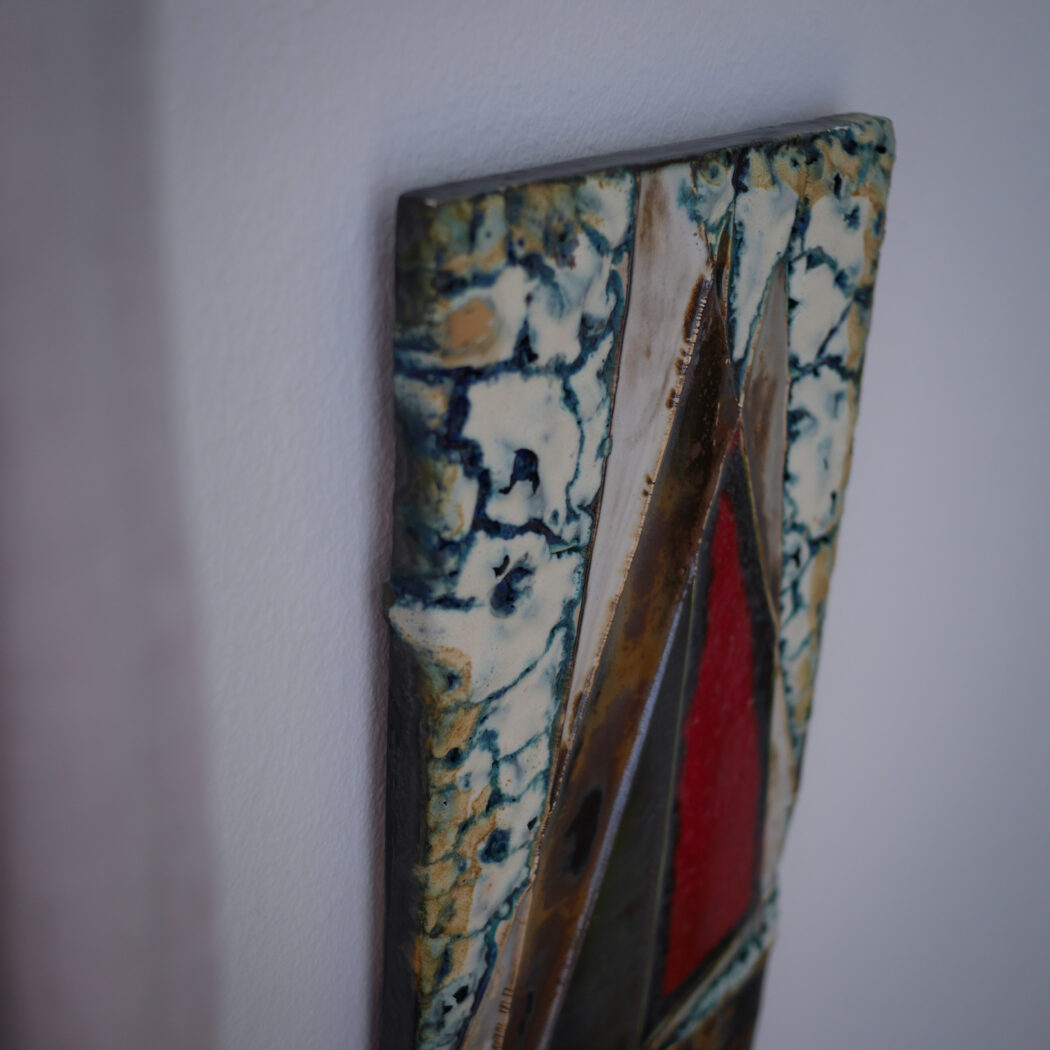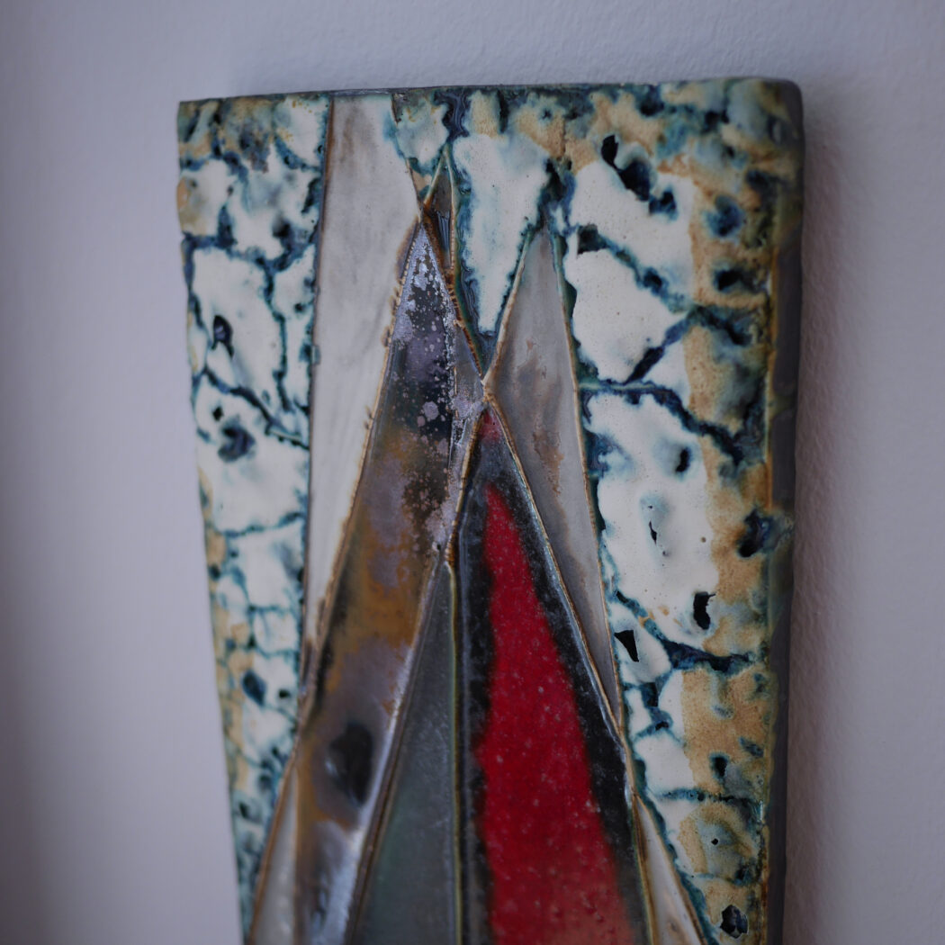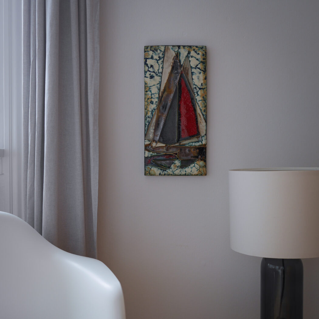 Et utrolig flot højt relief med skibsmotiv i de smukkeste nuancer. Relieffet er skabt på en måde, så det virkelig træder frem på væggen – kæmpe blikfang. Det røde og brune skib på den grønlige baggrund, så flot! Relieffet er fundet i Sverige.
