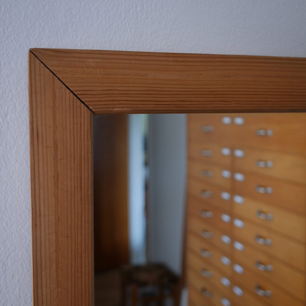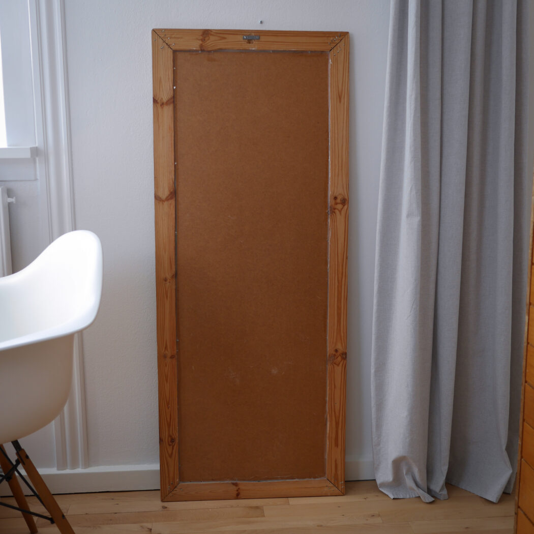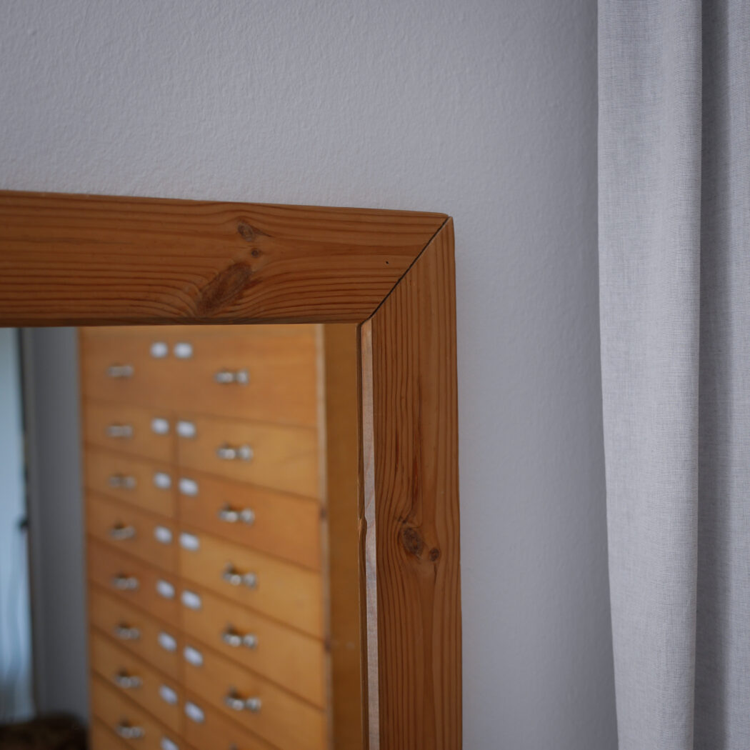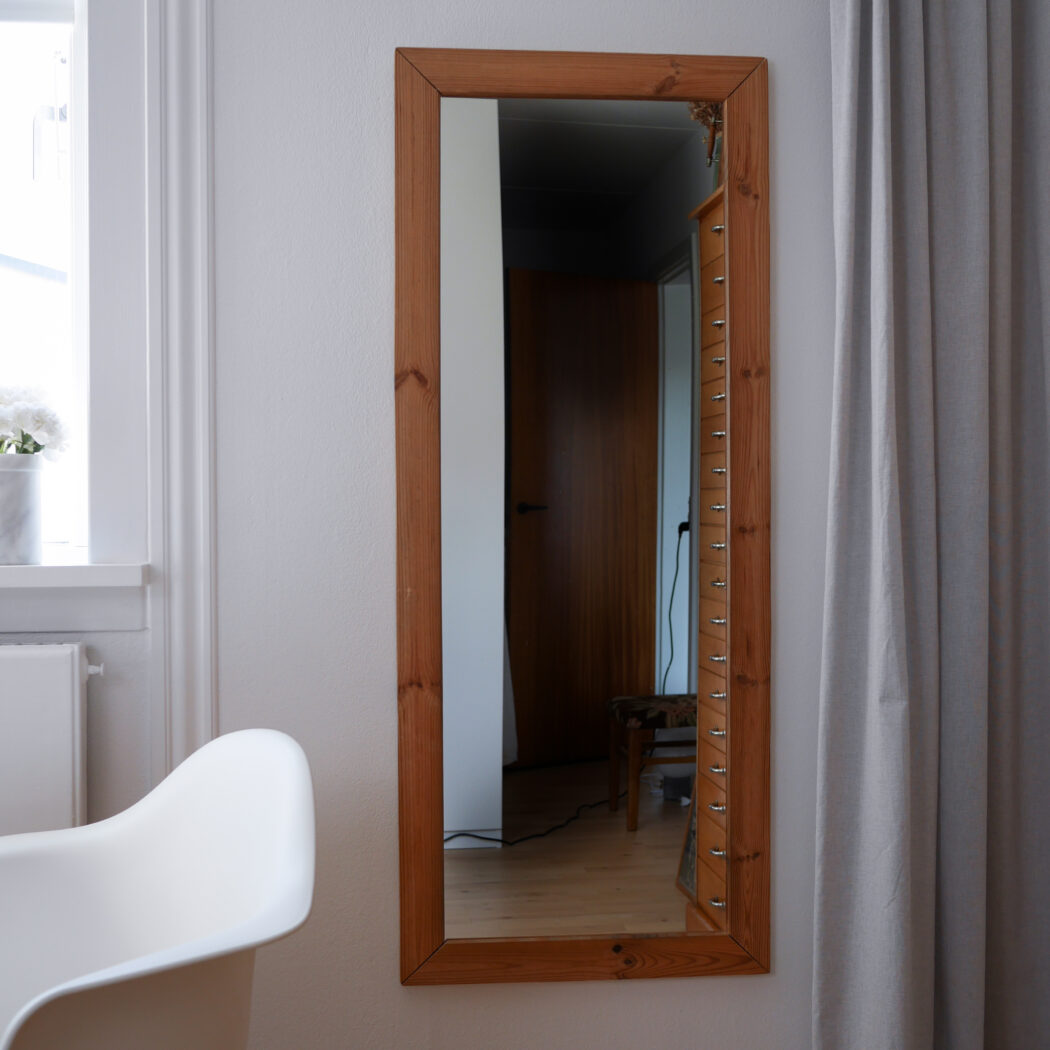 Et højt ældre spejl til væggen med en lys træramme i fyrretræ. En god størrelse, som kan vise kroppen i hel figur. Hæng det op på væggen eller lad det stå på gulvet – begge dele er flot! Et spejl i pæn stand fra Sverige.