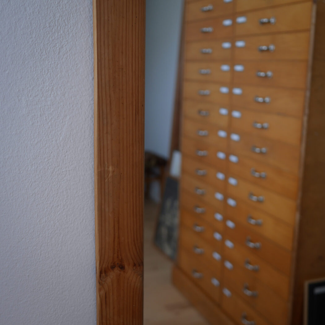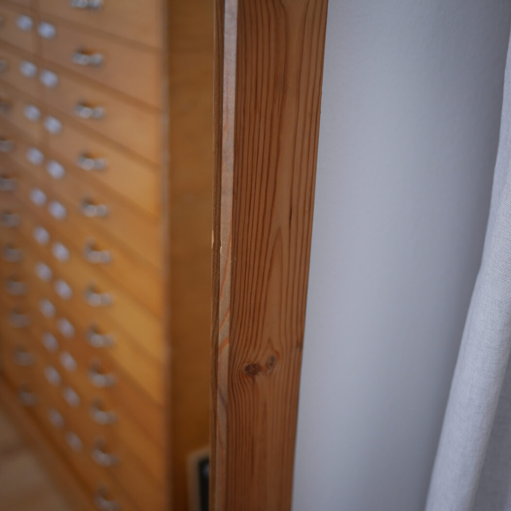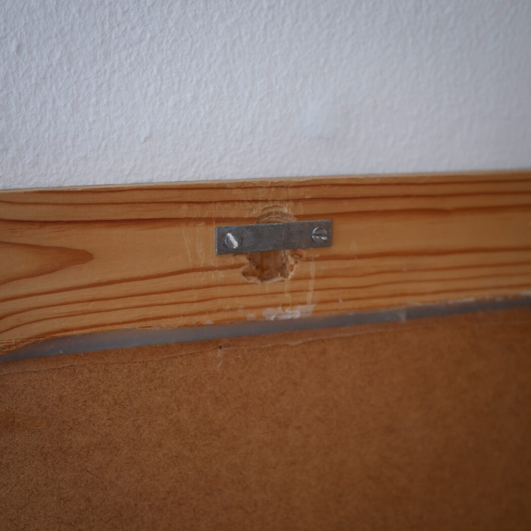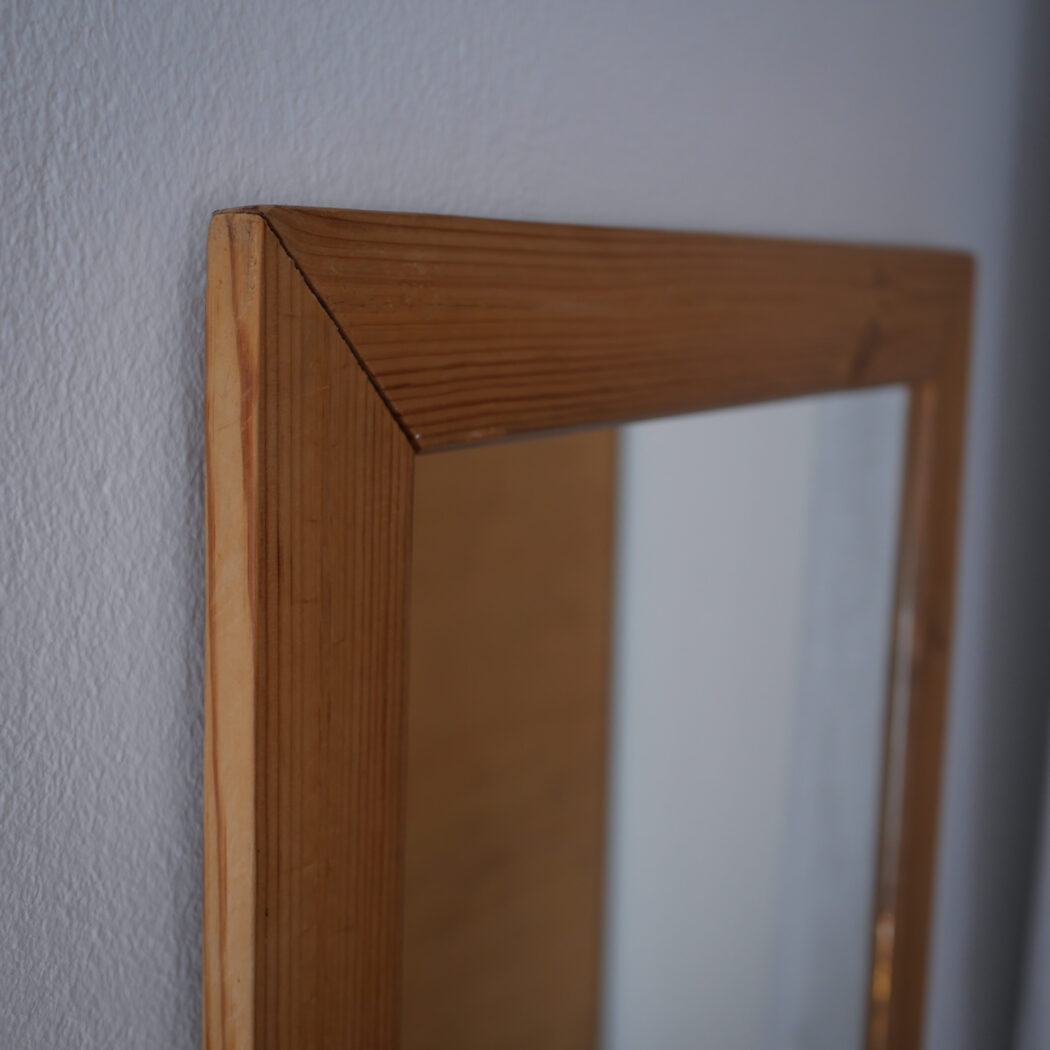 Et højt ældre spejl til væggen med en lys træramme i fyrretræ. En god størrelse, som kan vise kroppen i hel figur. Hæng det op på væggen eller lad det stå på gulvet – begge dele er flot! Et spejl i pæn stand fra Sverige.