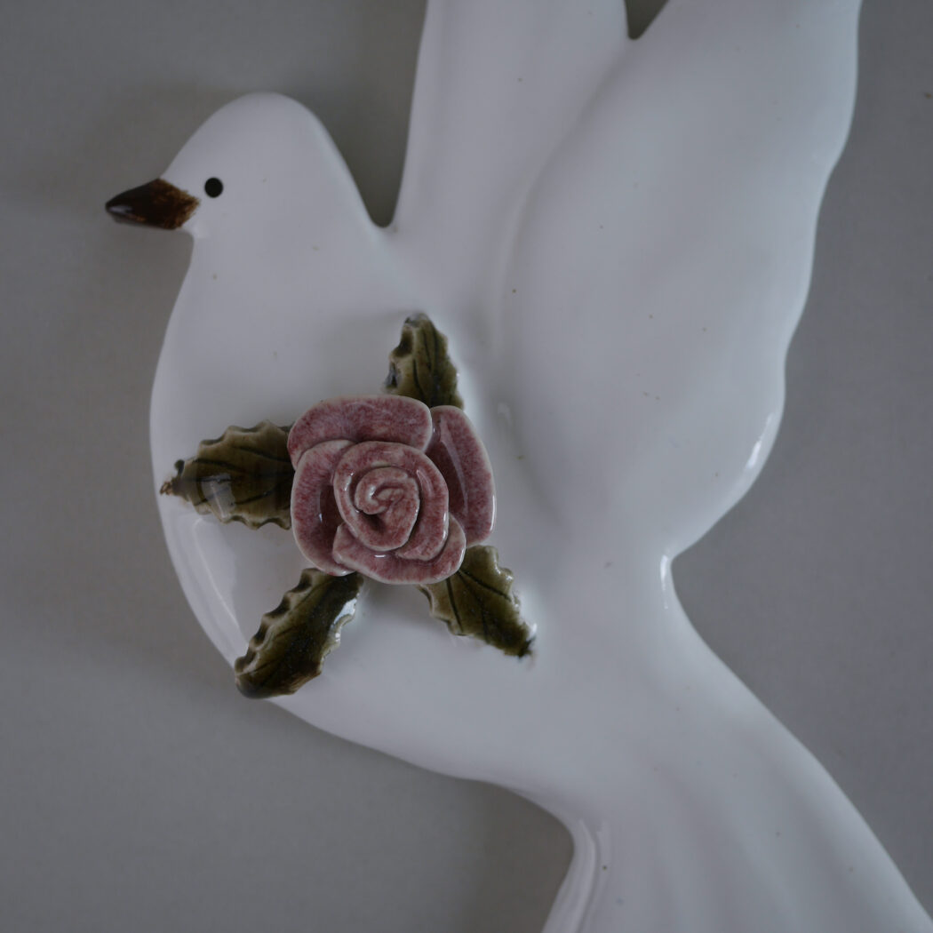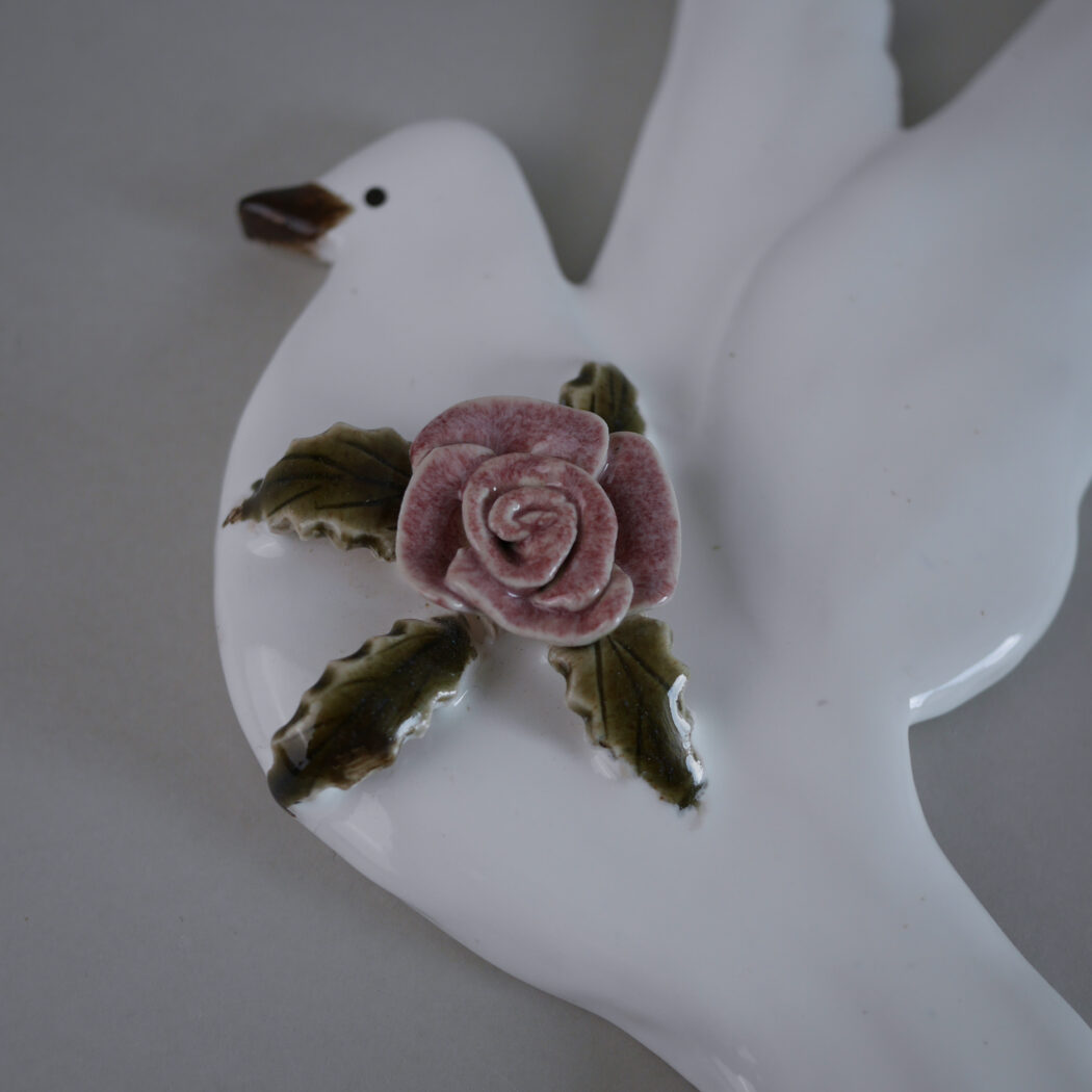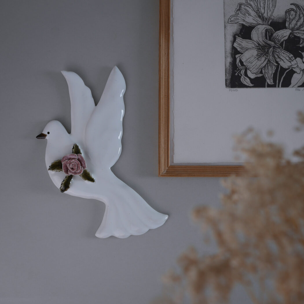 En fin stor hvid due i keramik med en lyserød rose. Sød og dekorativ på væggen – den perfekte lille detalje. Et fund fra Sverige. Vægophæng medfølger.
