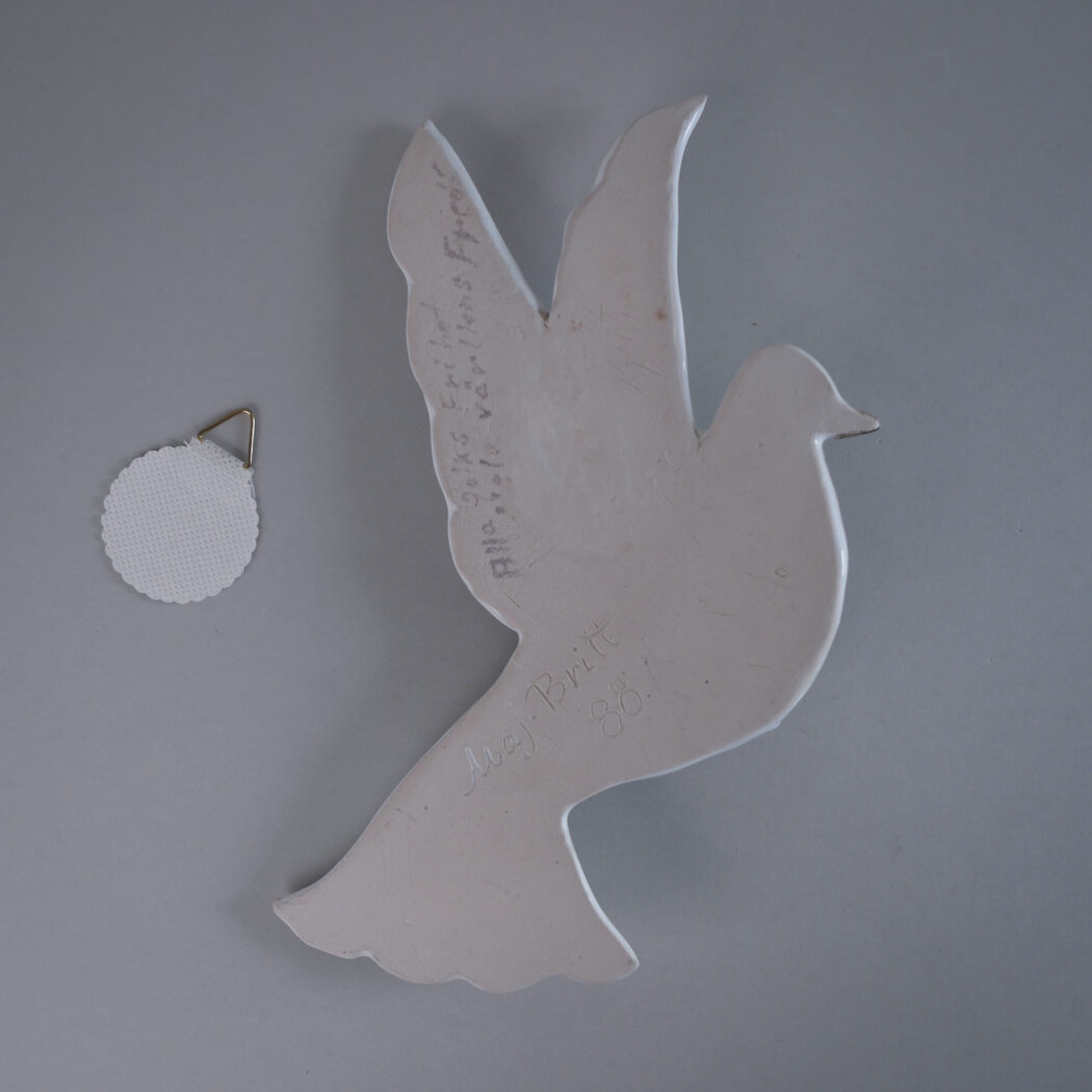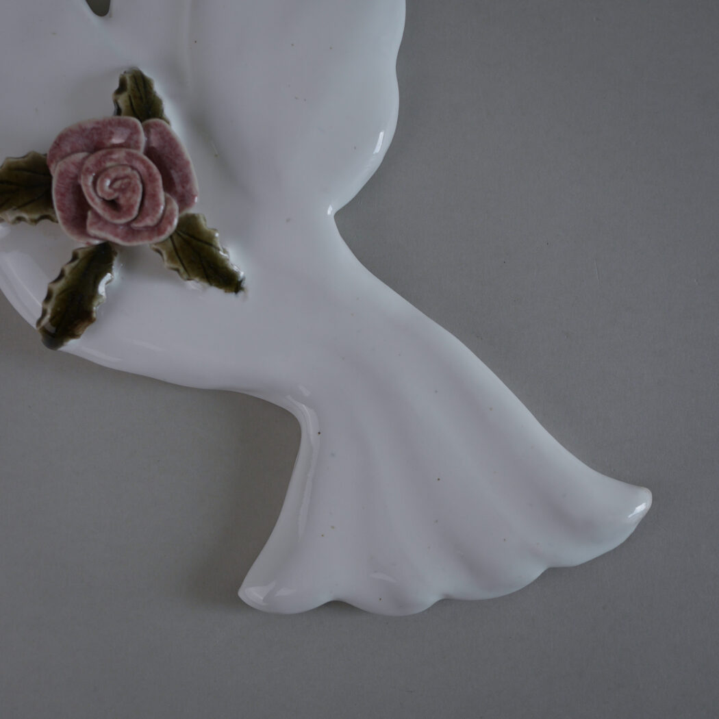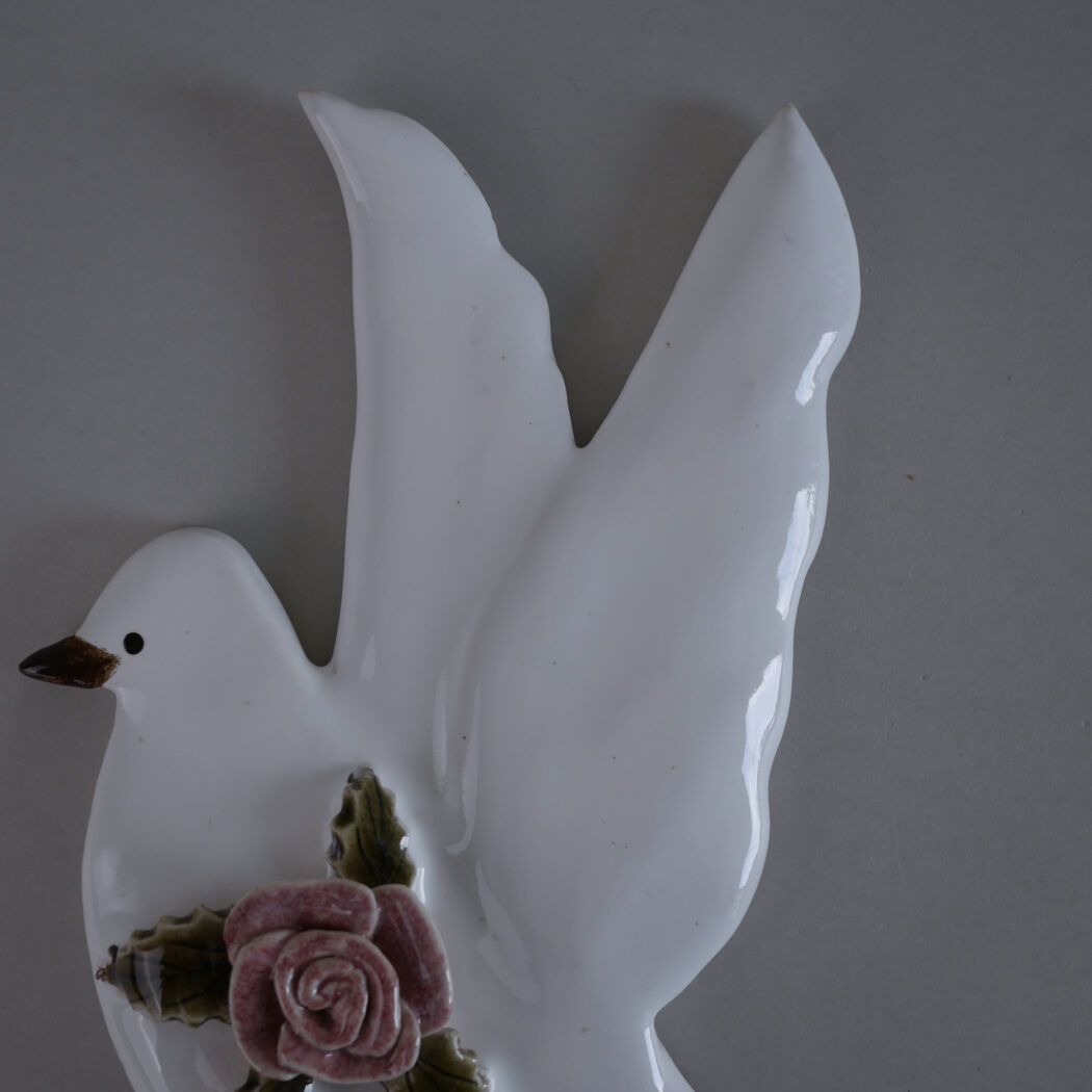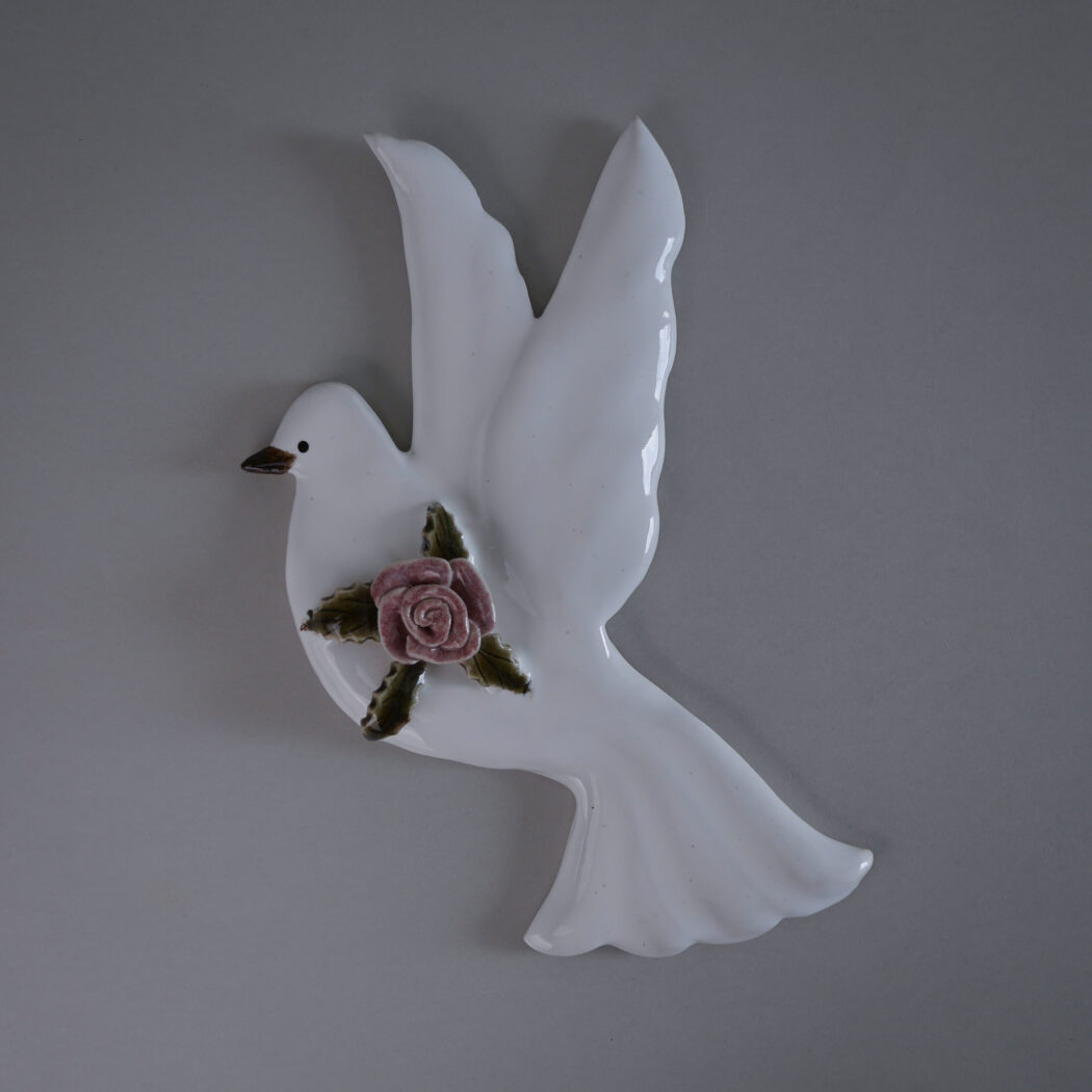En fin stor hvid due i keramik med en lyserød rose. Sød og dekorativ på væggen – den perfekte lille detalje. Et fund fra Sverige. Vægophæng medfølger.